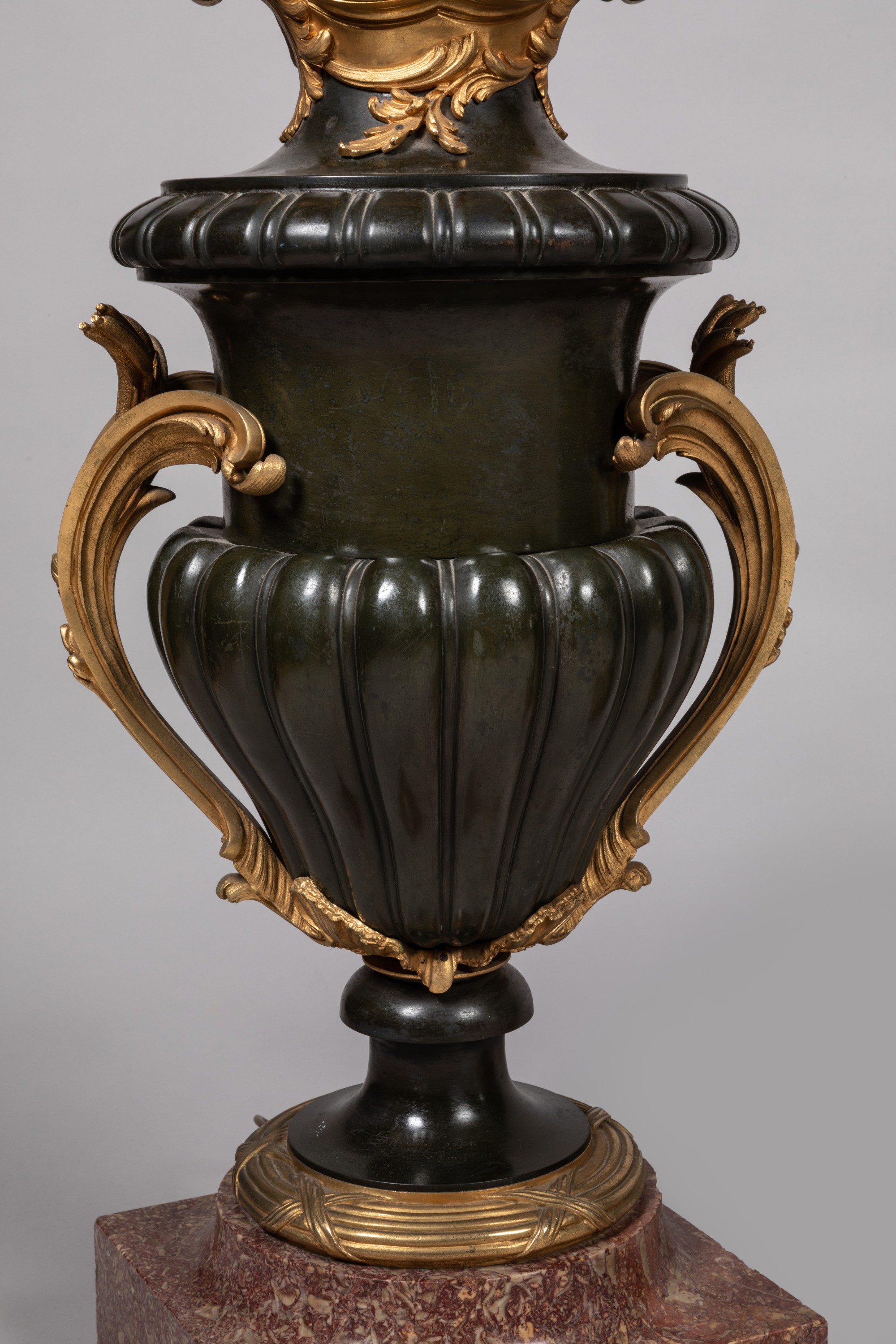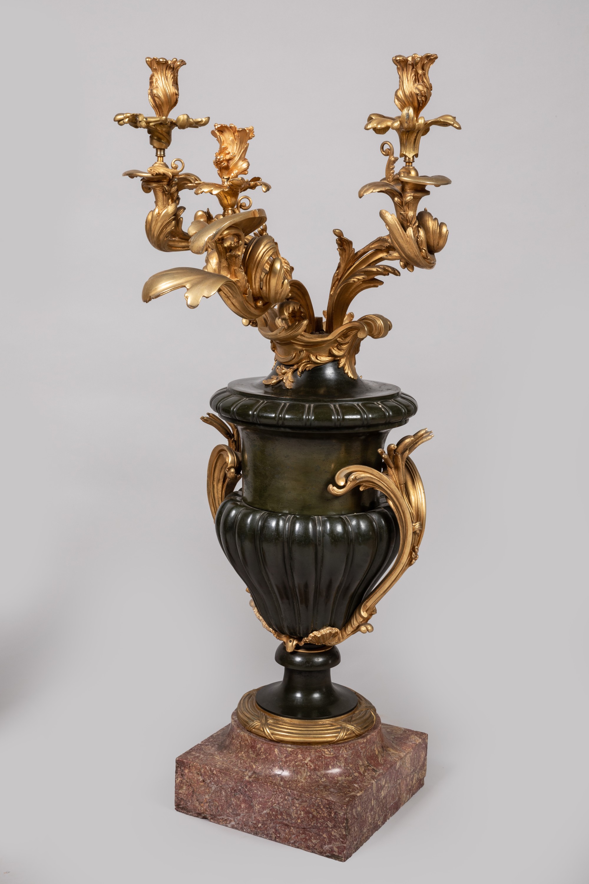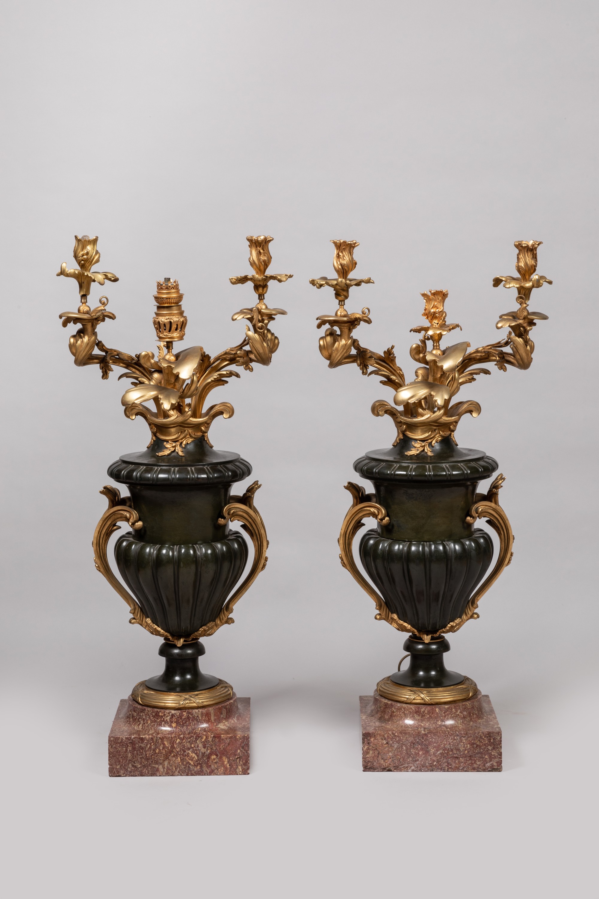 Paire de vases Médicis couverts en bronze doré et tôle à patine verte. Ils présentent trois bras de lumières ornés de larges motifs de feuilles d'acanthe mouvementées et enroulées. Les binets et bobèches sont ornés de feuillage stylisé. Le couvercle à motif de larges godrons se prolonge sur la panse. Deux anses sur les côtés rejoignent le pied à décor de cinq contours qui repose sur une base en marbre rouge du Maine. L'un marqué "VIAN" sur le prolongement d'un bras de lumière.