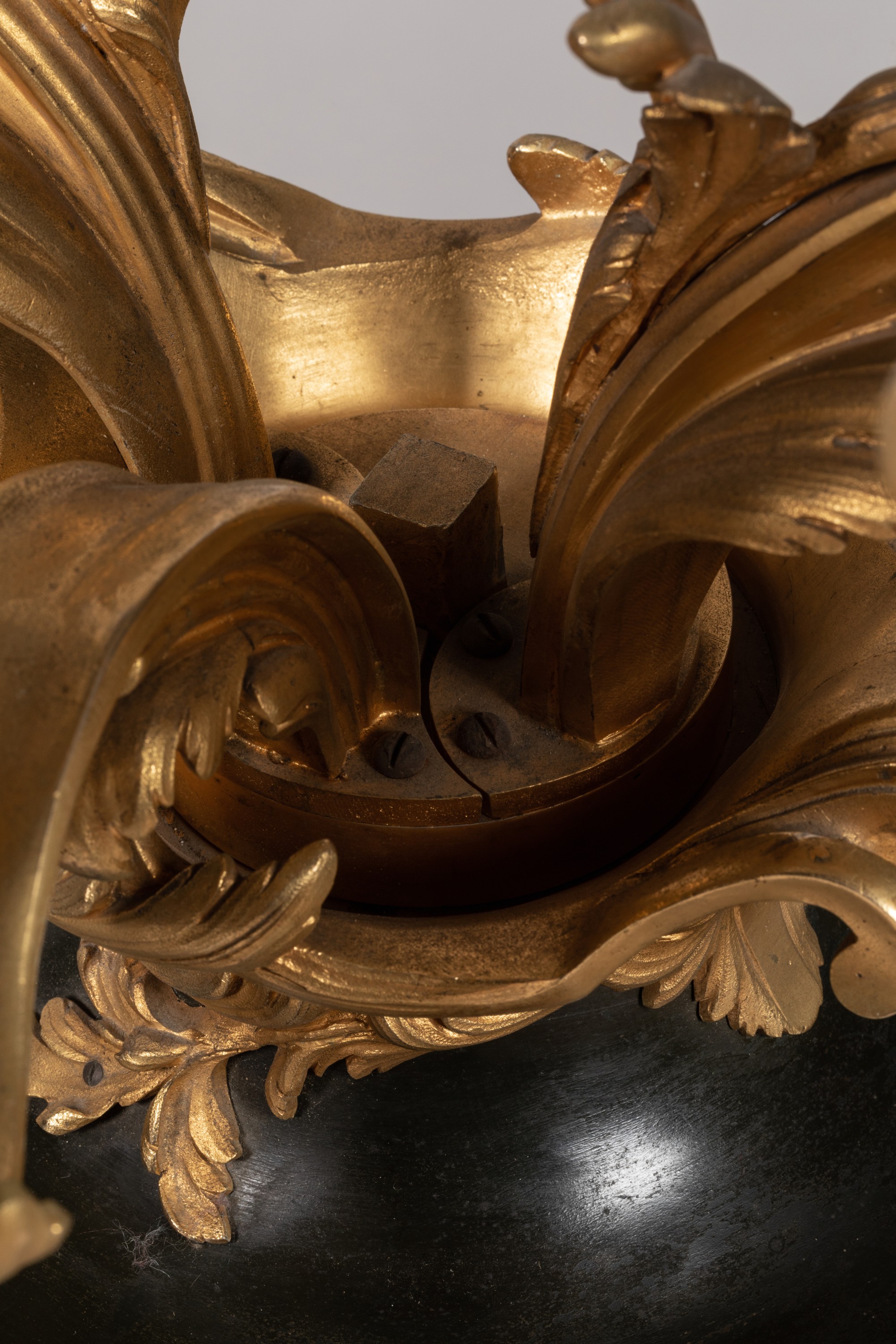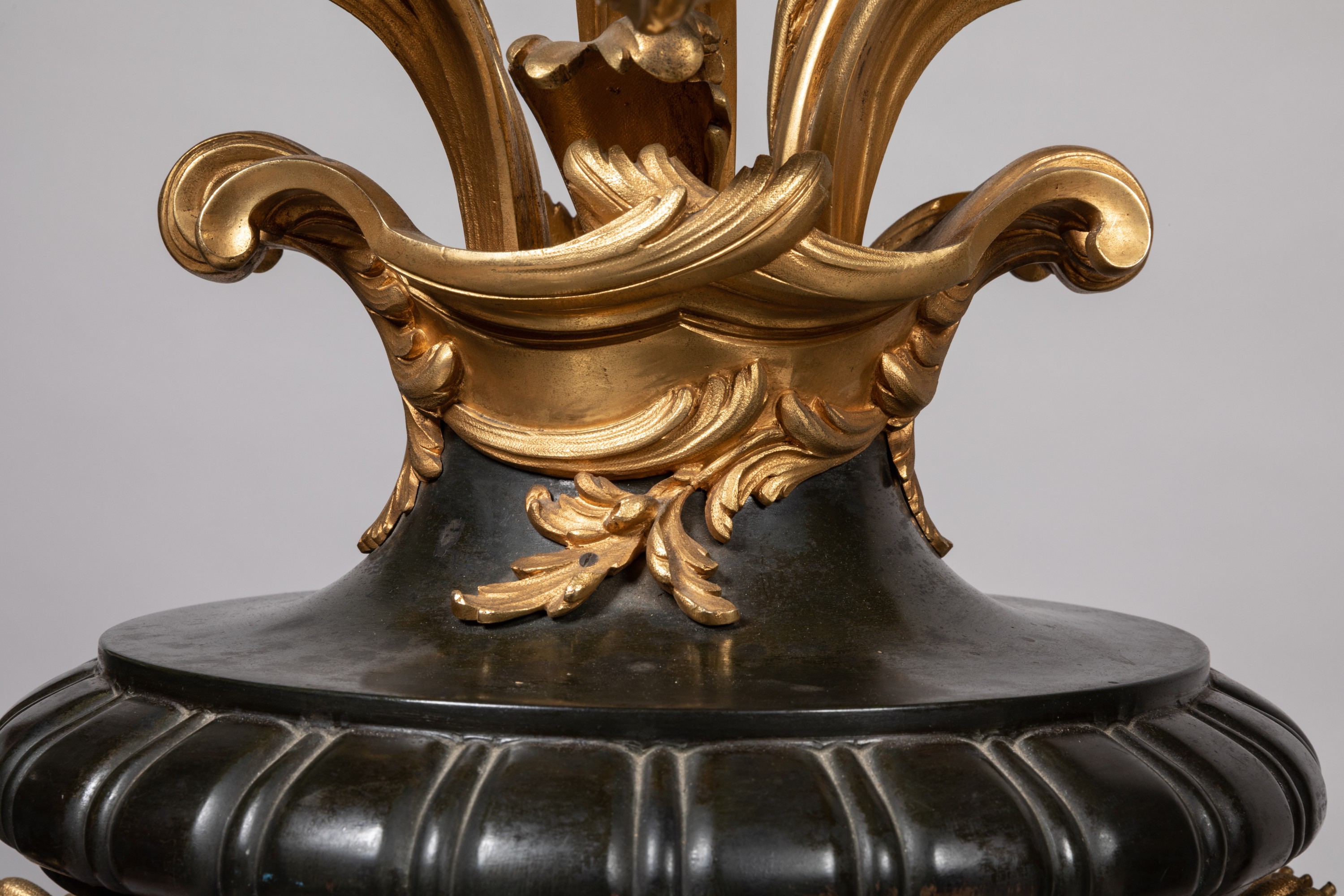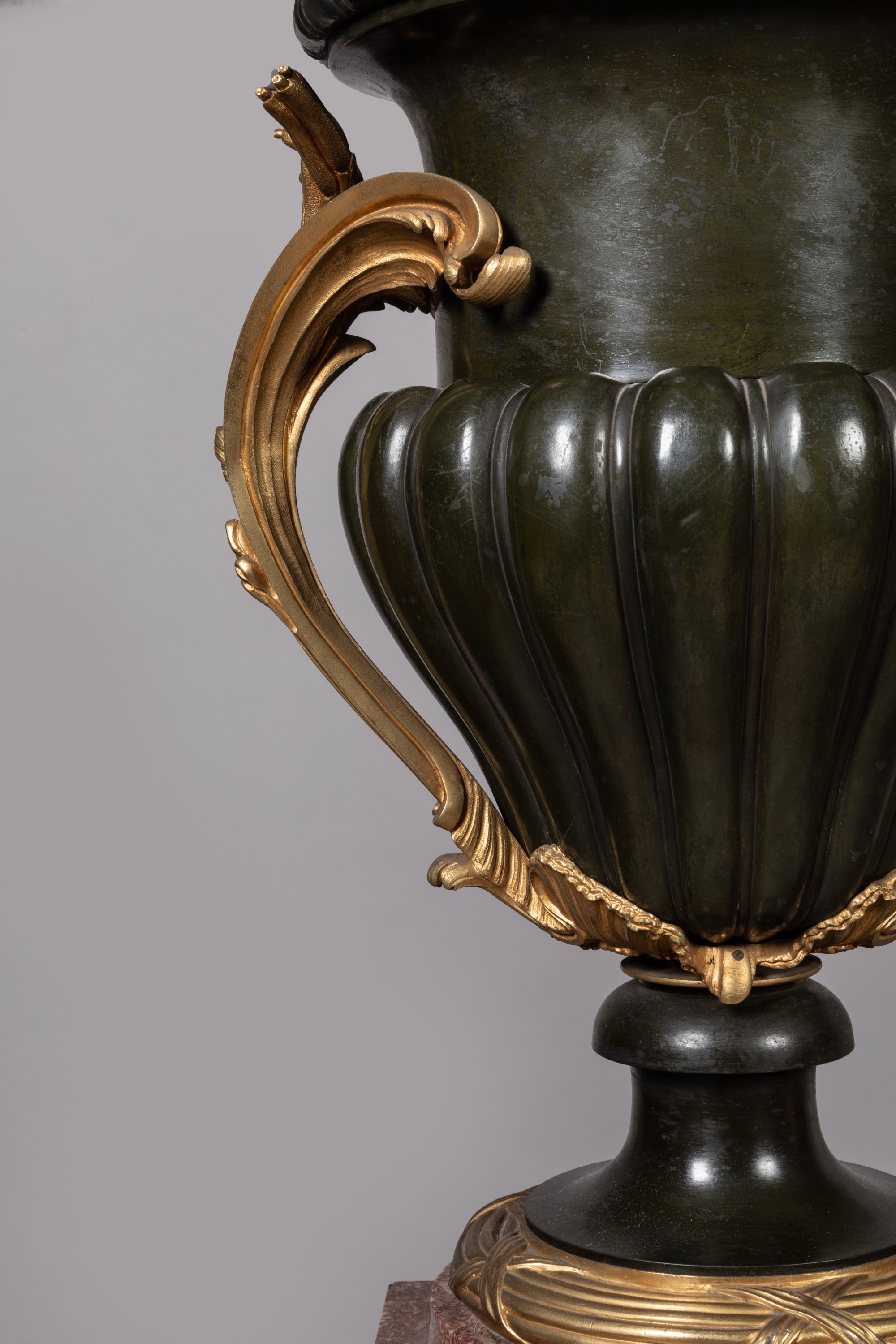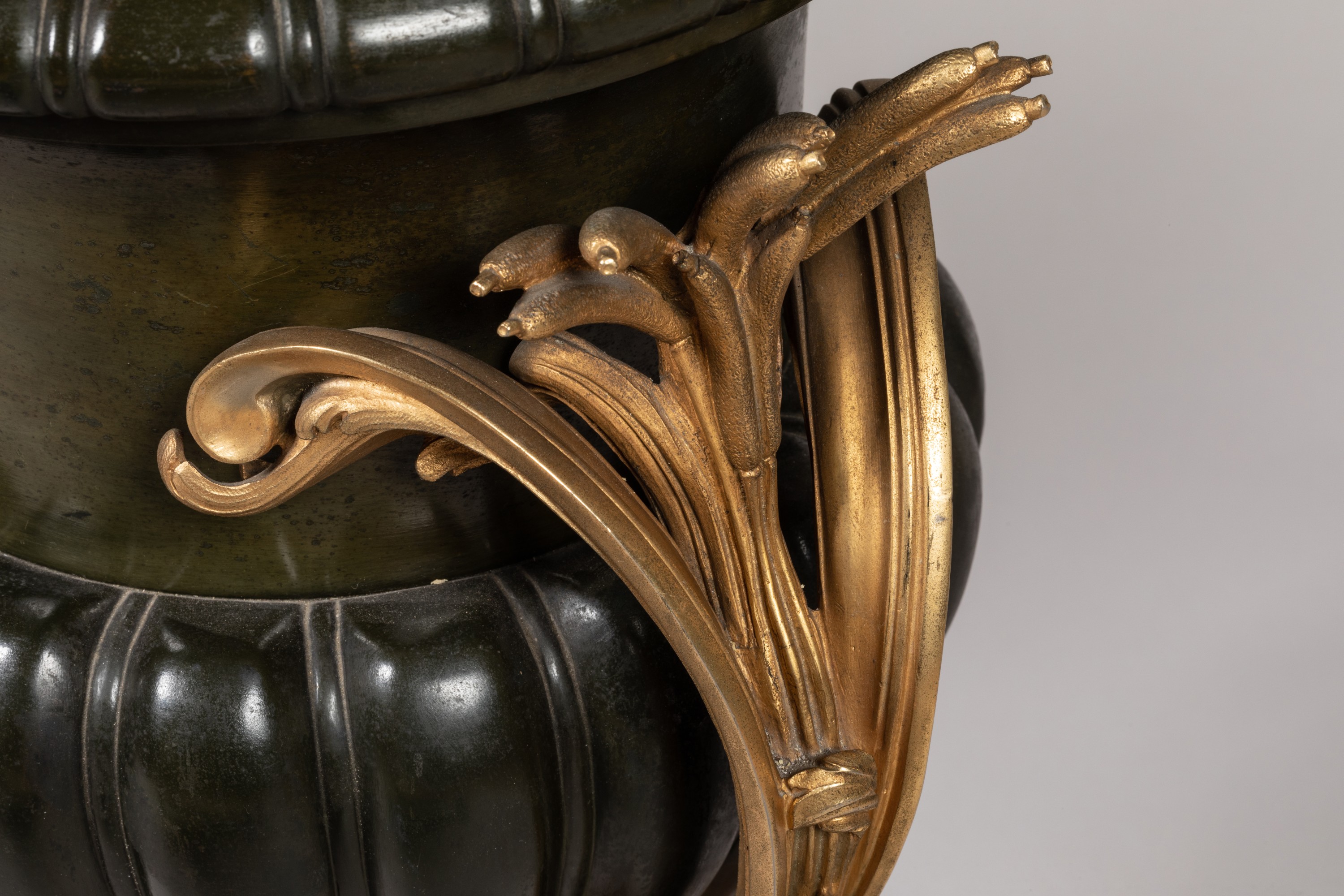 Paire de vases Médicis couverts en bronze doré et tôle à patine verte. Ils présentent trois bras de lumières ornés de larges motifs de feuilles d'acanthe mouvementées et enroulées. Les binets et bobèches sont ornés de feuillage stylisé. Le couvercle à motif de larges godrons se prolonge sur la panse. Deux anses sur les côtés rejoignent le pied à décor de cinq contours qui repose sur une base en marbre rouge du Maine. L'un marqué "VIAN" sur le prolongement d'un bras de lumière.