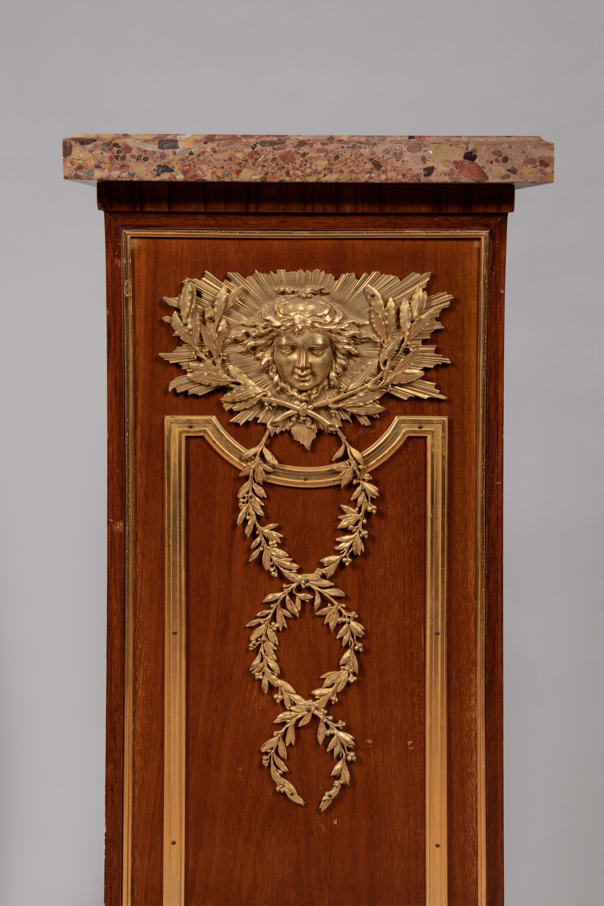 Paire de gaines de forme quadrangulaire en placage de satiné et bois de rose. Très riche ornementation de bronzes dorés sur toutes les faces. Sur chacune d'elles, des moulures en bronze doré entourent des appliques figurant des têtes d'Apollon sur fond de rayons de soleil cerclés d'une couronne de branches de laurier. Celle-ci se prolonge en dessous pour former trois couronnes successives. Le pied est formé par une plinthe surmontée d'une moulure en bronze doré avec une baguette de placage peinte en vert. Le dessus est couvert d'un marbre brèche.