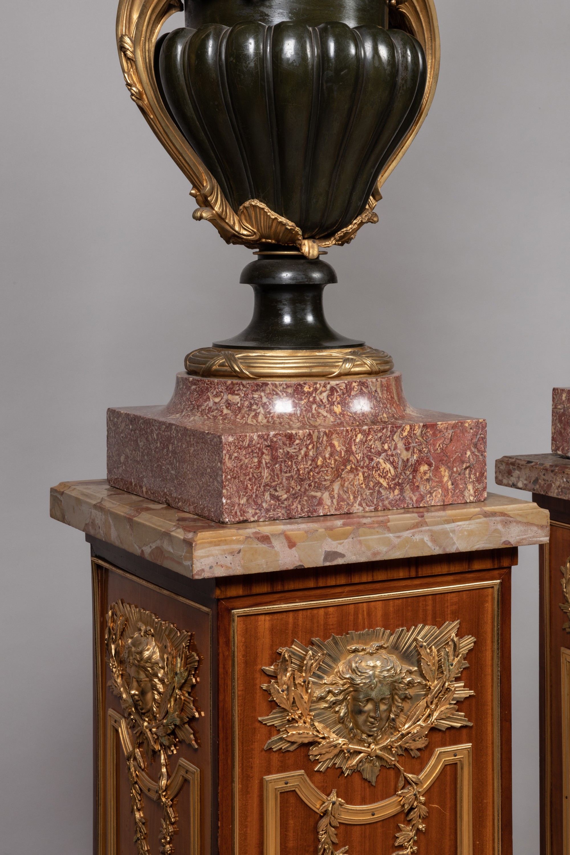 A pair of Louis XVI style satine and rosewood veneer pedestals sporting gilded bronze Medicis vases turned into candelabras. Rich bronze ornamentation and breche marble tops on the pedestals. Attributed to Vian, late 19th century.