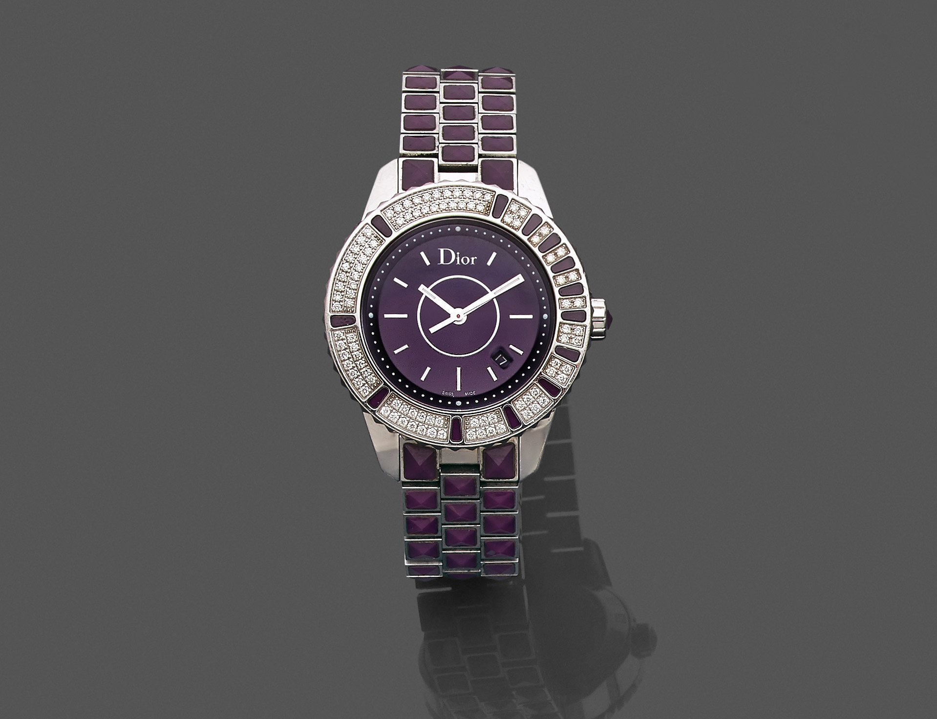 en acier. Lunette sertie de diamants. Boîtier rond, fermeture à vis. Cadran violet avec trotteuse centrale, index bâtons appliqués, minuterie et date à guichet.