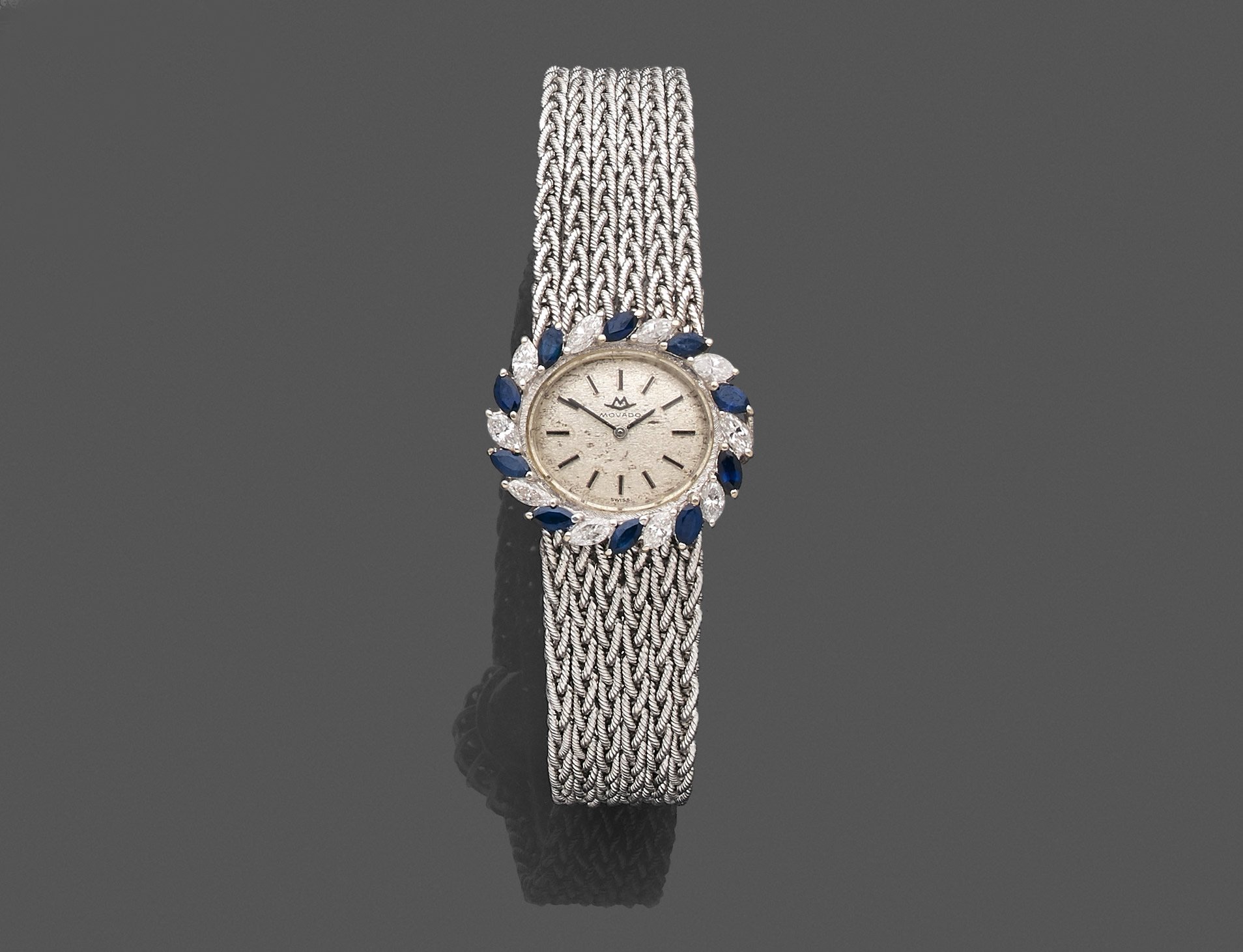 en or gris 750 millièmes, la montre de forme ovale, cadran émaillé gris, indexes bâtonnets pour les heures, le tour de lunette orné de saphirs, pierres bleues, et diamants de forme navette alternés, bracelet articulé tressé.