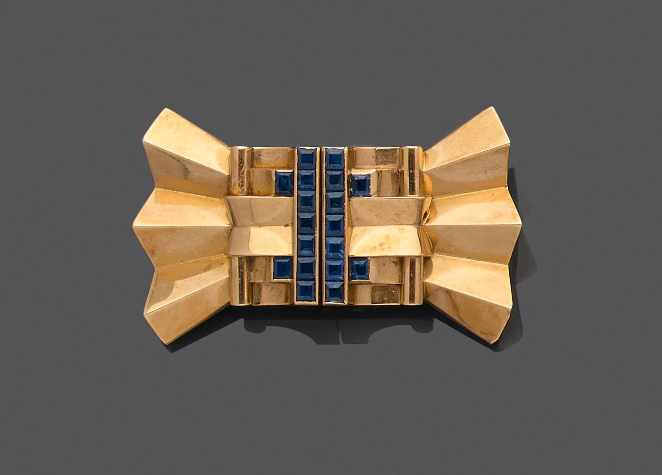 en or jaune 750 millièmes à décor de nuds et motifs géométriques, chacun orné de saphirs calibrés.