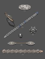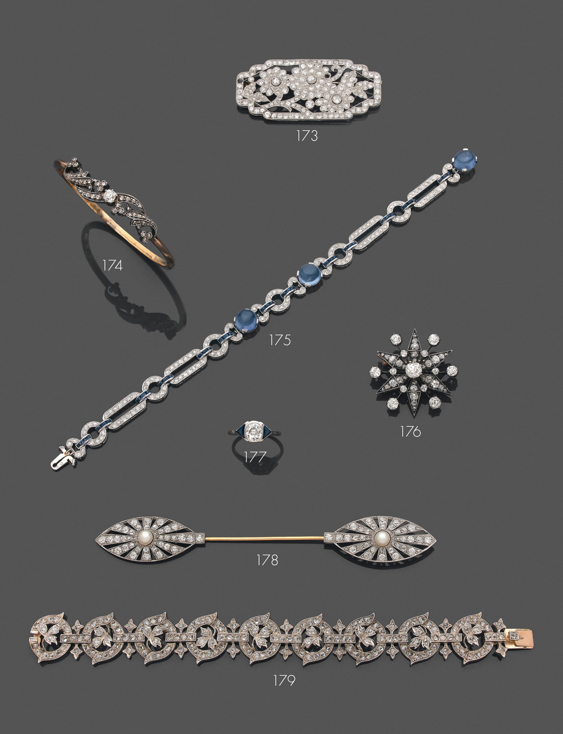 en platine 850 millièmes ornée au centre d'un diamant coussin de taille ancienne serti clos entre deux saphirs triangulaires.