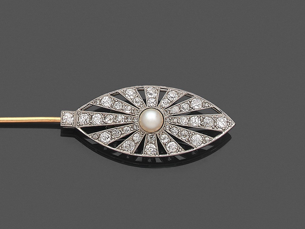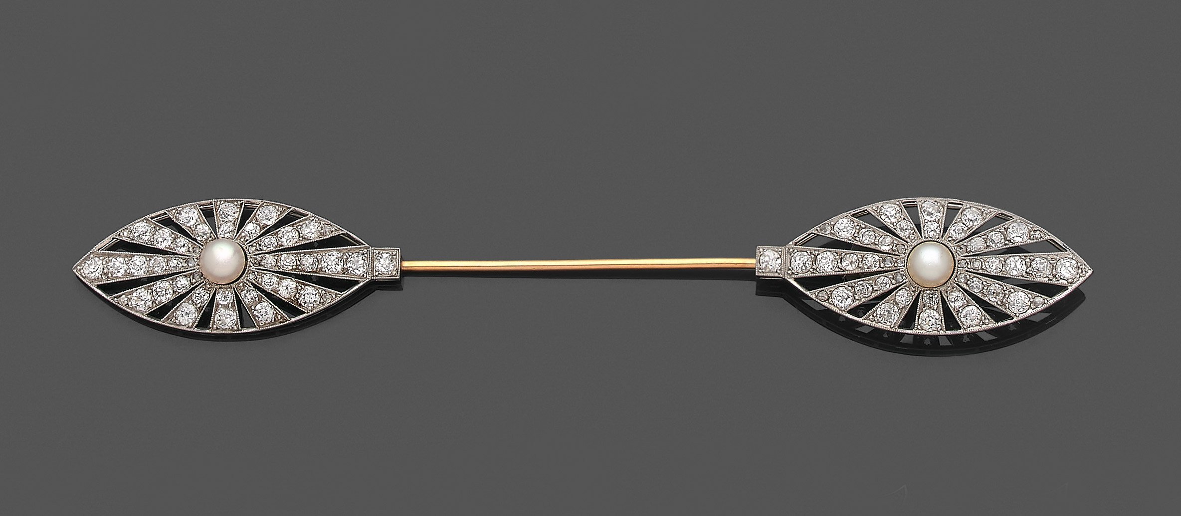 en platine 850 millièmes et or jaune 750 millièmes, les deux extrémités de forme navette en or gris 750 millièmes ajouré à décor rayonnant chacune ornée au centre d'une perle de culture ou perle fine entre des lignes de diamants ronds de taille ancienne en chute.