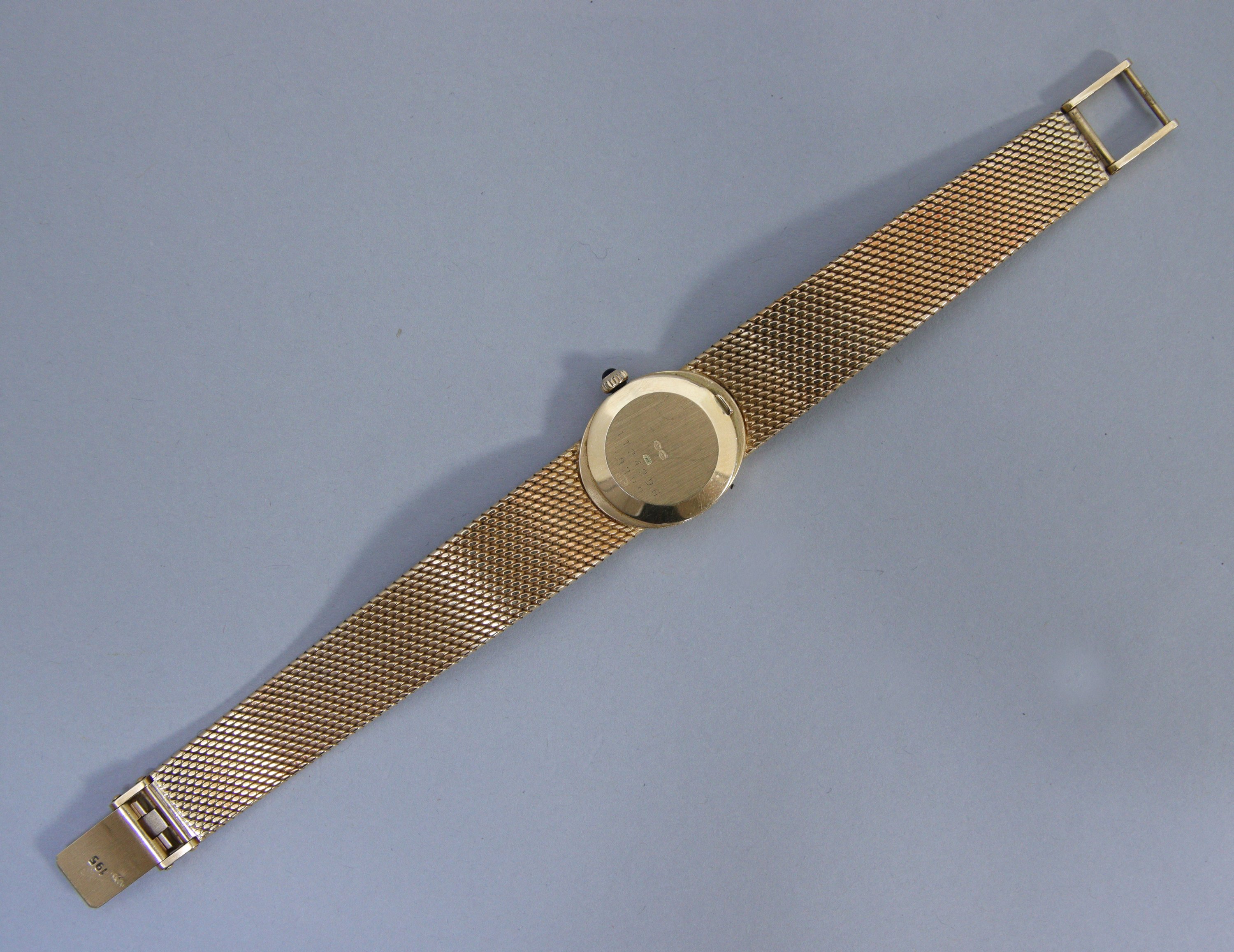 BAUME & MERCIER. MONTRE DE DAME en or jaune 750 millièmes, la montre de forme ovale, cadran émaillé jaune, indexes bâtonnets pour les heures, bracelet souple tressé en or gravé.