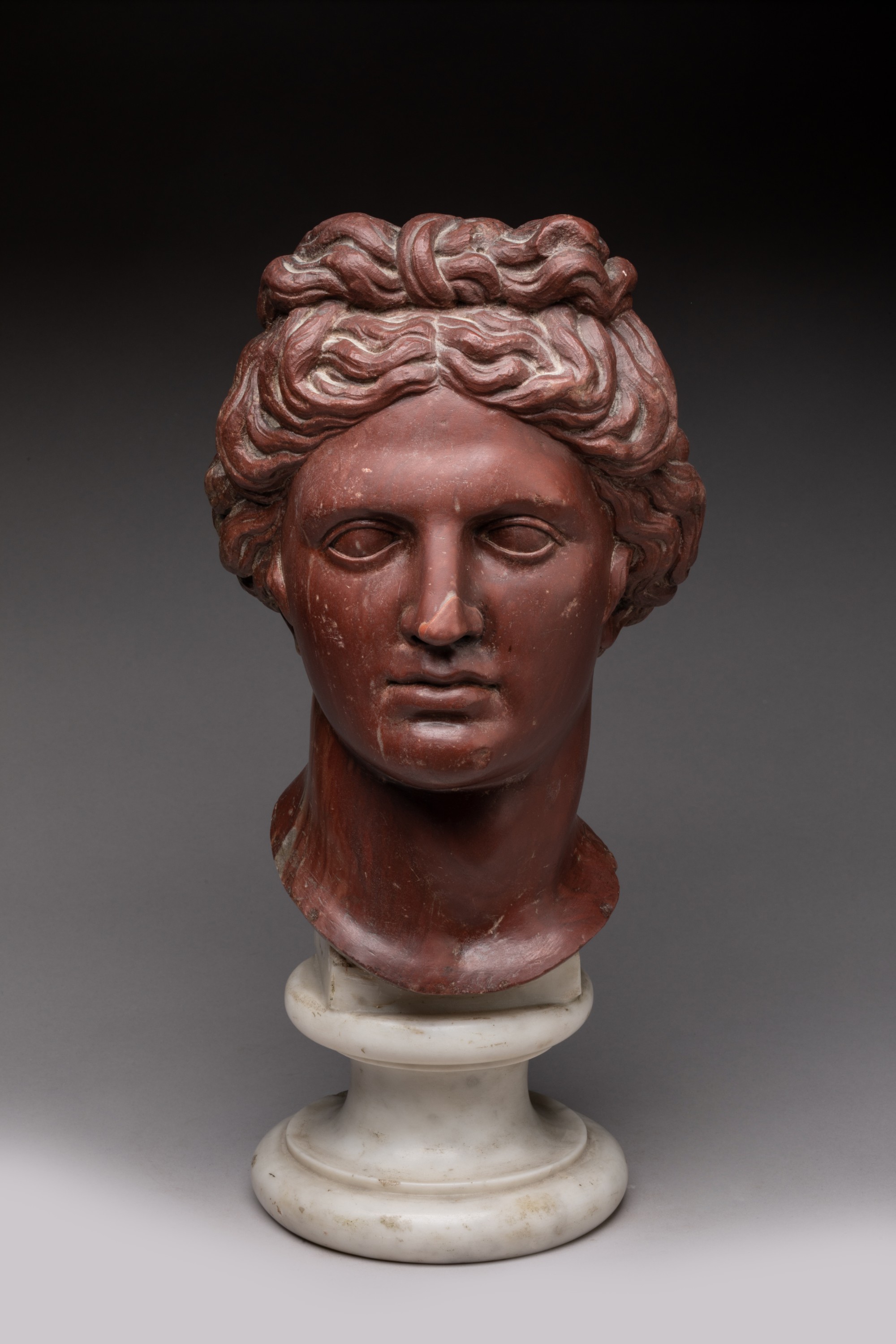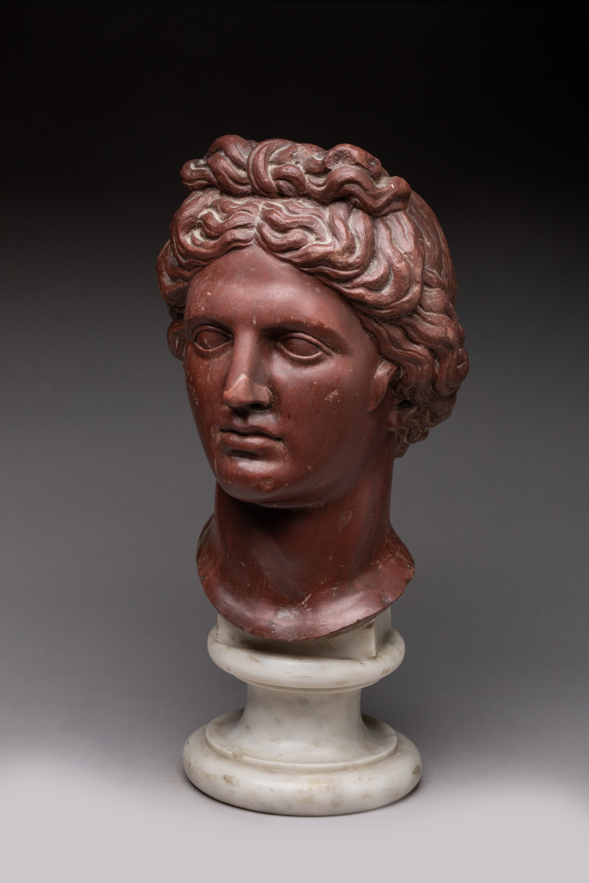 Marbre rosso antico, les cheveux noués au-dessus du front.