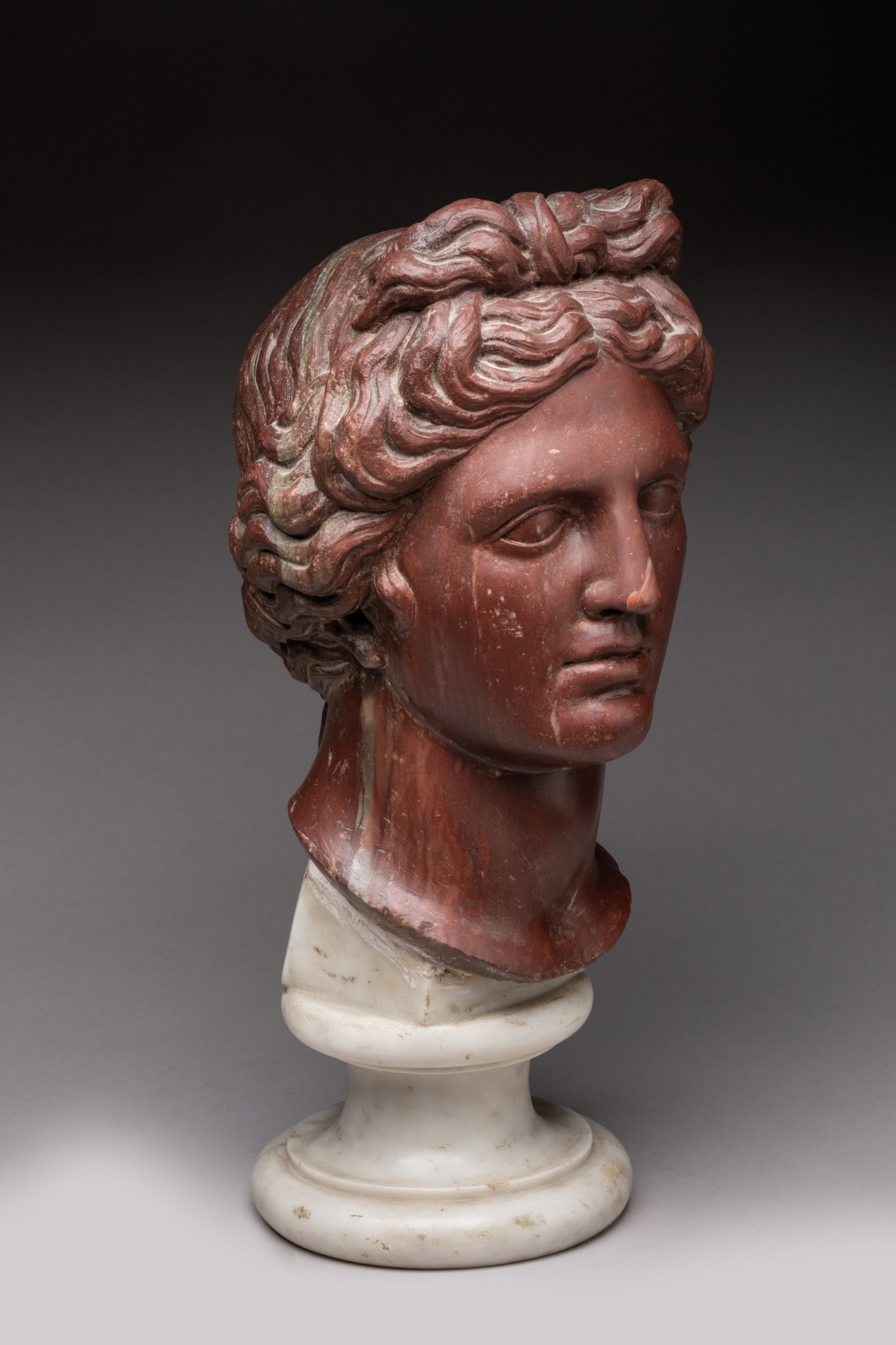An Italian rosso antico marble head of Apollo. Possibly 18th century on a subsequently added white marble pedestal.