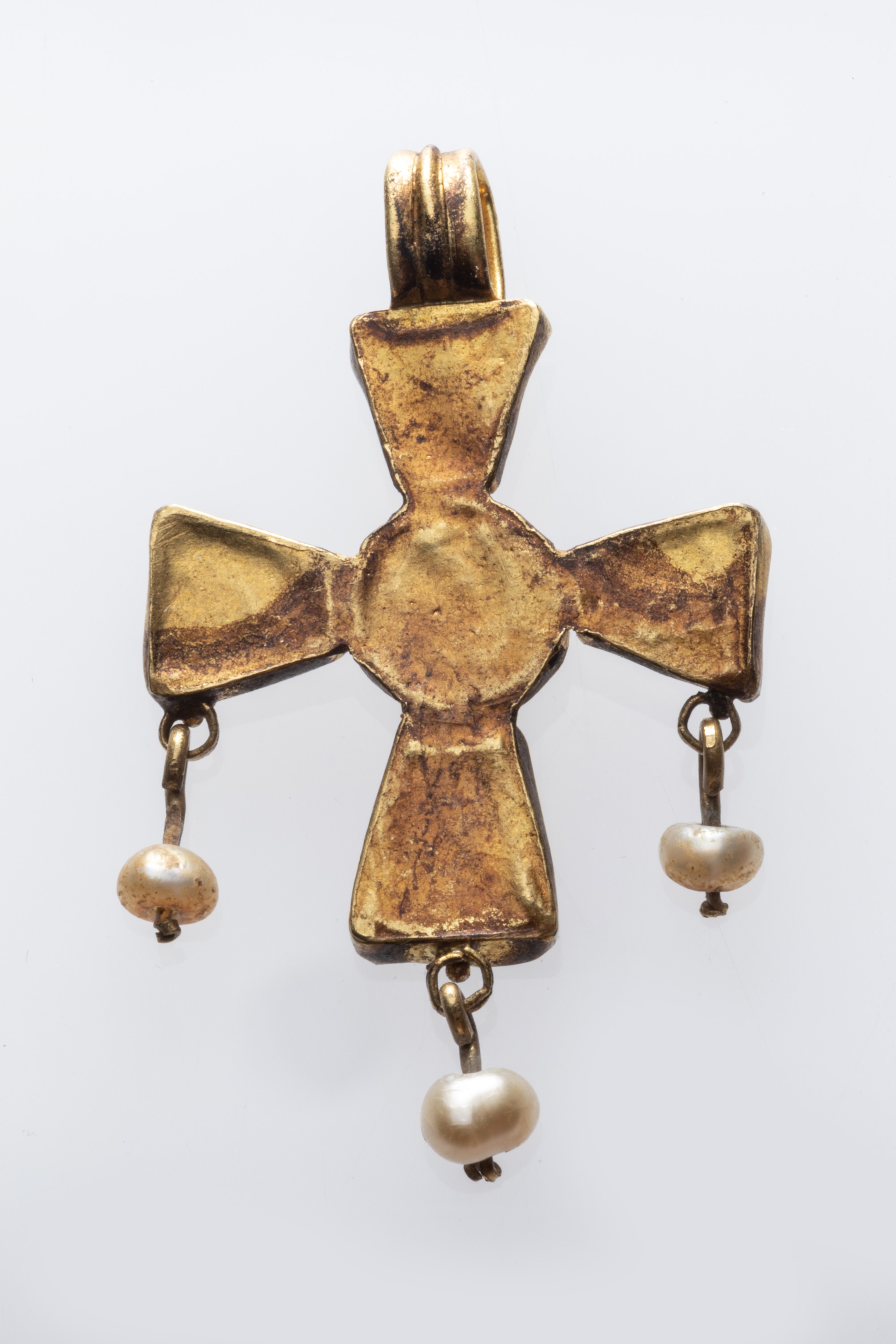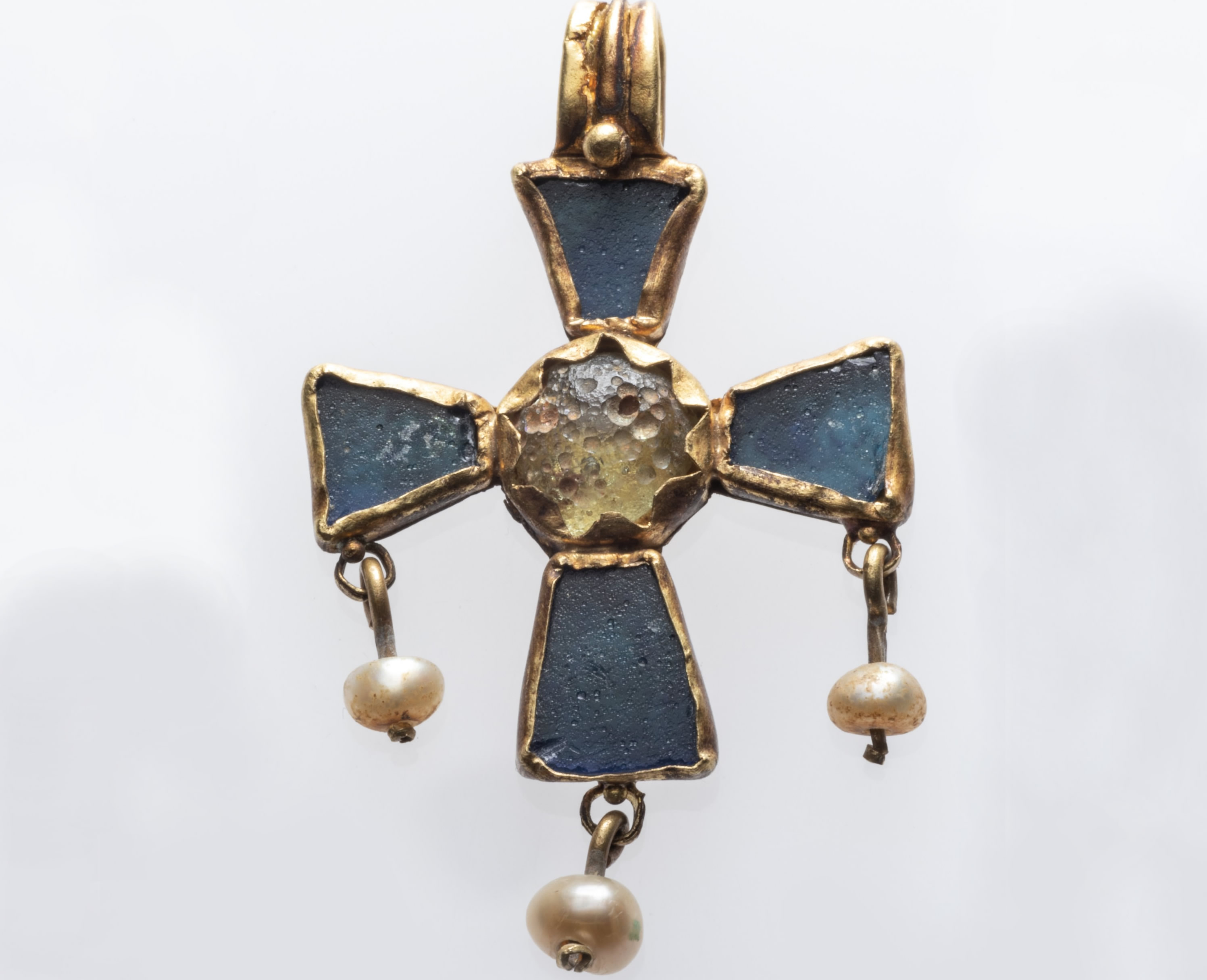 A Byzantine gold cross with glass and pearl pendants. Ca. 6th century A.D.