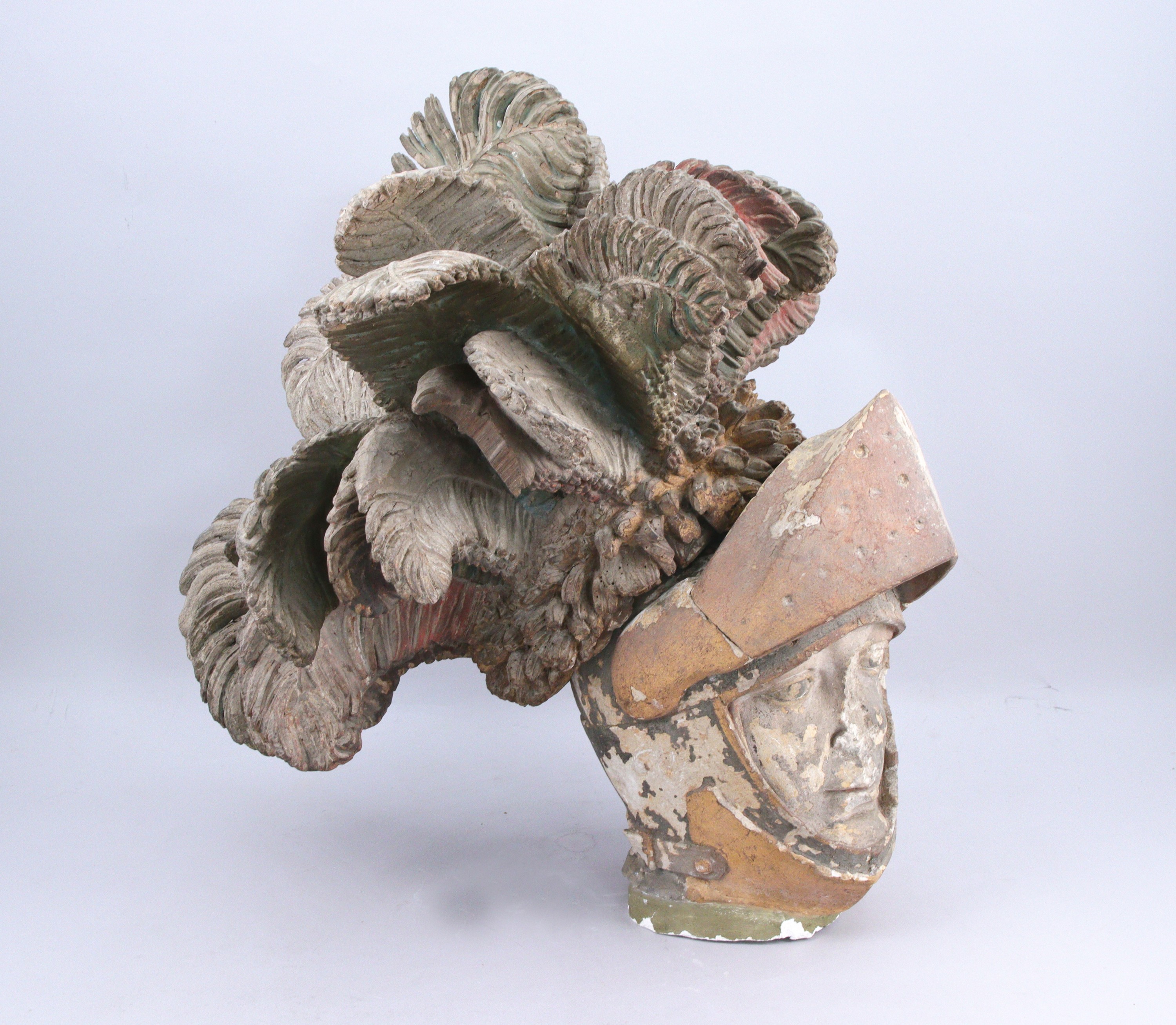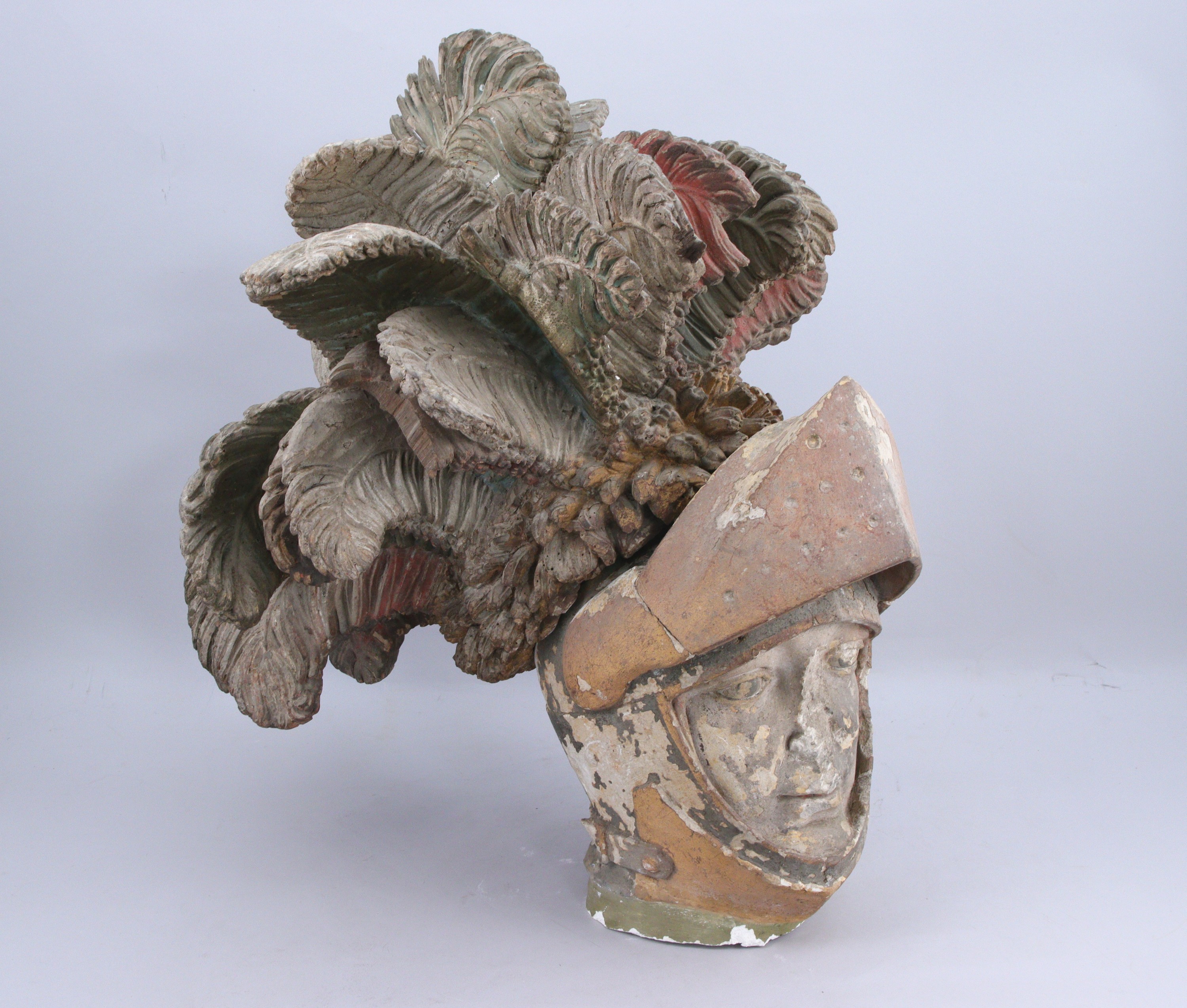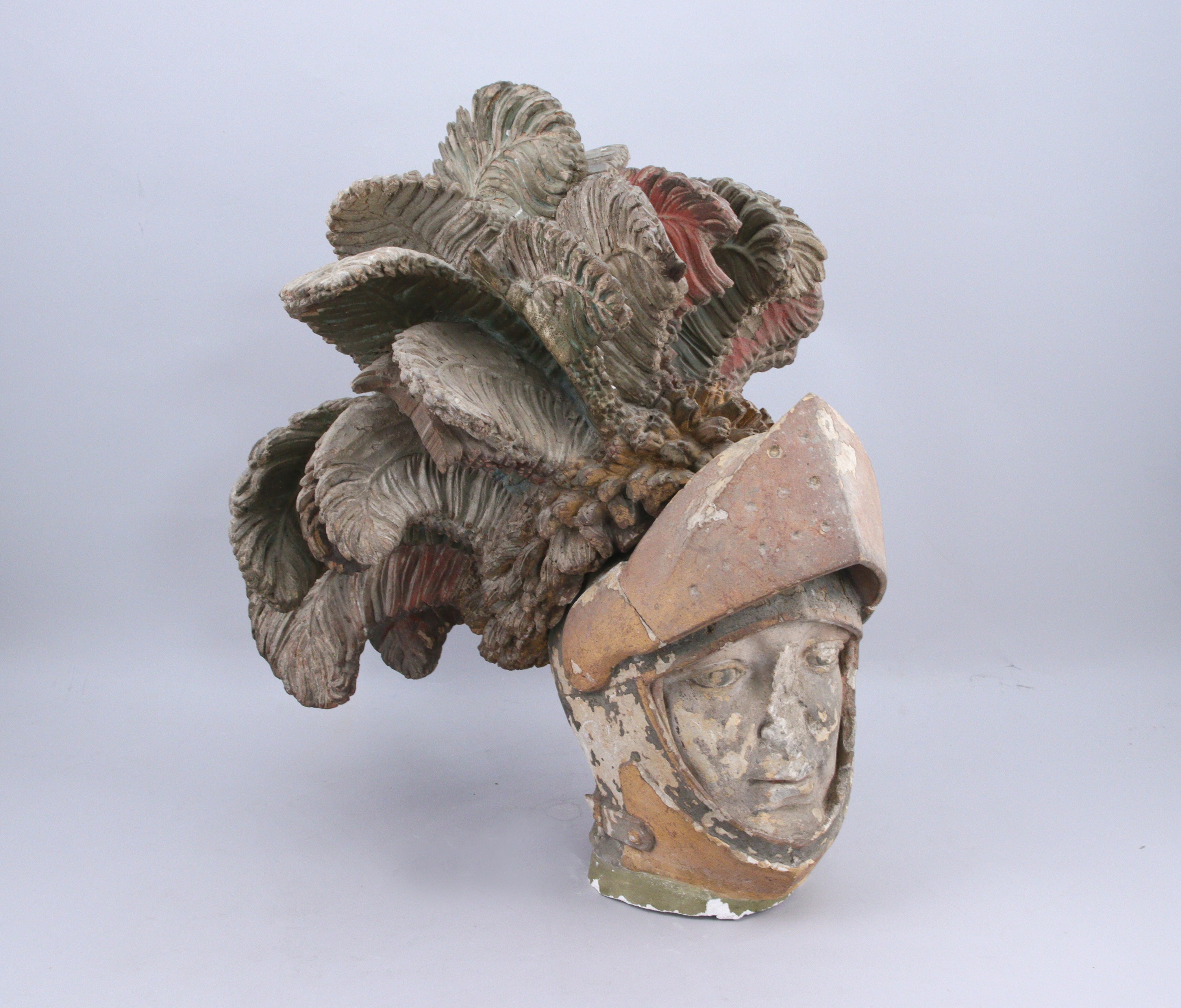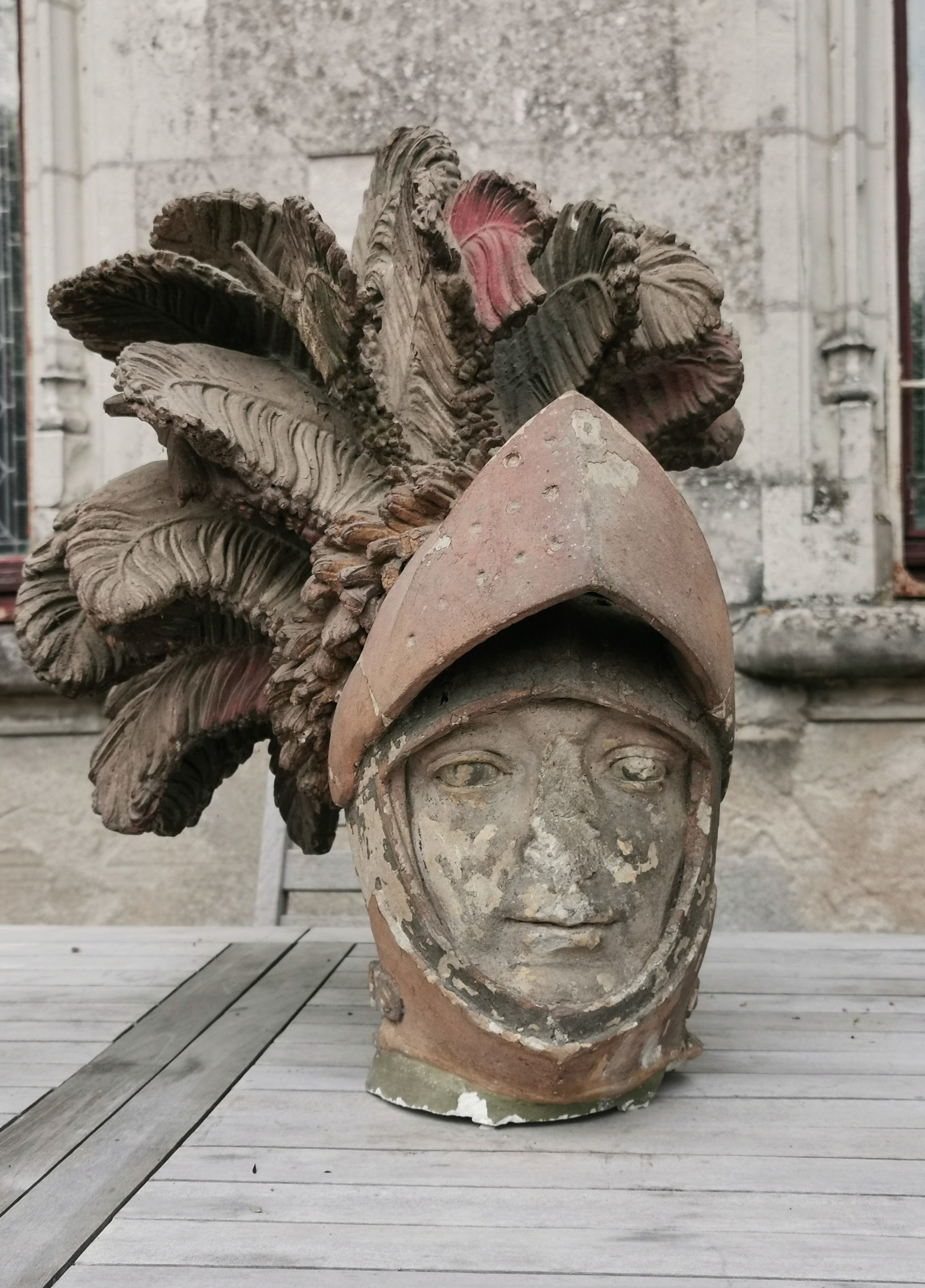 Tête en pierre calcaire et panache en bois sculpté, traces de polychromie, probable partie supérieure d'une statue équestre.