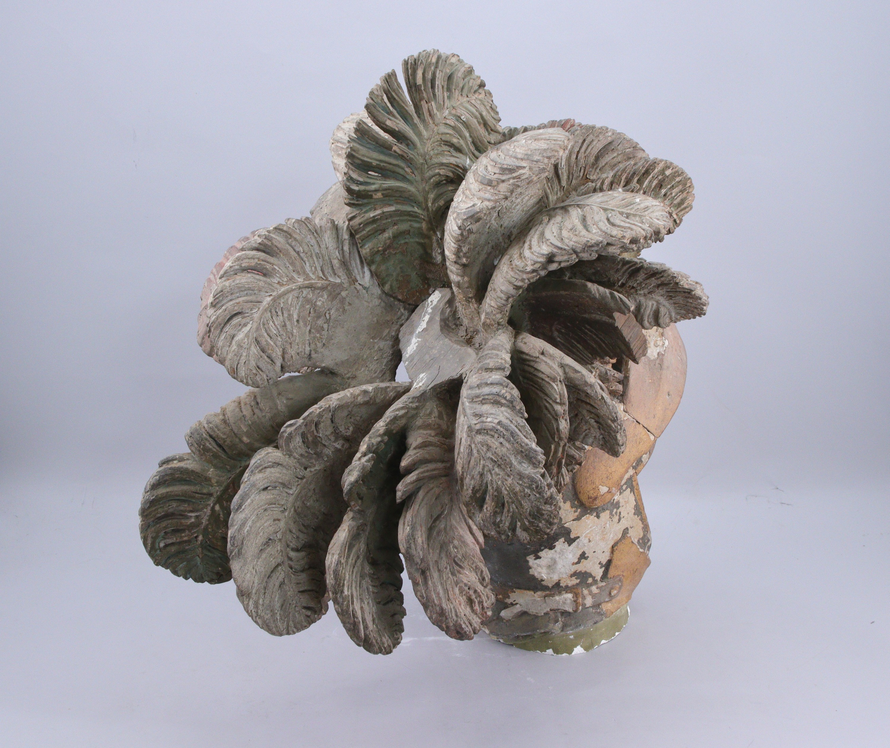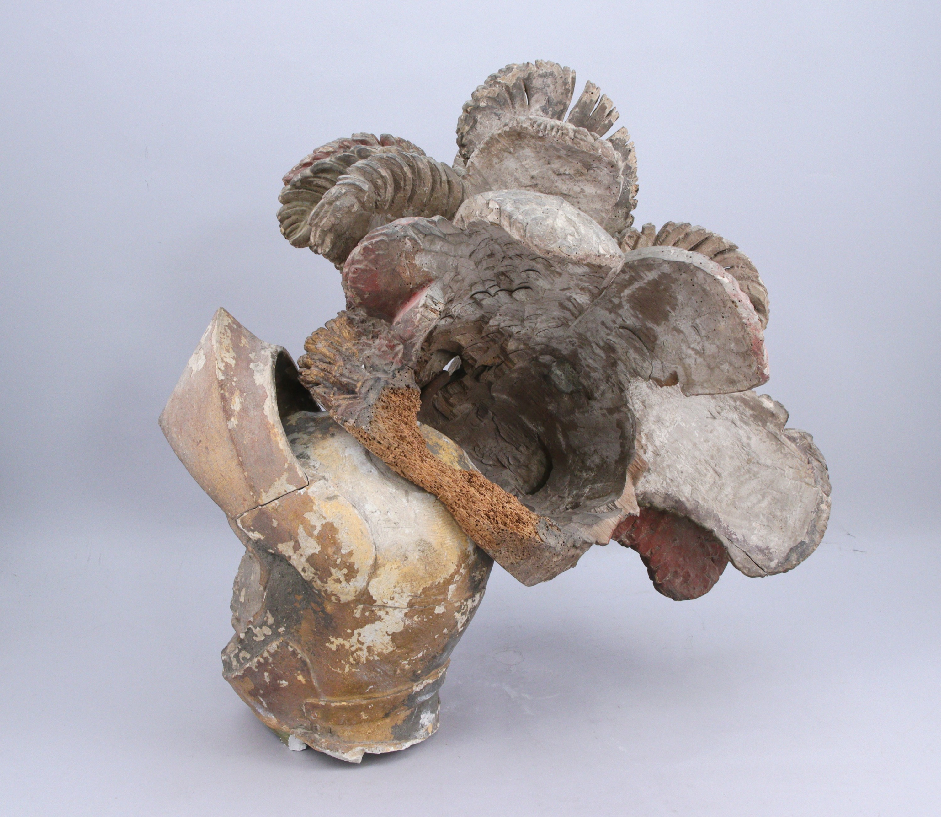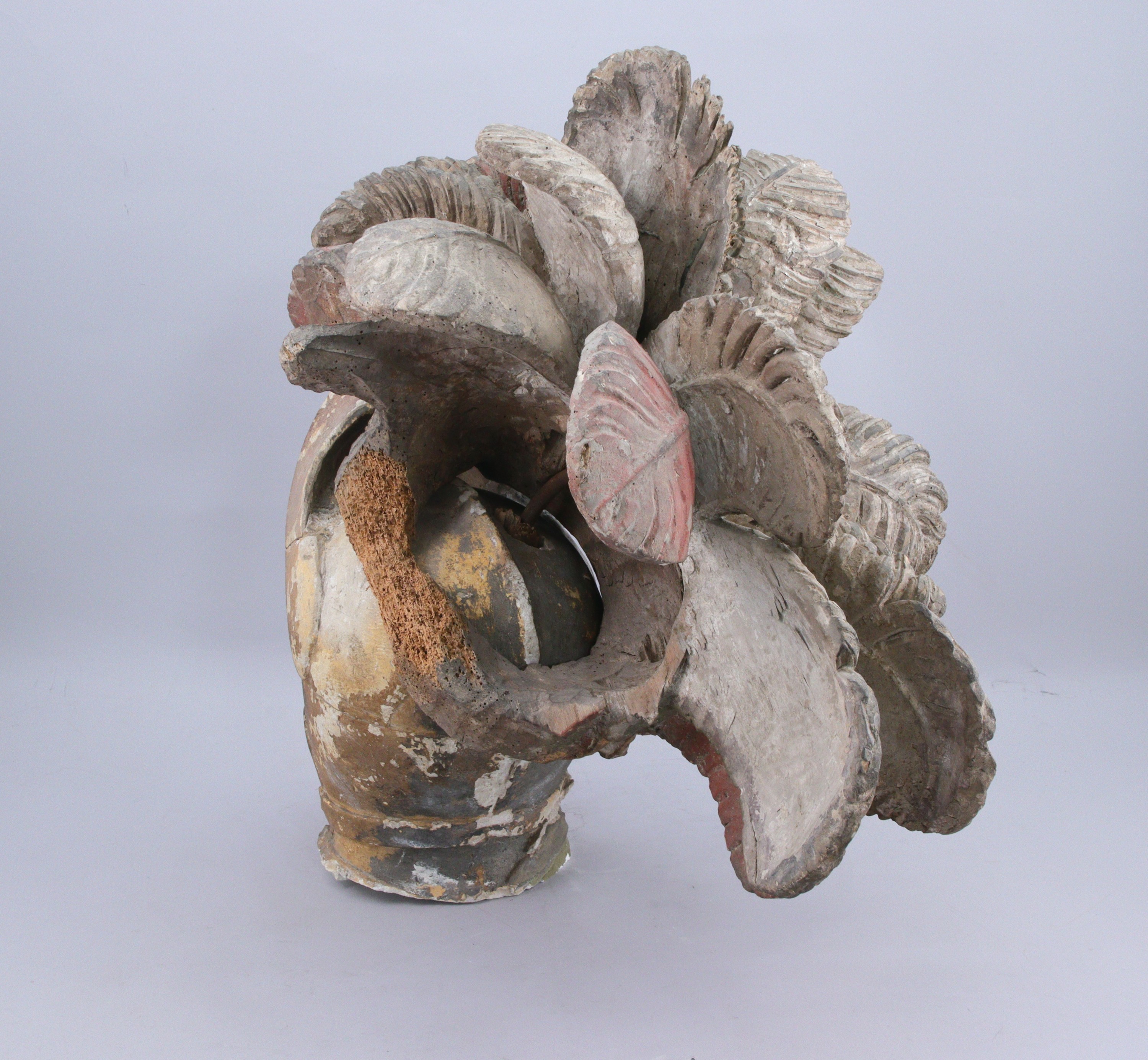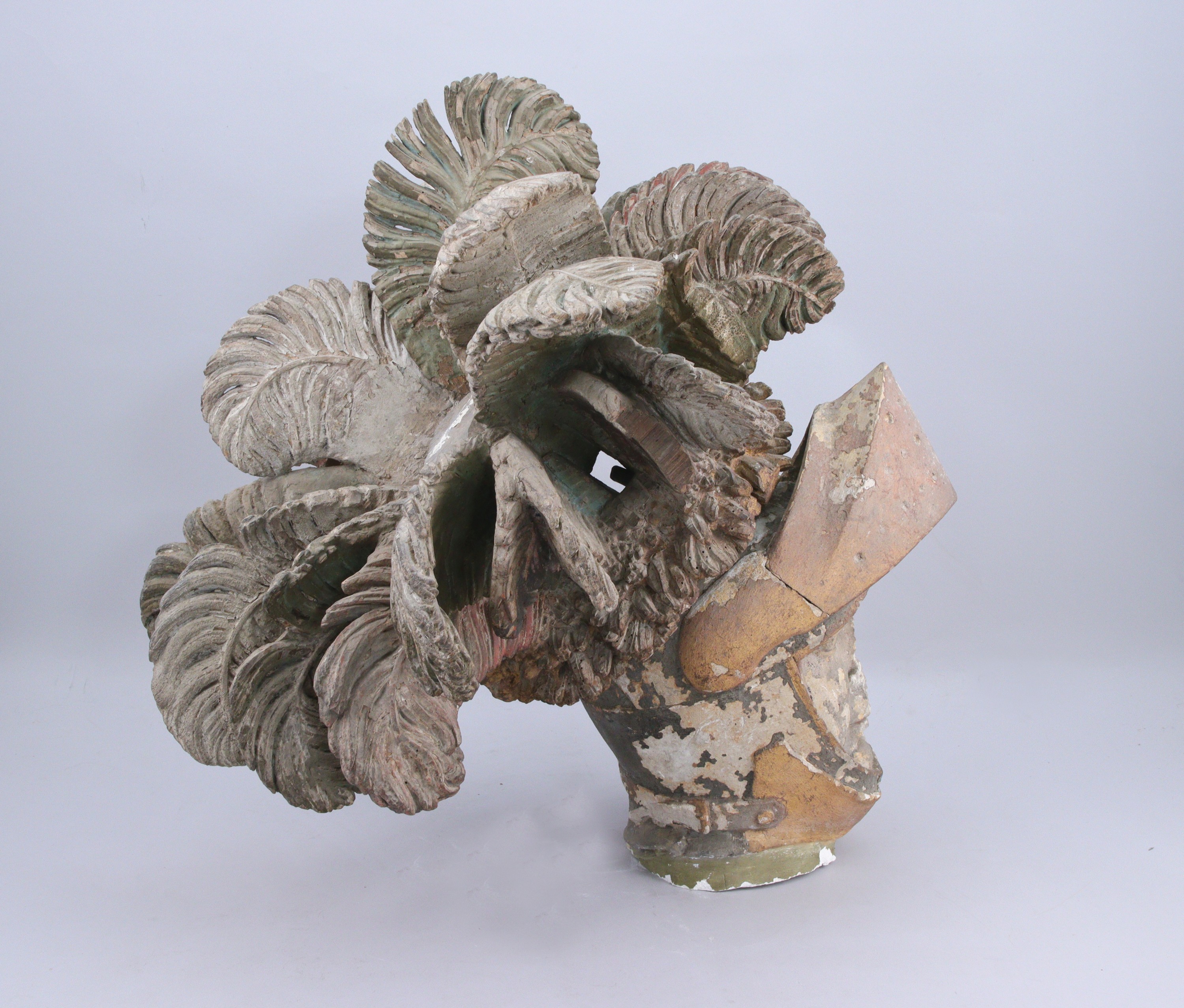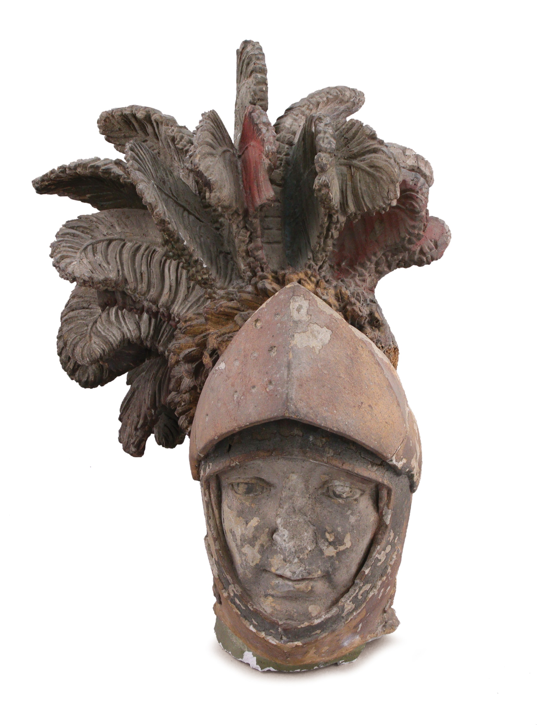 Tête en pierre calcaire et panache en bois sculpté, traces de polychromie, probable partie supérieure d'une statue équestre.
