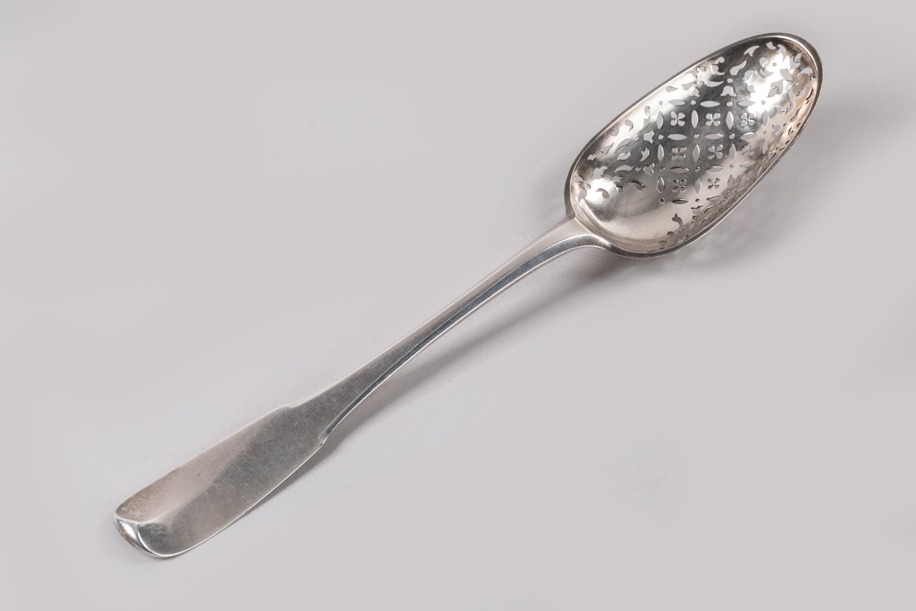 An 18th century silver olive spoon by Jacques-Joseph Durand. Uni-plat pattern.