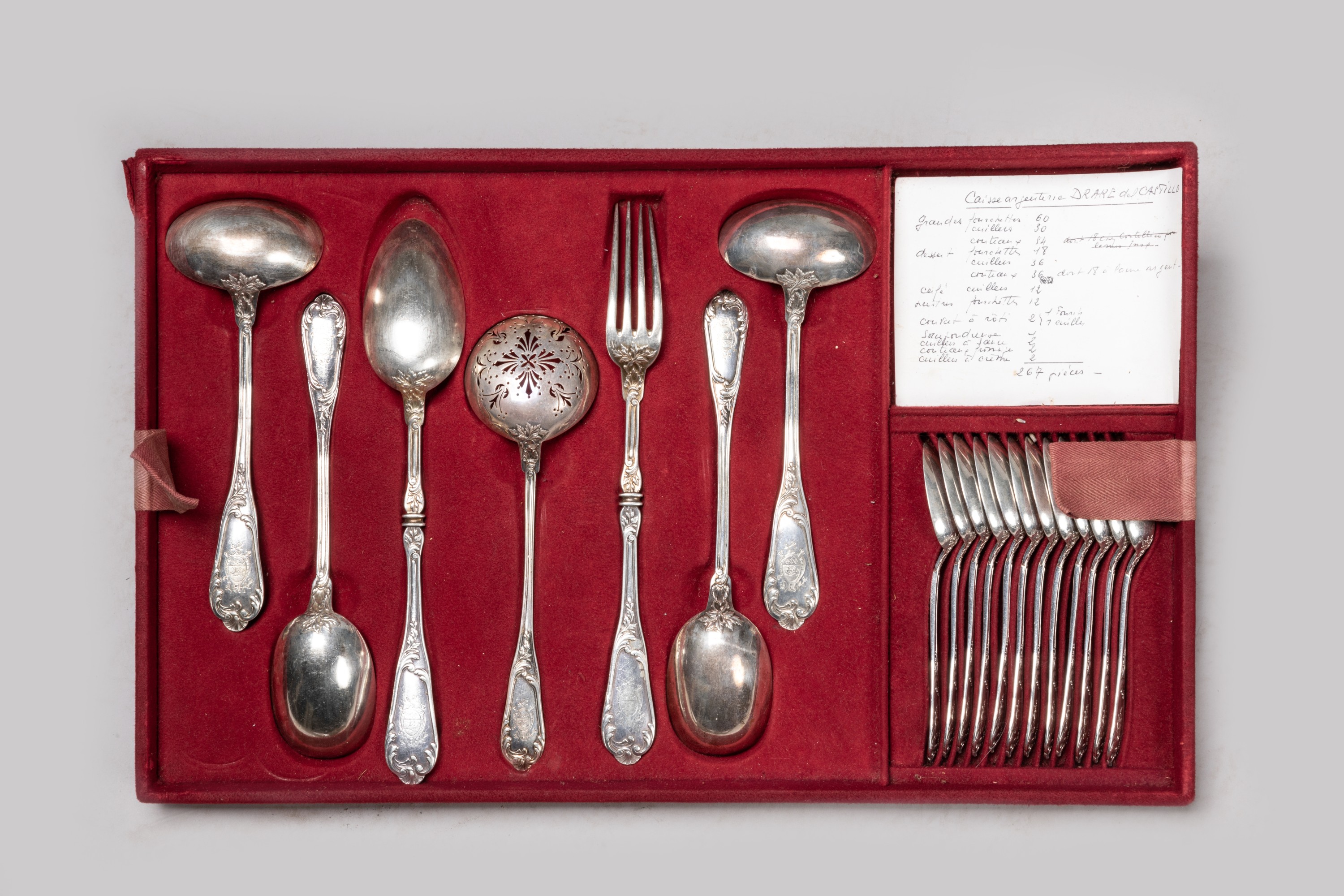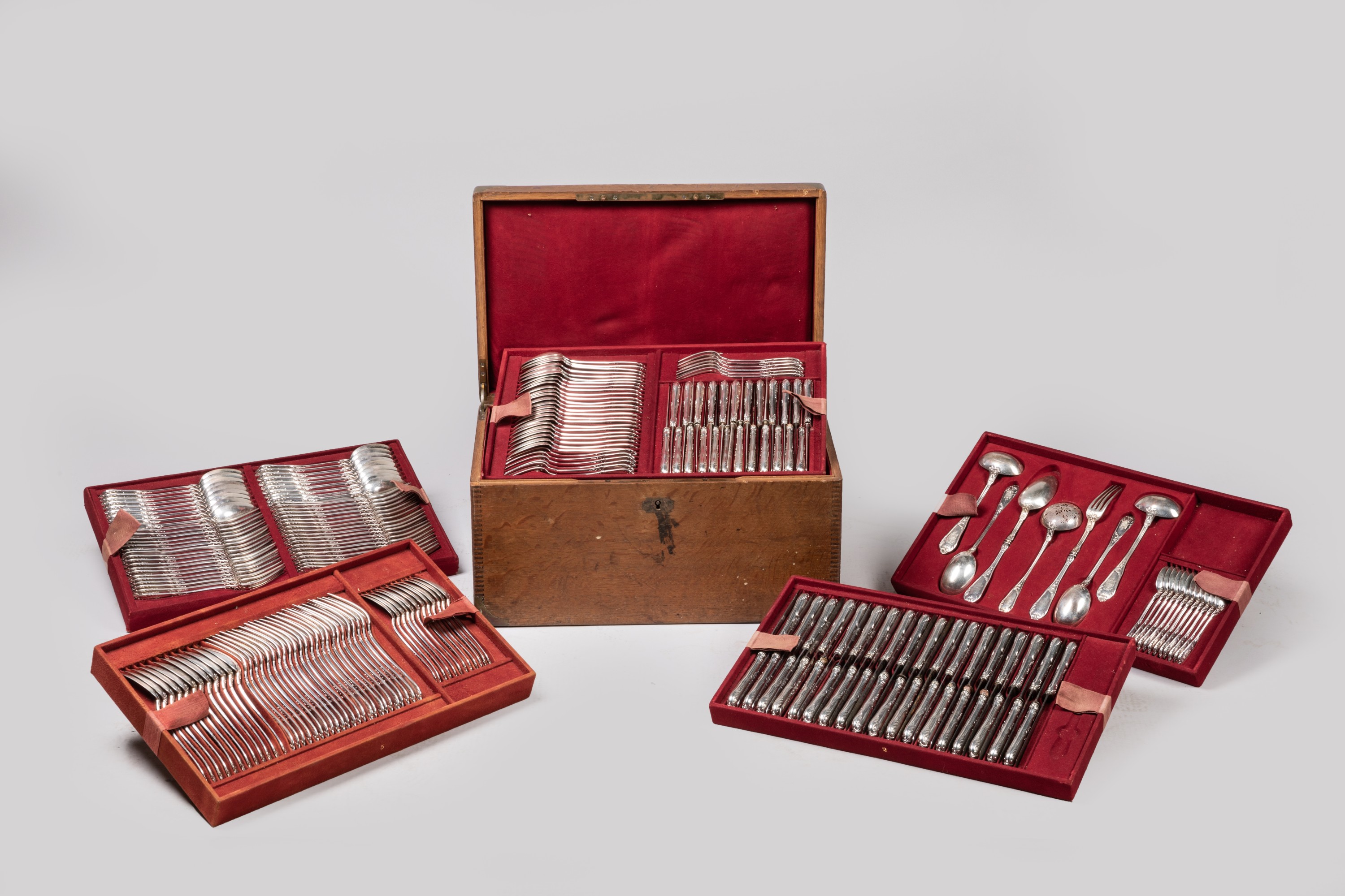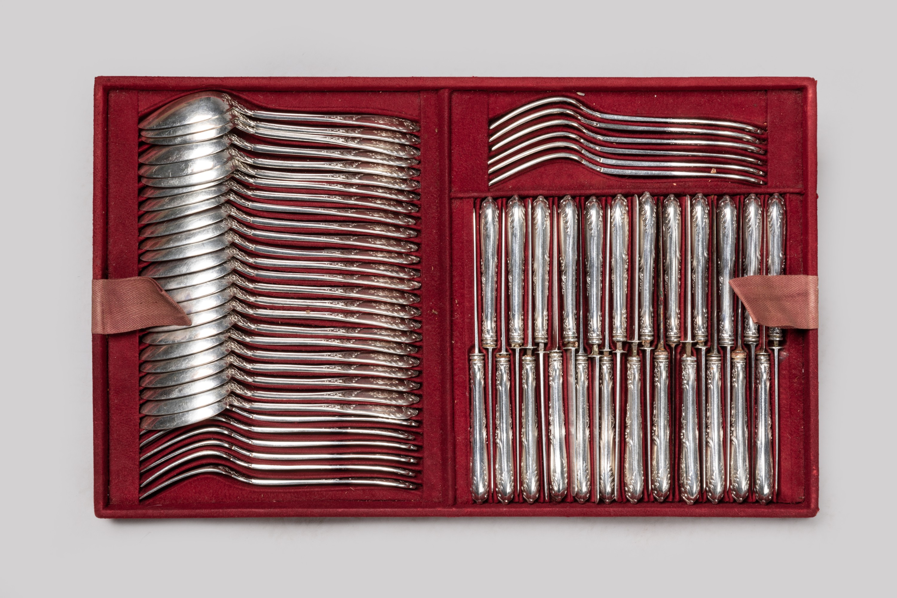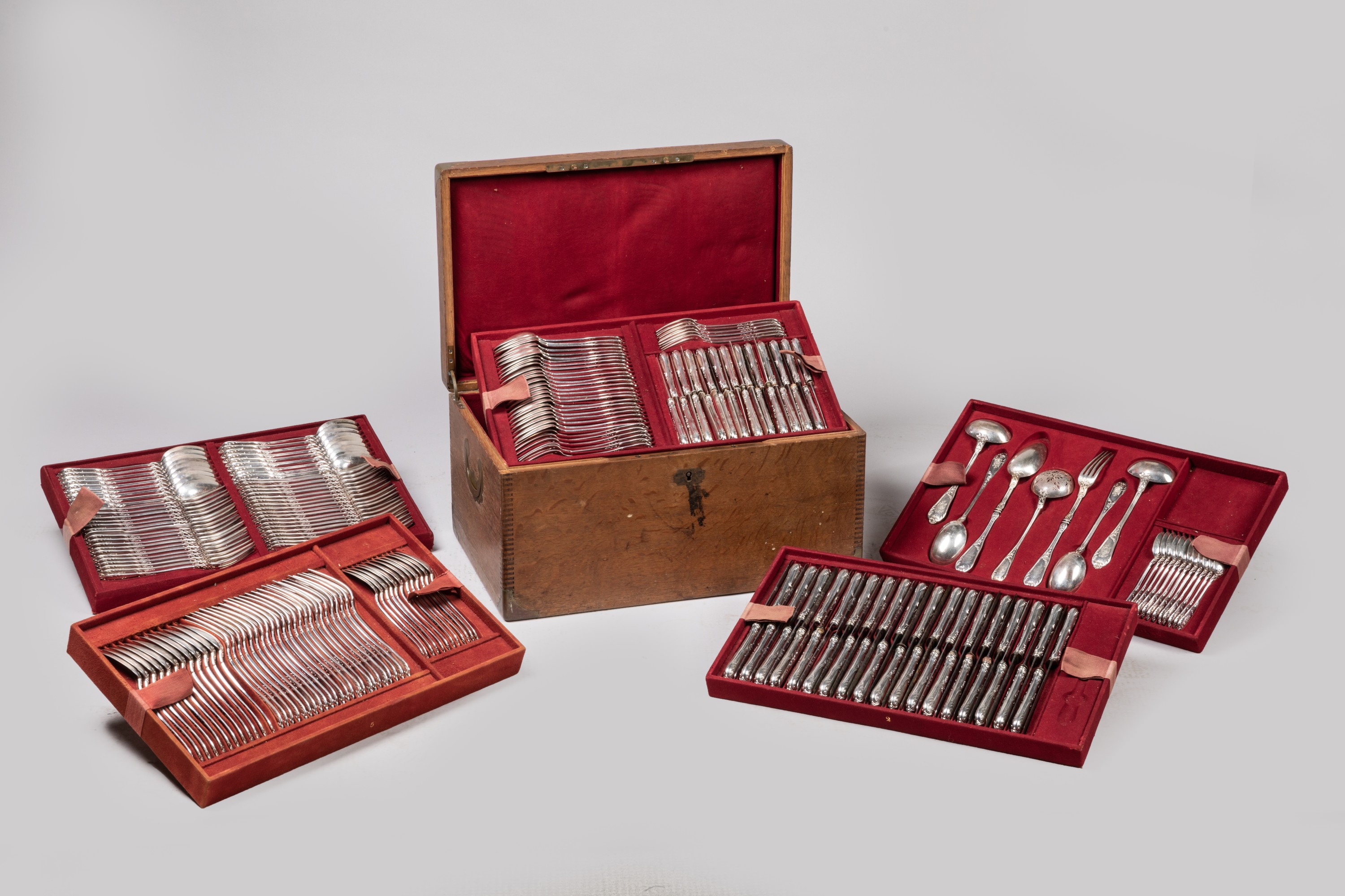 Cent soixante-quinze pièces en argent : soixante fourchettes de table (5.290 g.), trente cuillers de table (2.560 g.), dix-huit fourchettes à dessert (955 g.), trente-six cuillers à dessert (1.915 g.), douze cuillers à café (305 g.), douze fourchettes à huître (285 g.), un couvert (fourchette, cuiller) à rôti (200 g.), une saupoudreuse (80 g.), deux cuillers à sauce (160 g.), deux cuillers à crème (180 g.).