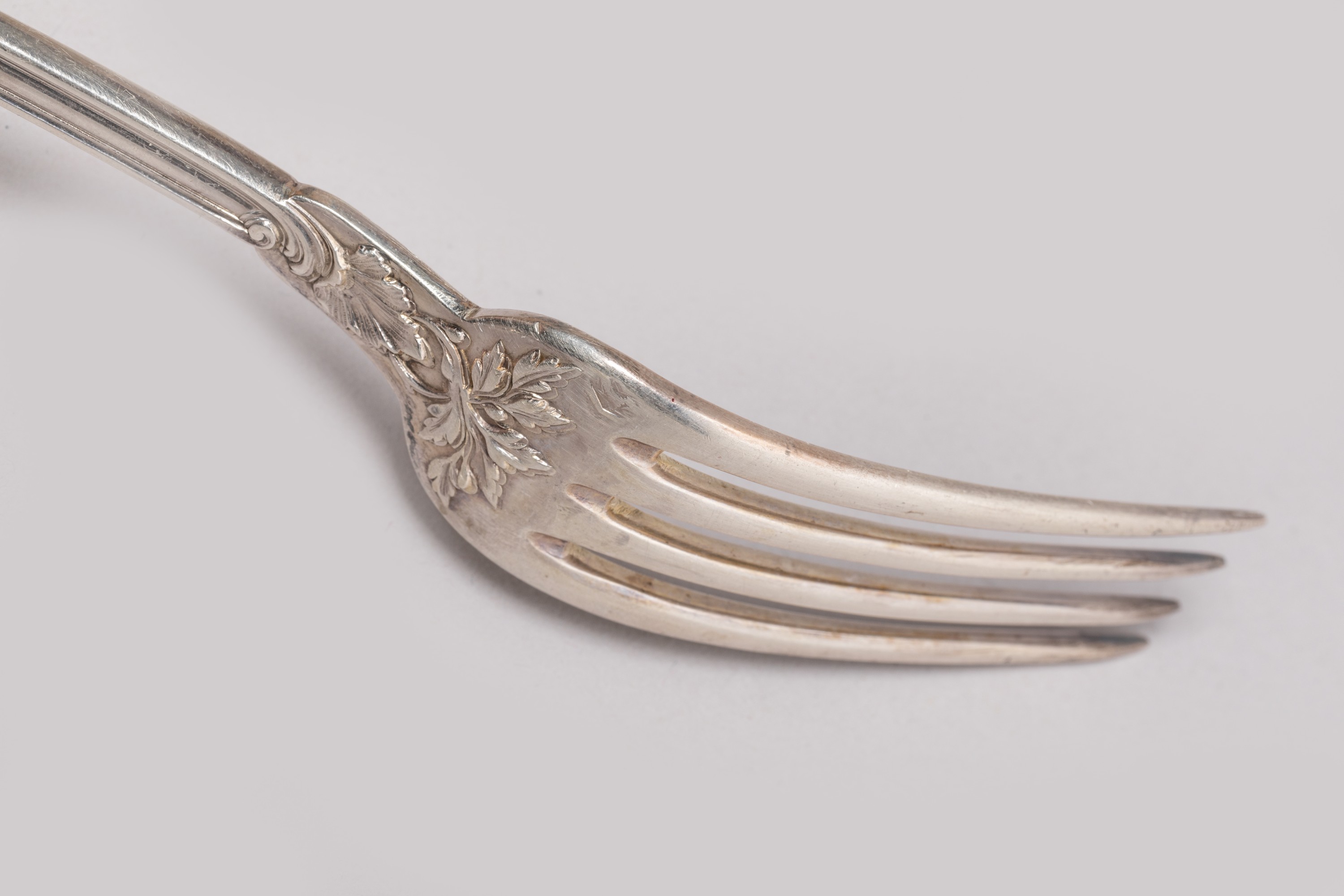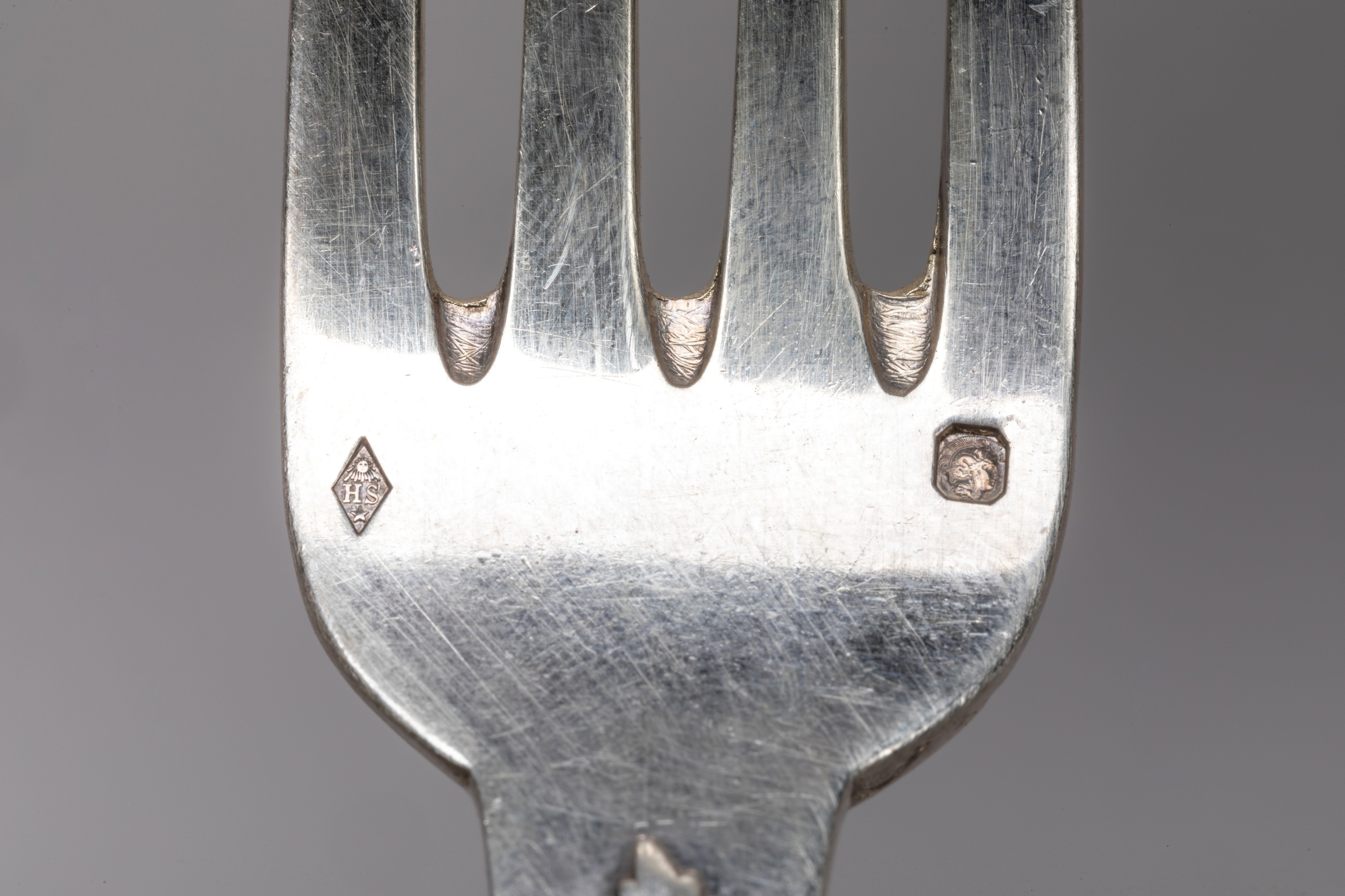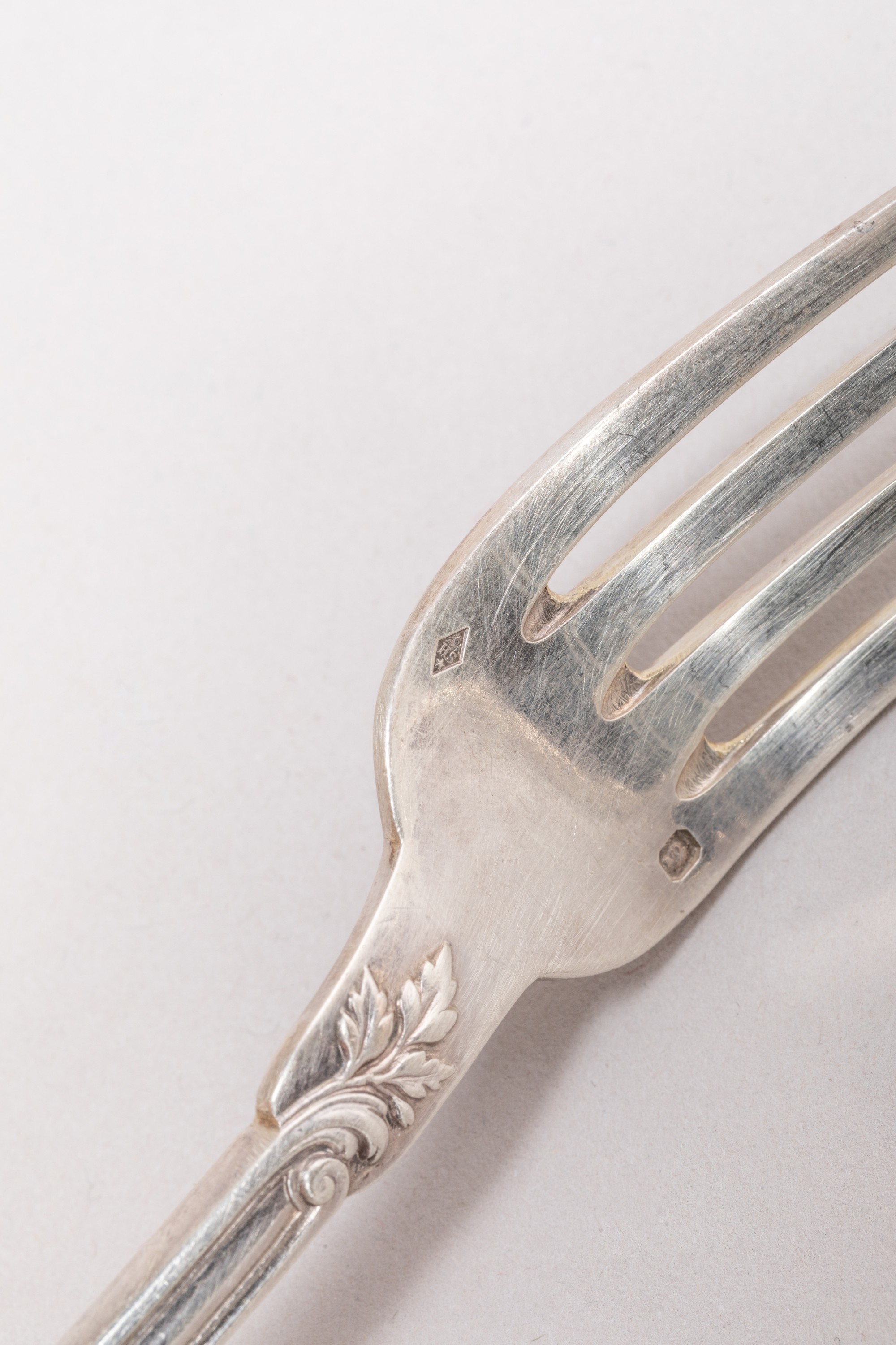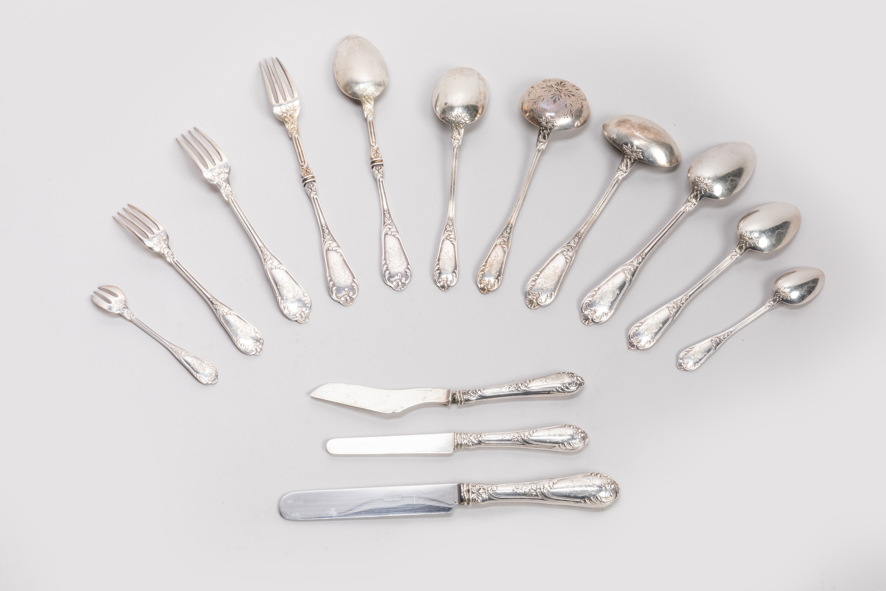 Cent soixante-quinze pièces en argent : soixante fourchettes de table (5.290 g.), trente cuillers de table (2.560 g.), dix-huit fourchettes à dessert (955 g.), trente-six cuillers à dessert (1.915 g.), douze cuillers à café (305 g.), douze fourchettes à huître (285 g.), un couvert (fourchette, cuiller) à rôti (200 g.), une saupoudreuse (80 g.), deux cuillers à sauce (160 g.), deux cuillers à crème (180 g.).