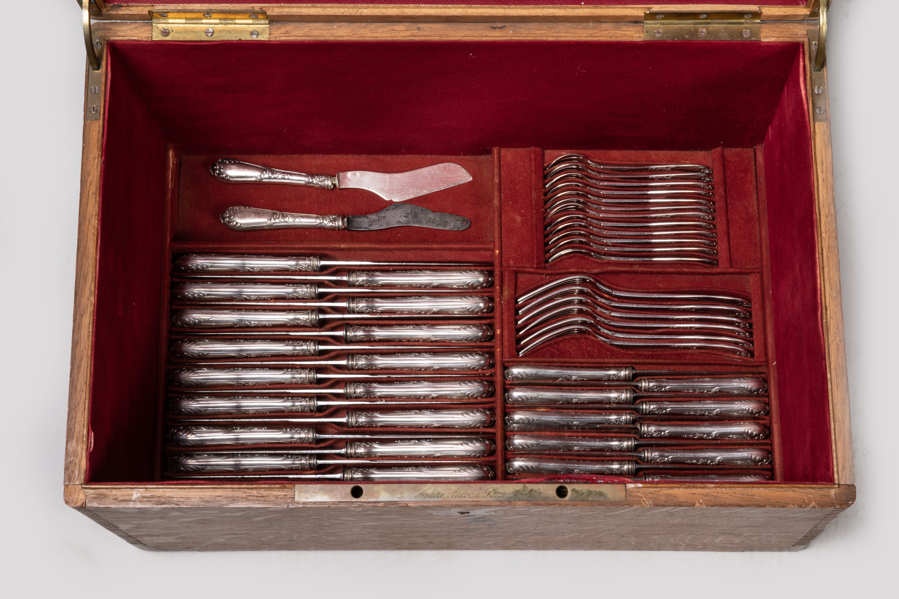 Quatre-vingt-douze pièces aux manches en argent fourré : cinquante-quatre couteaux de table lame acier (4.630 g.), dix-huit couteaux à fruits lame argent (950 g.), dix-huit couteaux à fromage lame acier (890 g.), deux couteaux à servir le fromage, lun lame acier (45g.), lautre lame argent (65 g.).