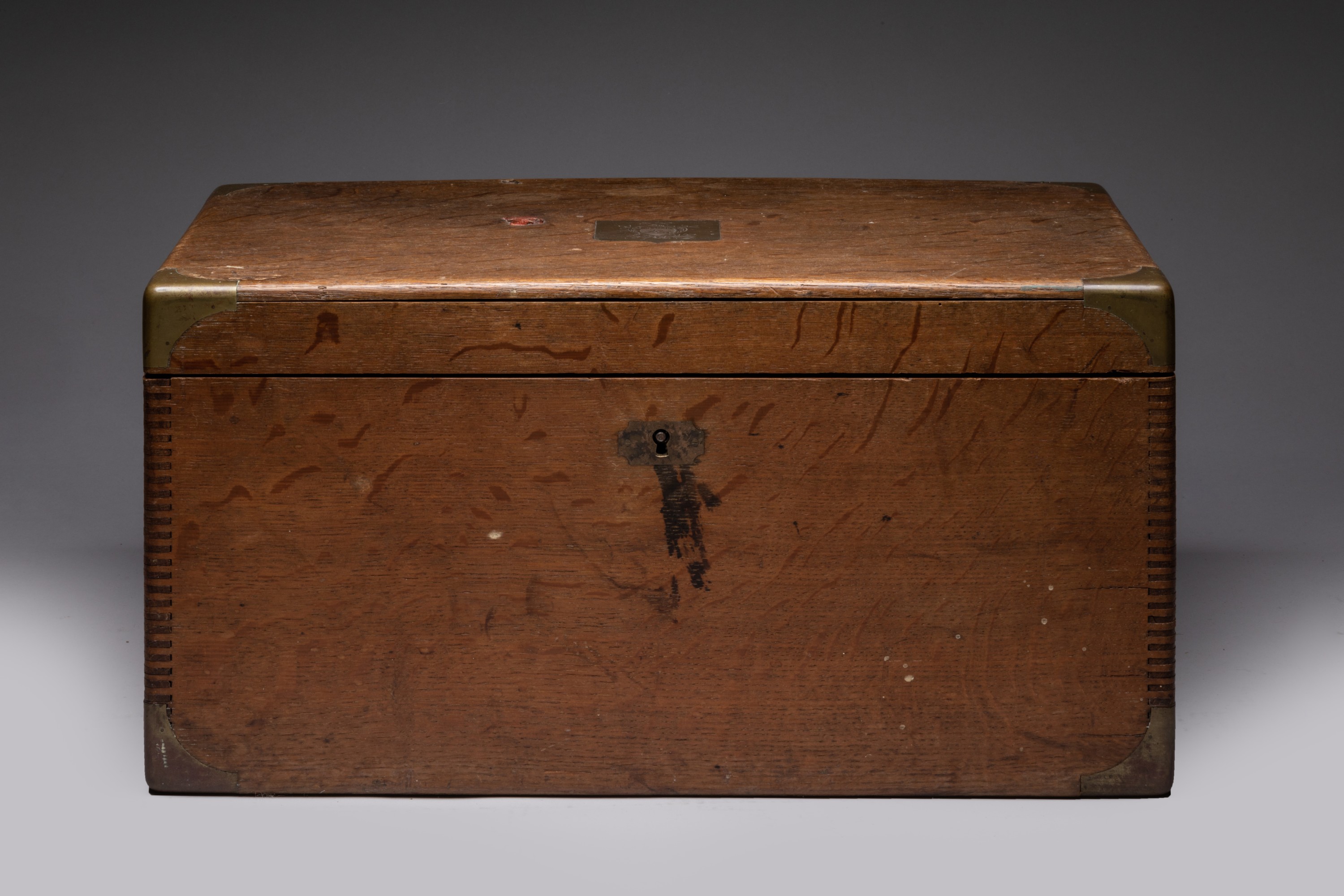 Dans un coffre en chêne signé sur la serrure « André Aucoc à Paris », gainé de feutrine rouge, écusson armorié plaque de cuivre. Haut. 26,5 Long. 52 Prof. 33 cm. André Aucoc (1856-1911), bijoutier, joaillier et orfèvre français, frère de Louis Aucoc de la maison Aucoc fondée en 1821.
