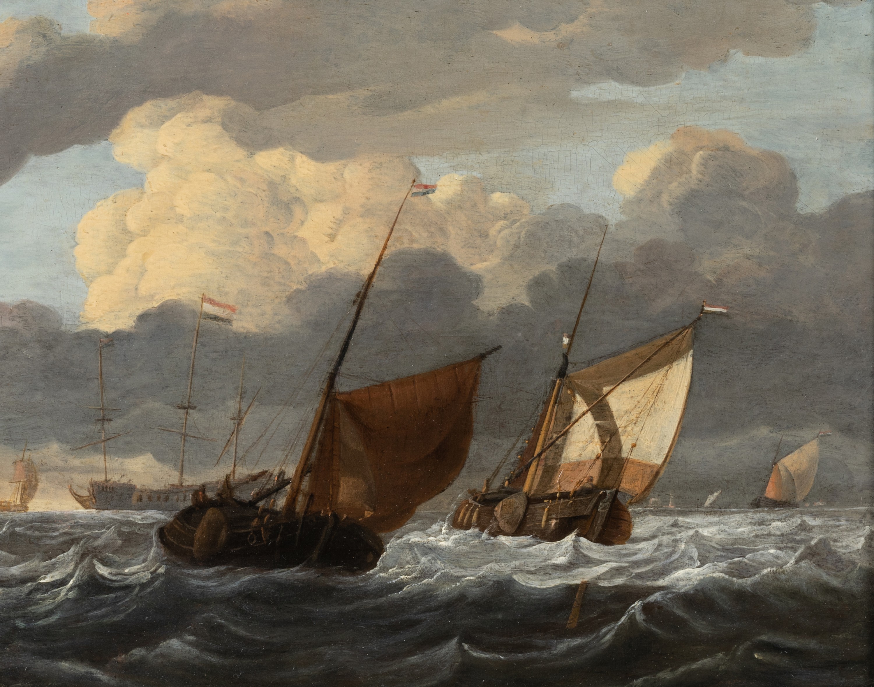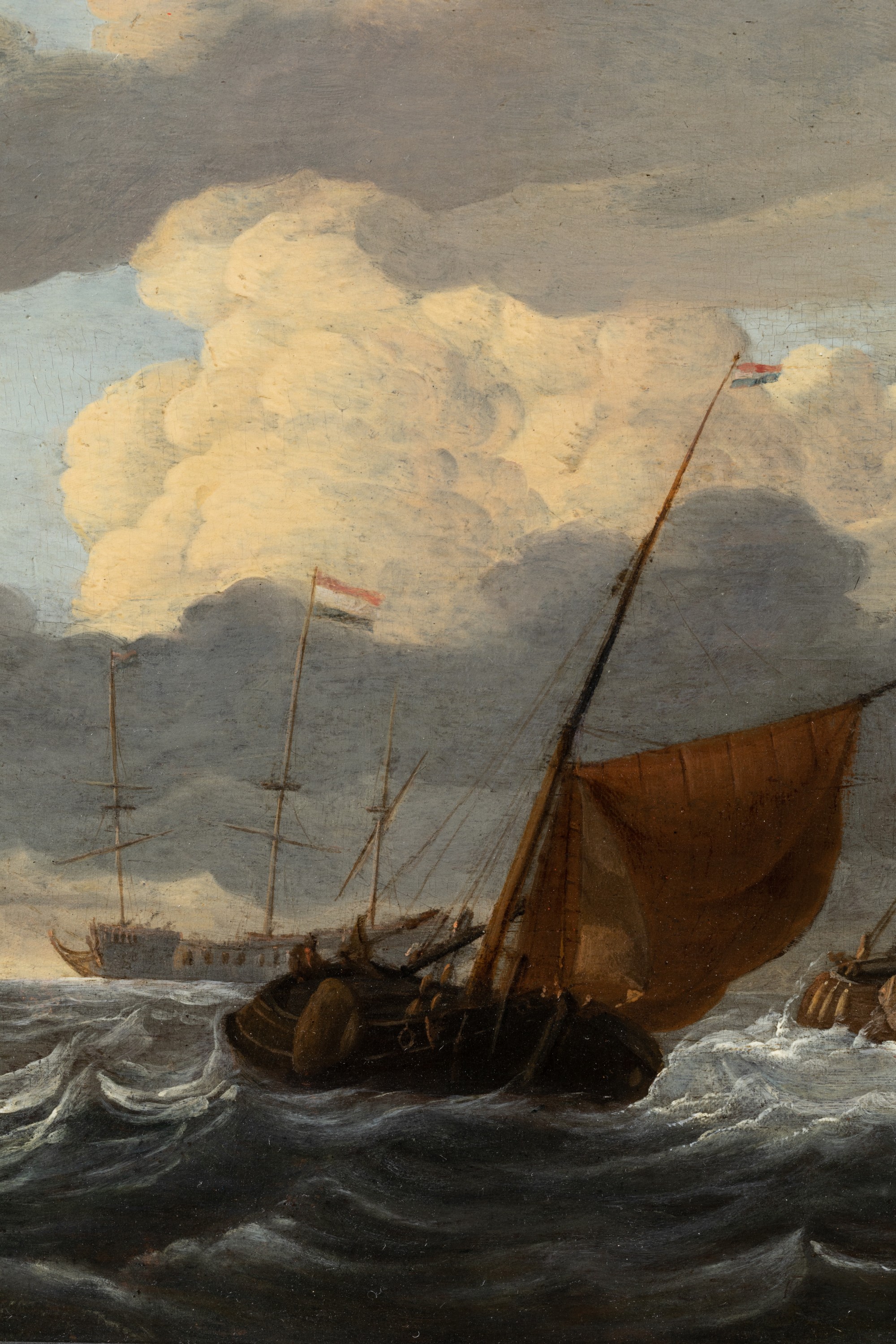 A marine by Vitringa depicting ships in choppy waters. Oak panel painting.