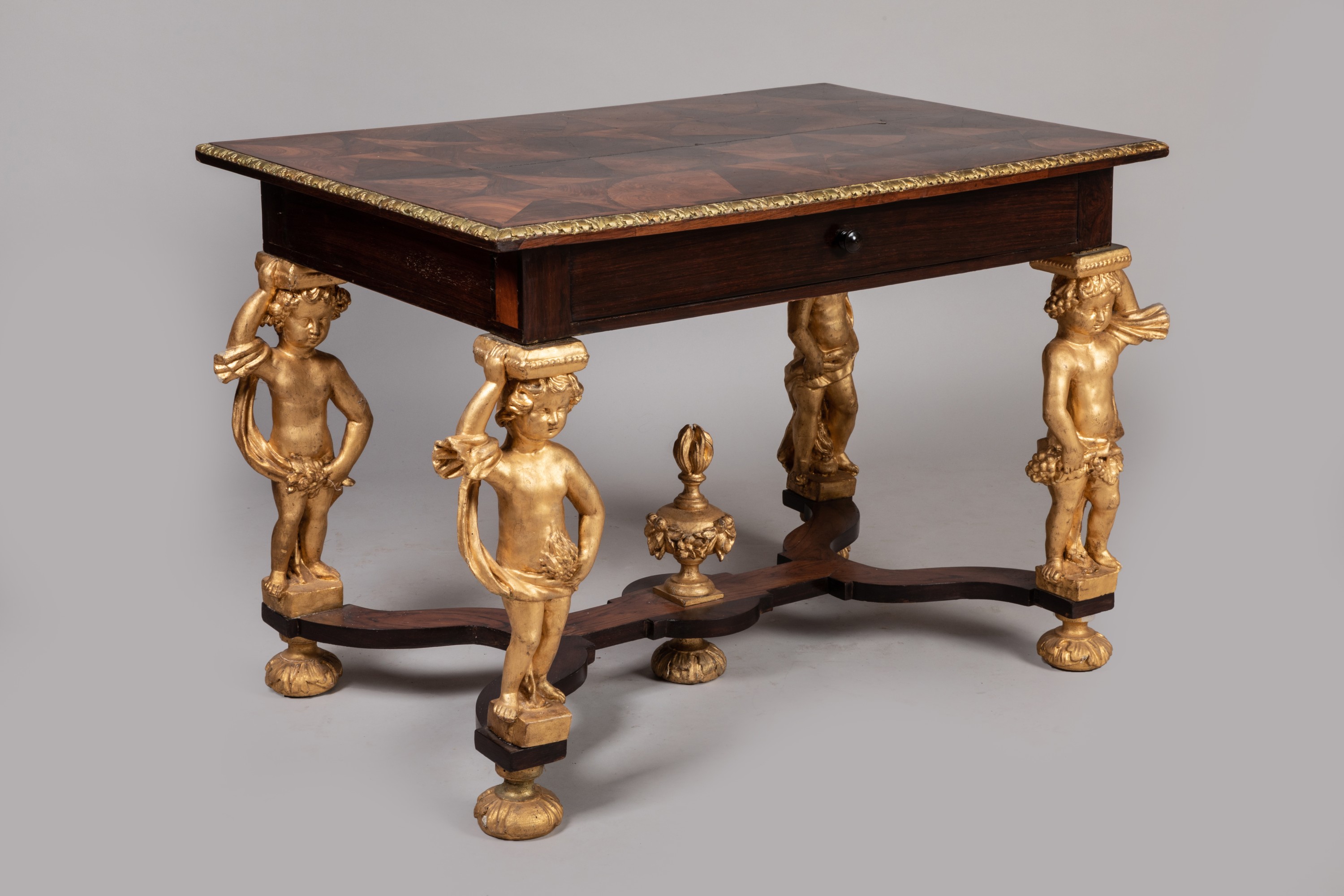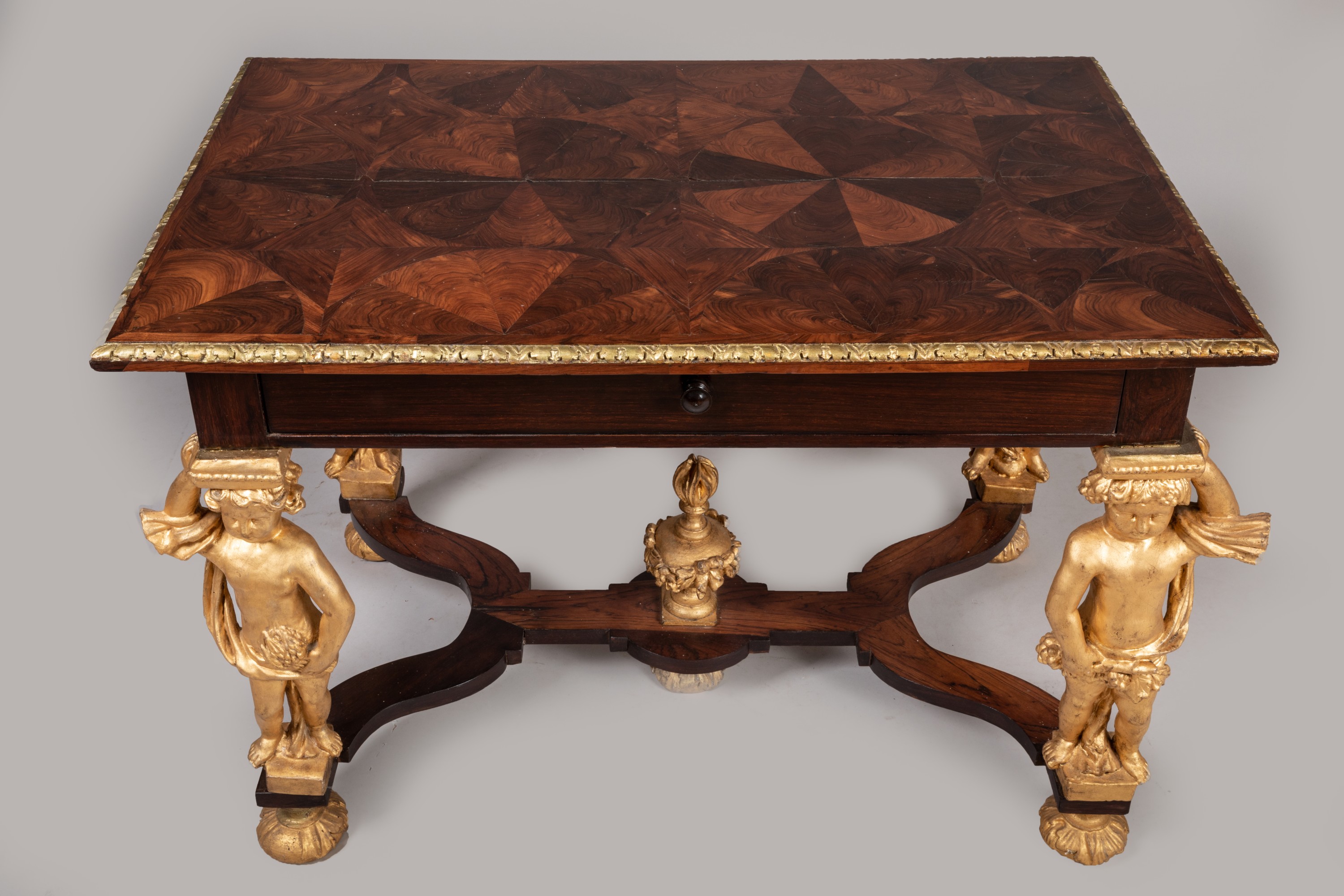 A Southern French Louis XIV "four-season" table. Violet and rosewood veneer as well as carved and gilded wood. Remodeled drawer and partially renovated gilding.