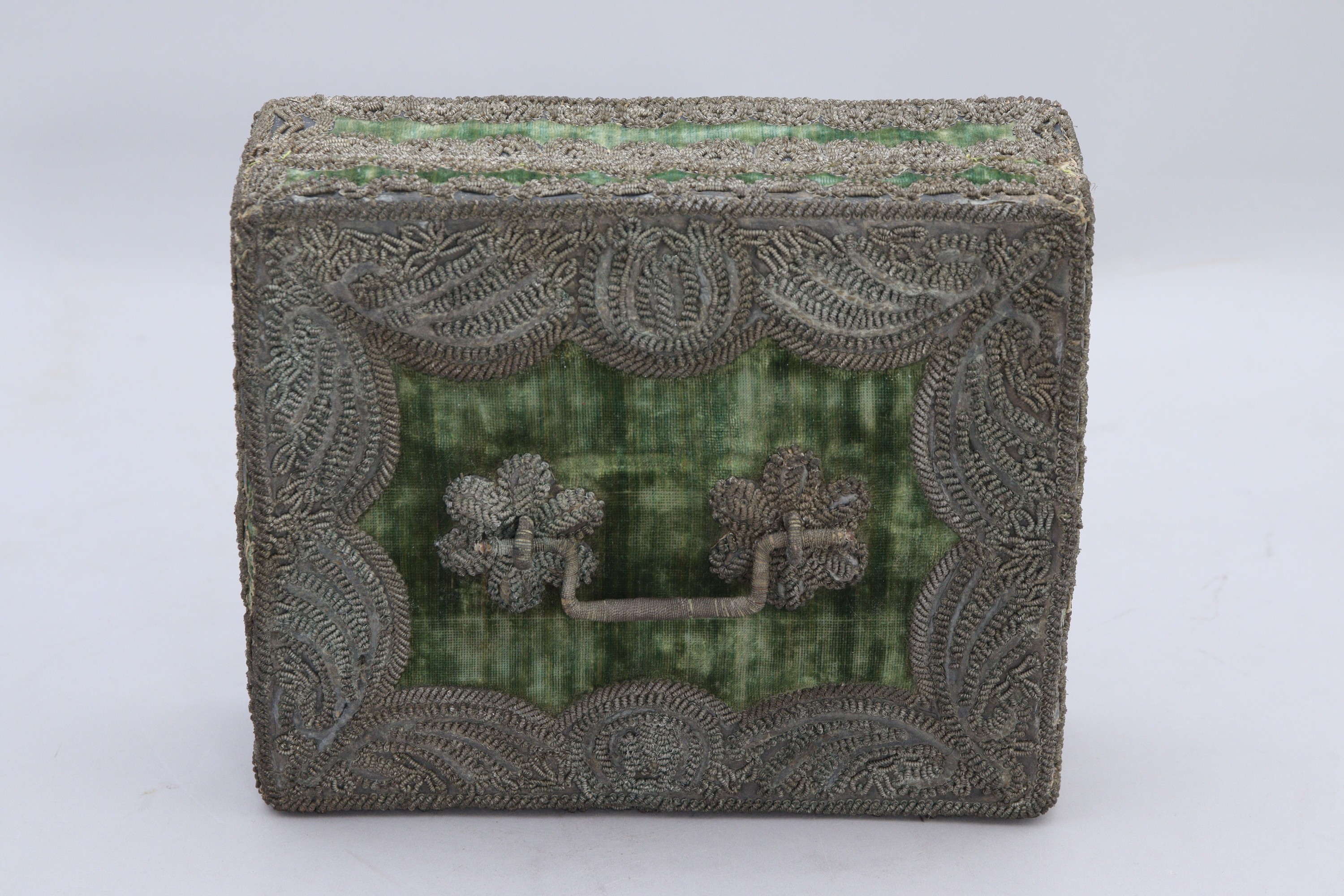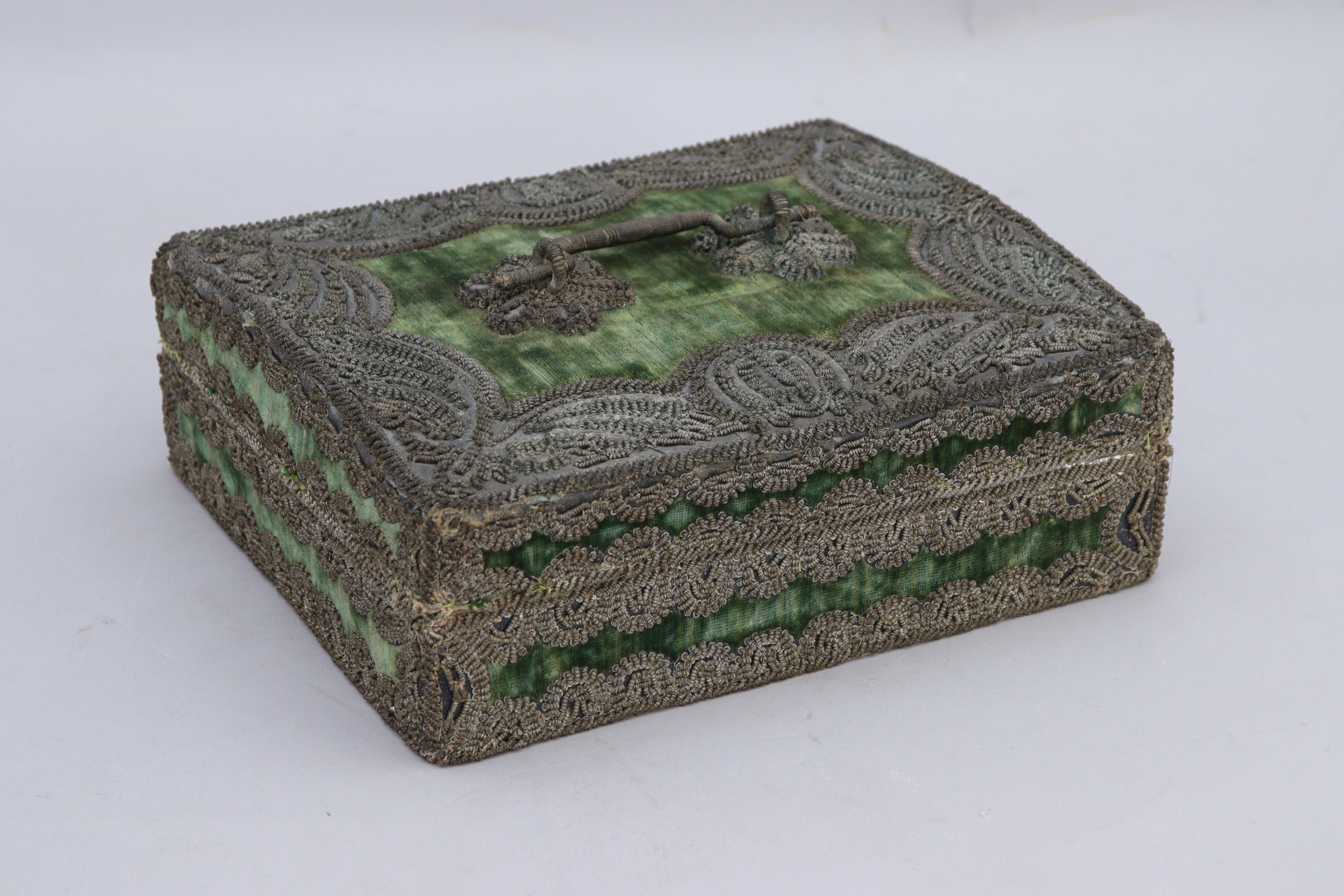 A Regency period letterbox with embroidered silver fleur-de-lis on green velvet.