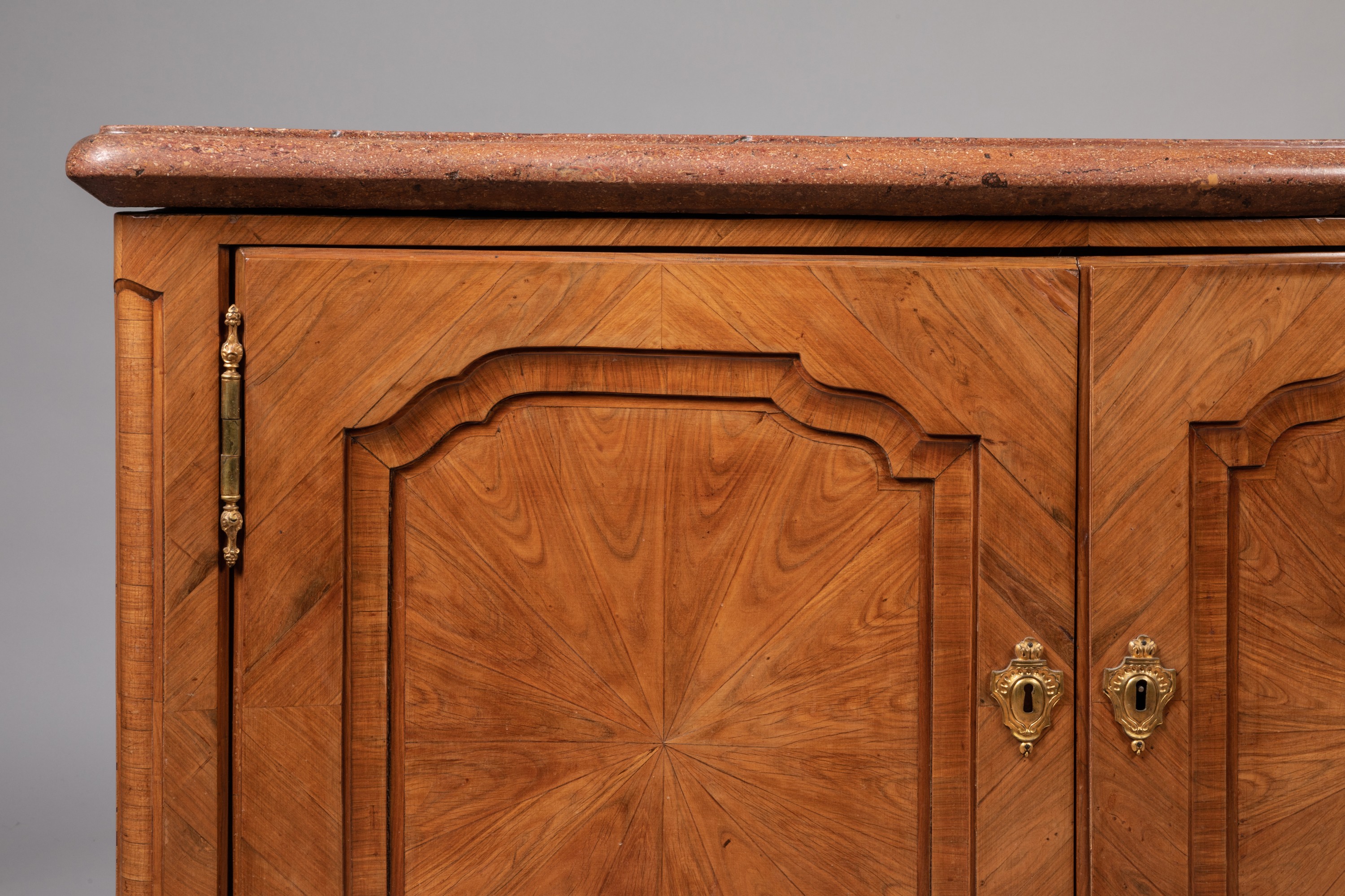 en "placage de noyer" ouvrant à deux vantaux encadrés de montants arrondis et reposant sur une base en ressaut formée par des petits pieds cambrés. Marbre mouluré à bec de corbin.