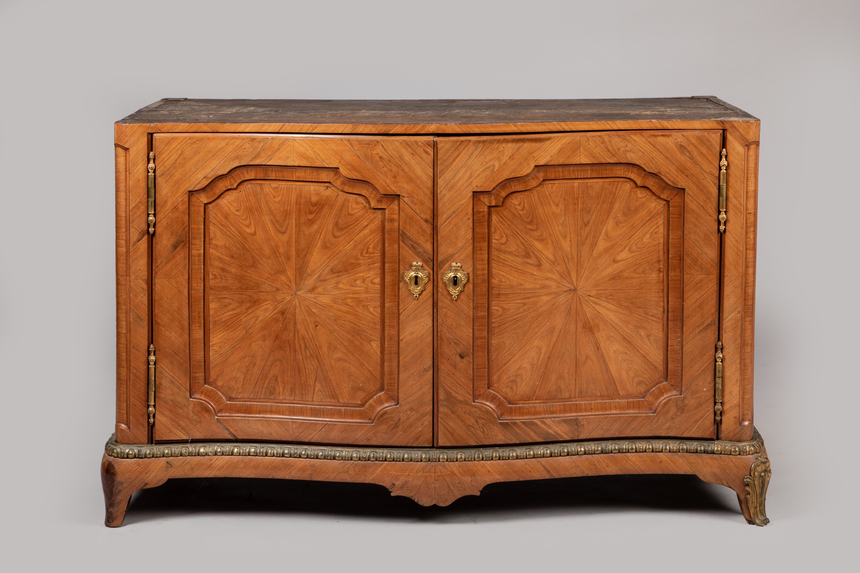 An 18th century French walnut veneer hunting sideboard with marble top. Chiseled and gilded bronze ornamentation added subsequently.