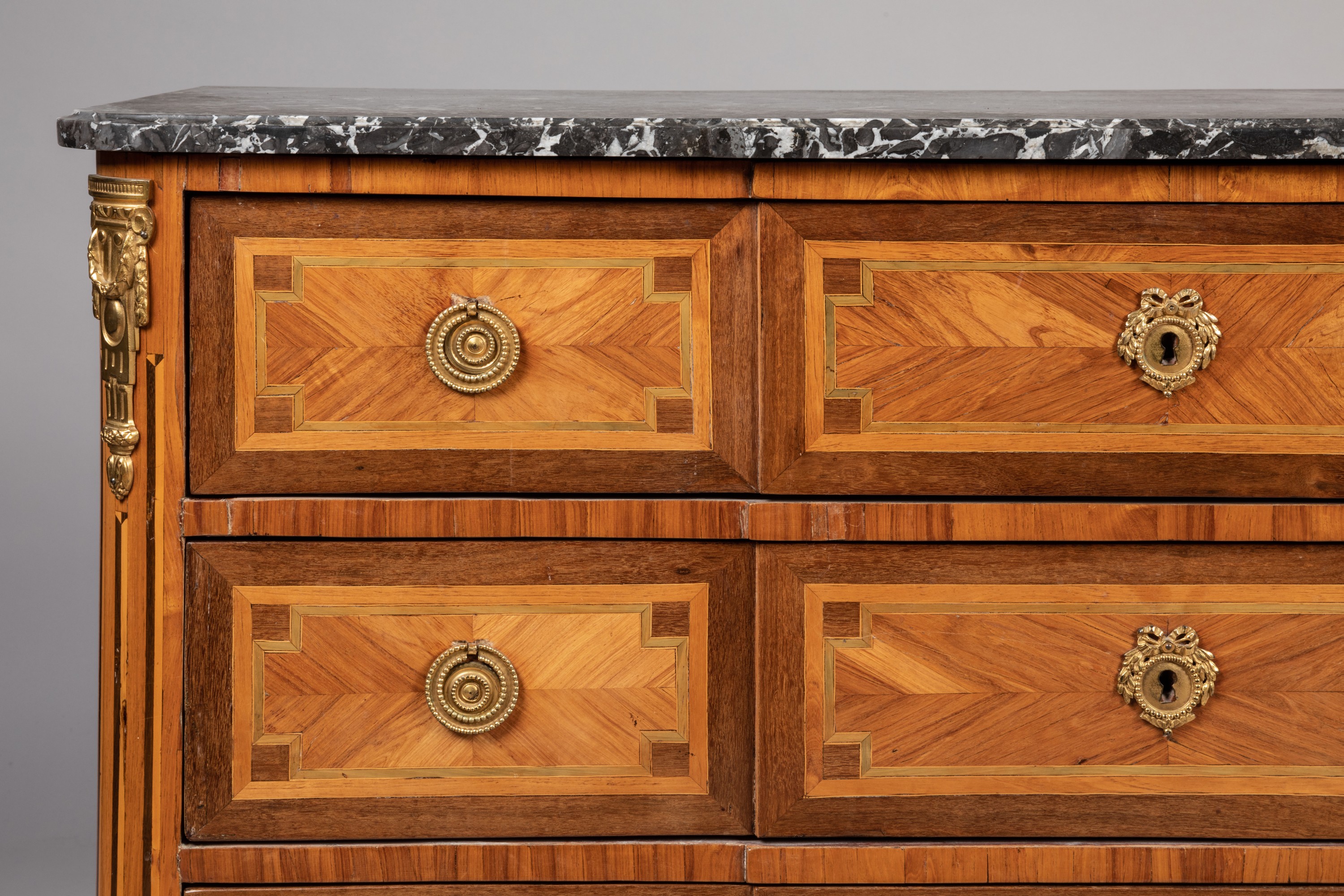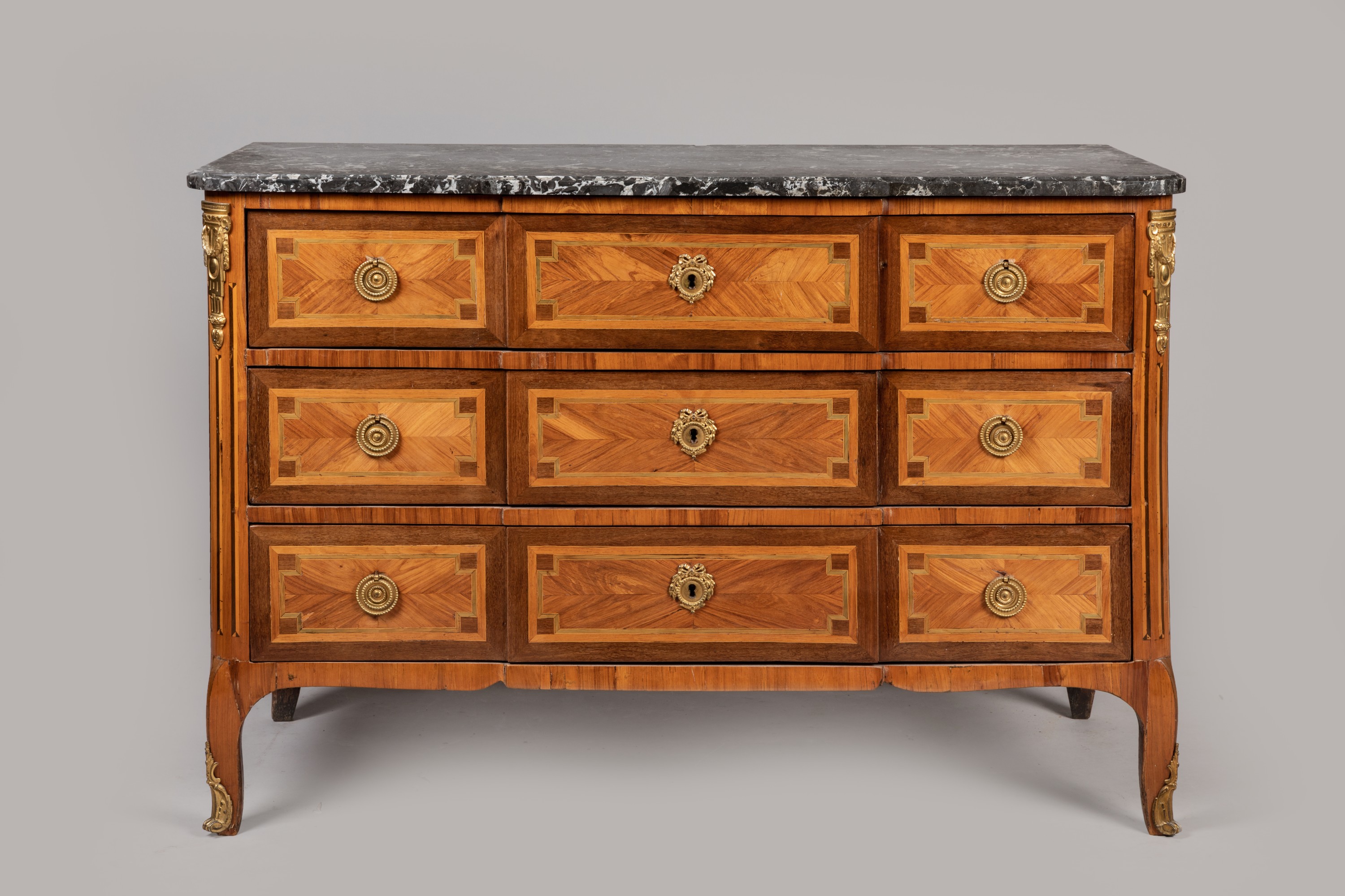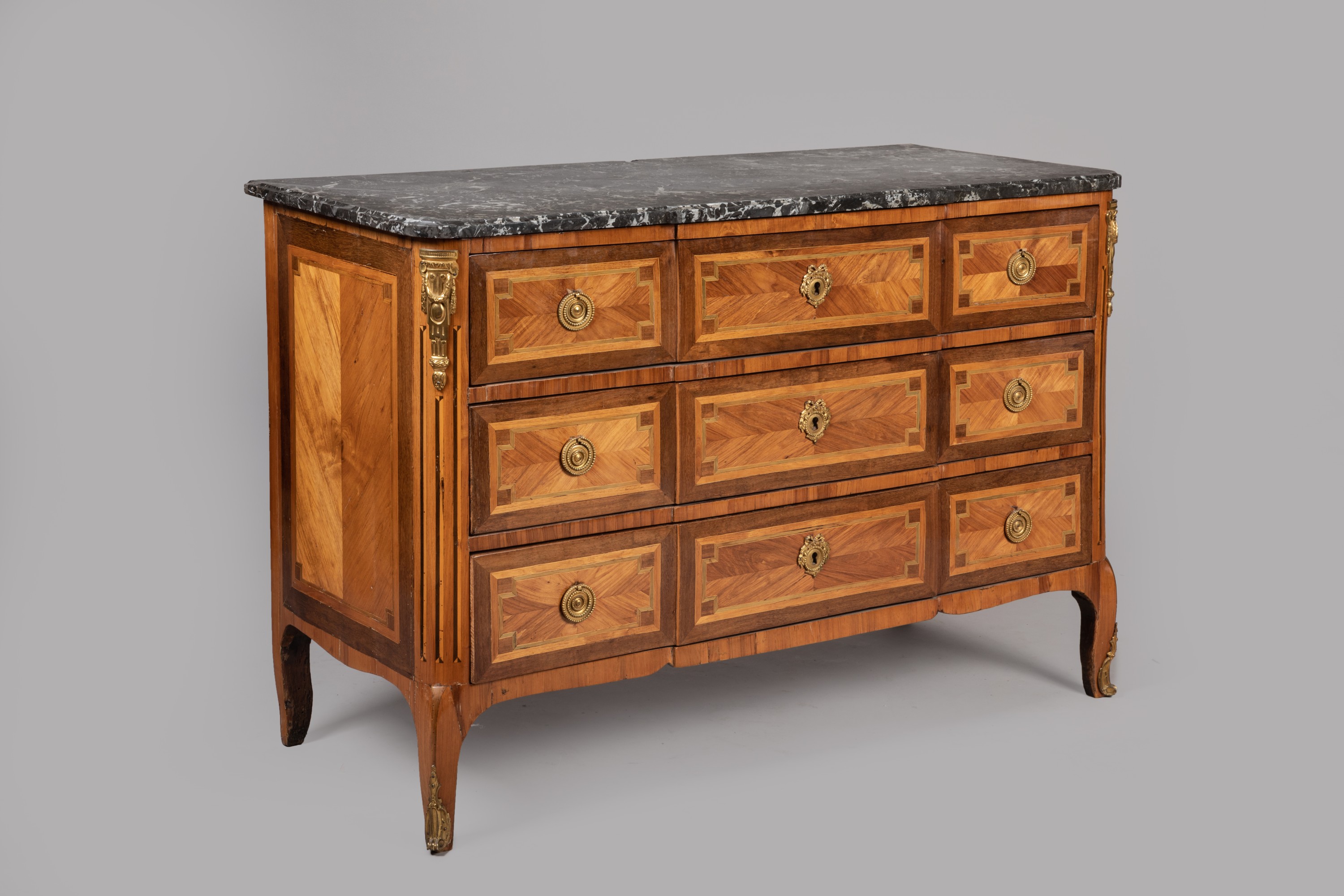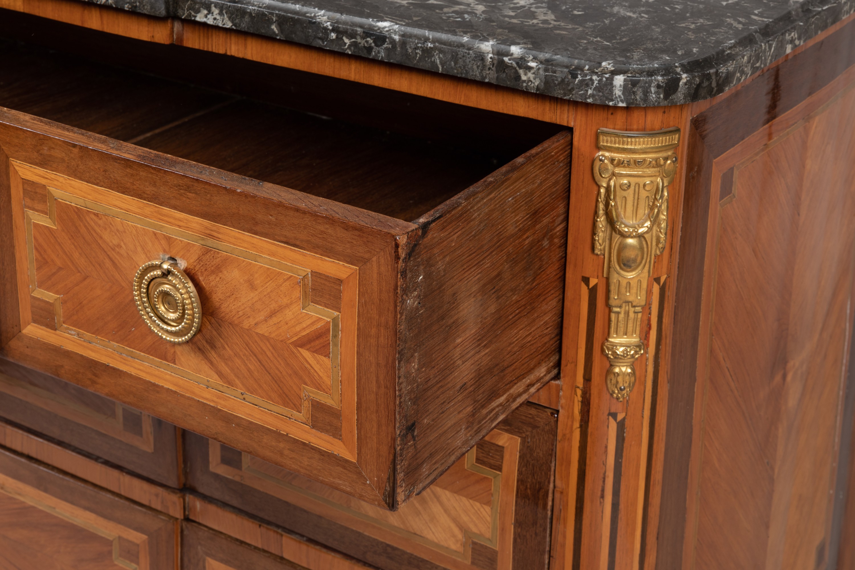 A Transition period rosewood veneer chest of drawers. Bronze ornamentation and marble top added subsequently. Apocryphal "Saunier" stamp.