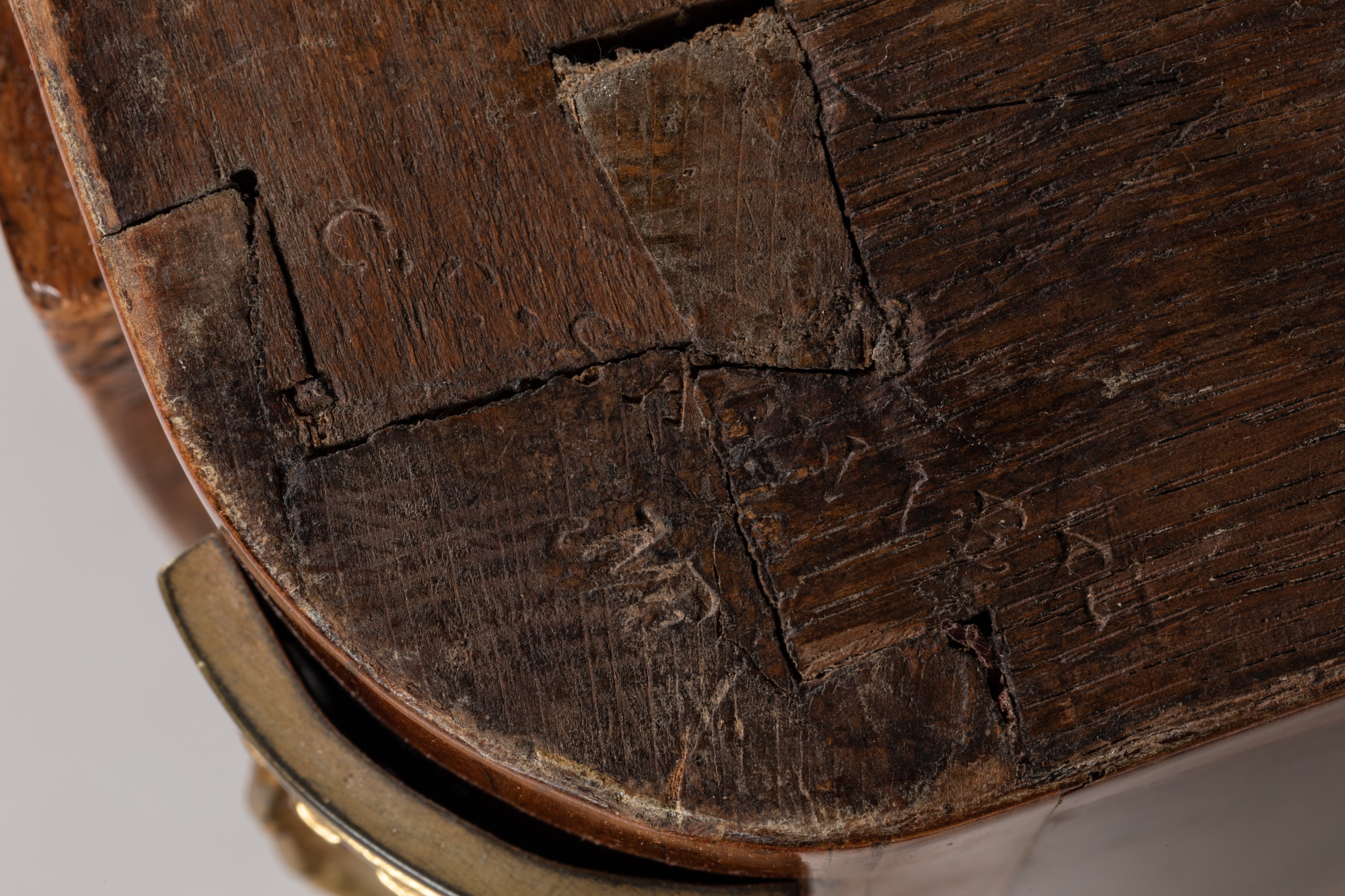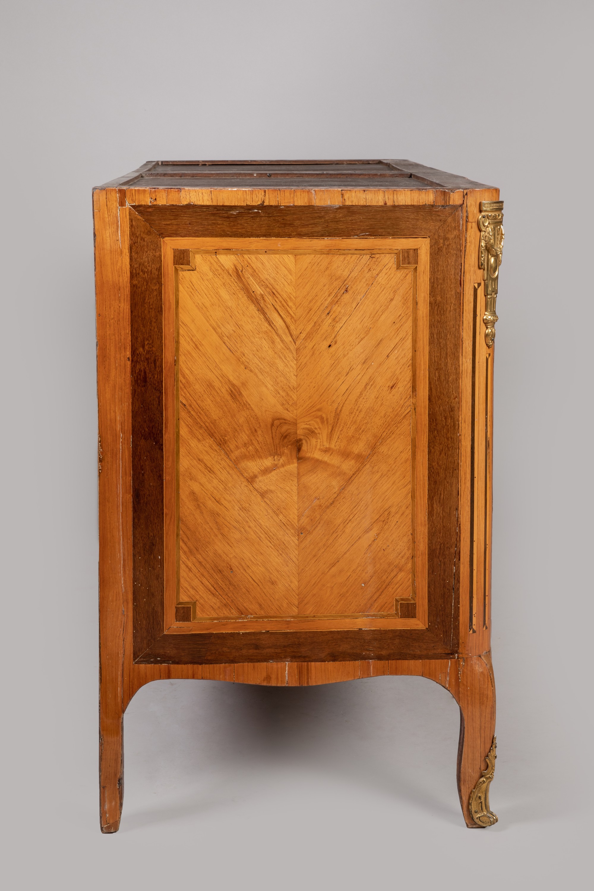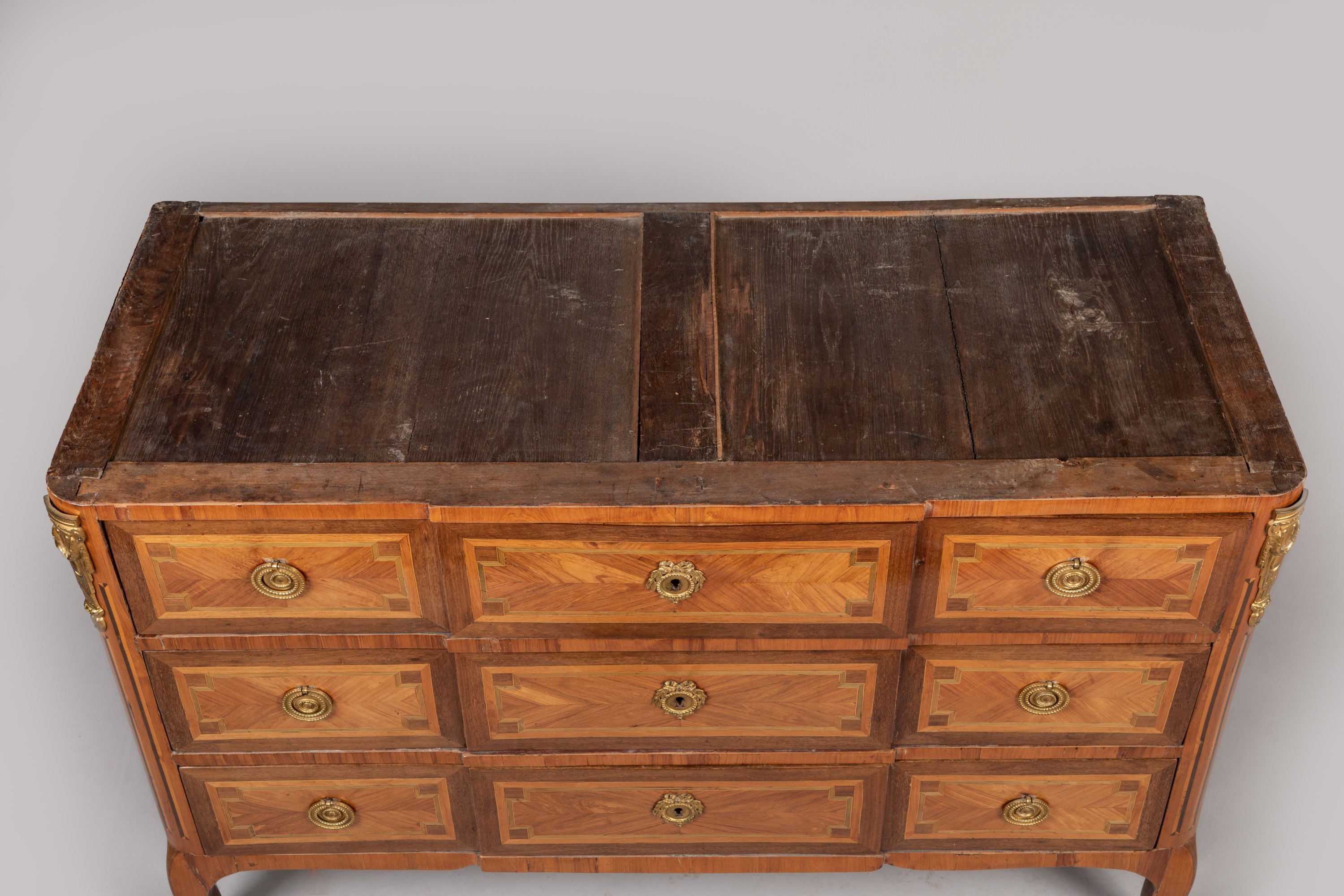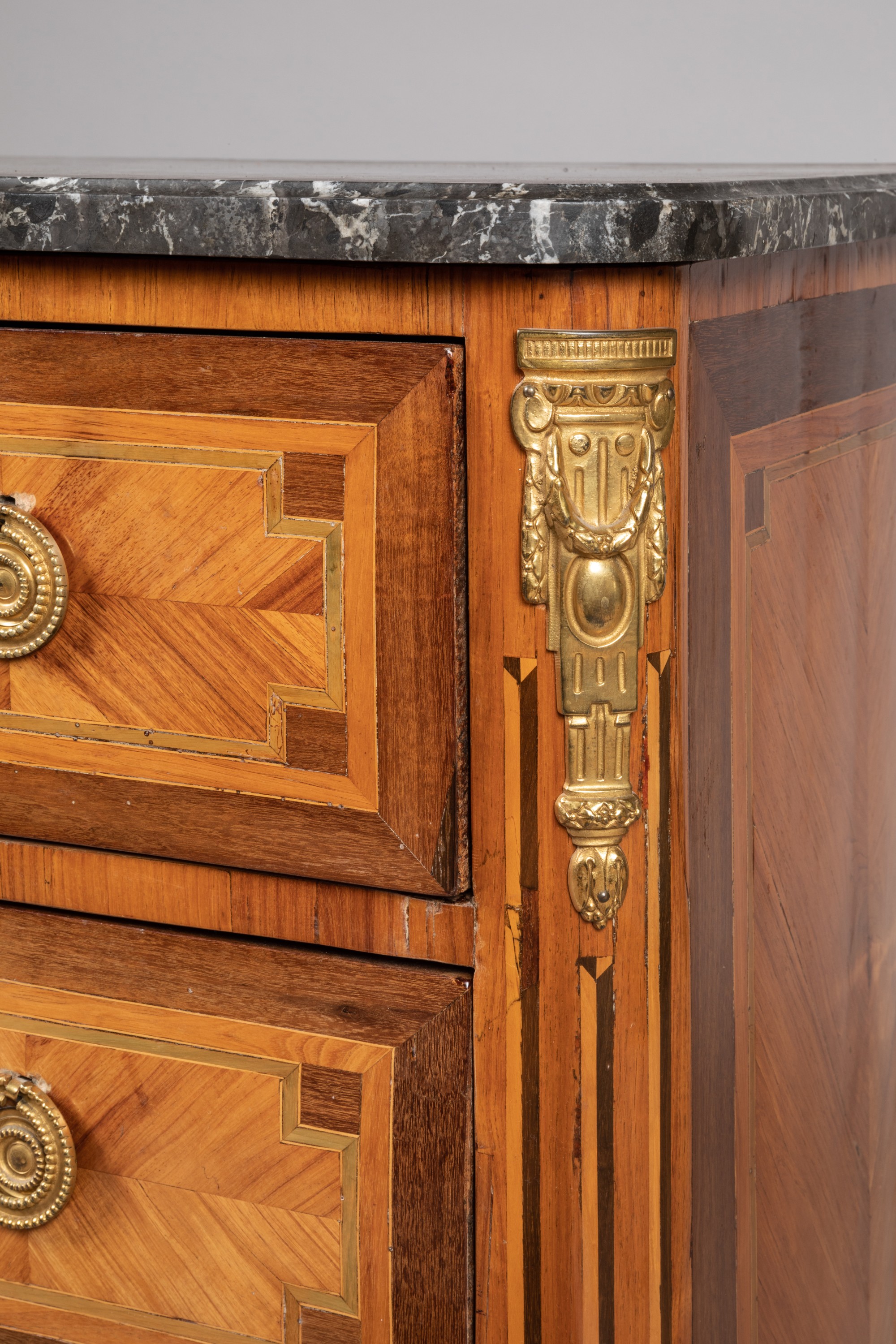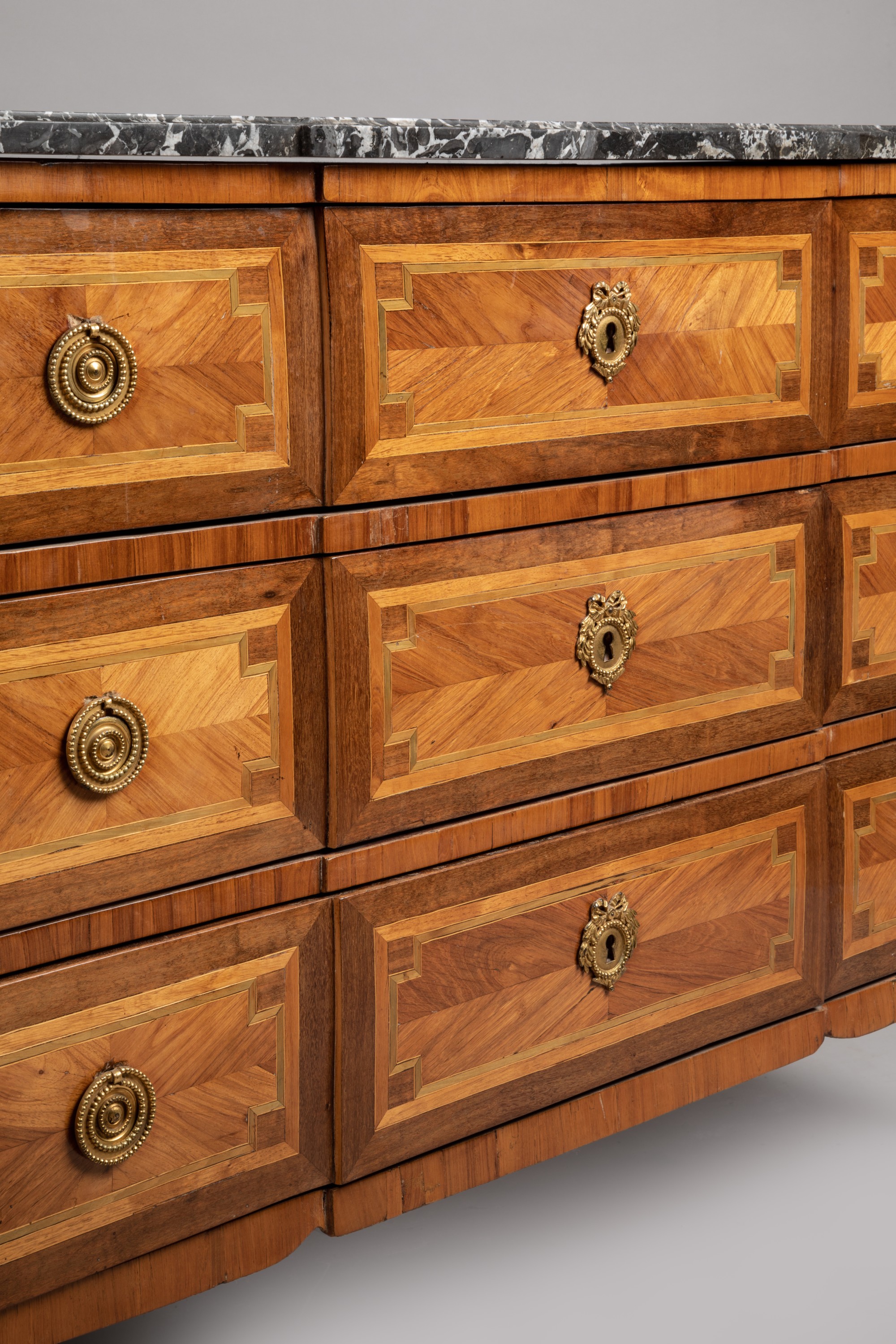 A Transition period rosewood veneer chest of drawers. Bronze ornamentation and marble top added subsequently. Apocryphal "Saunier" stamp.