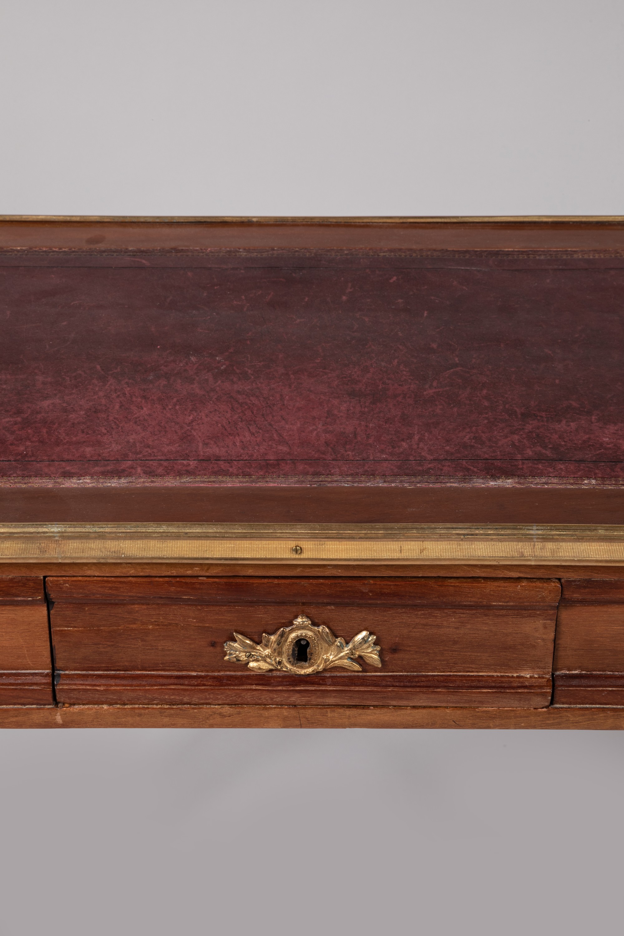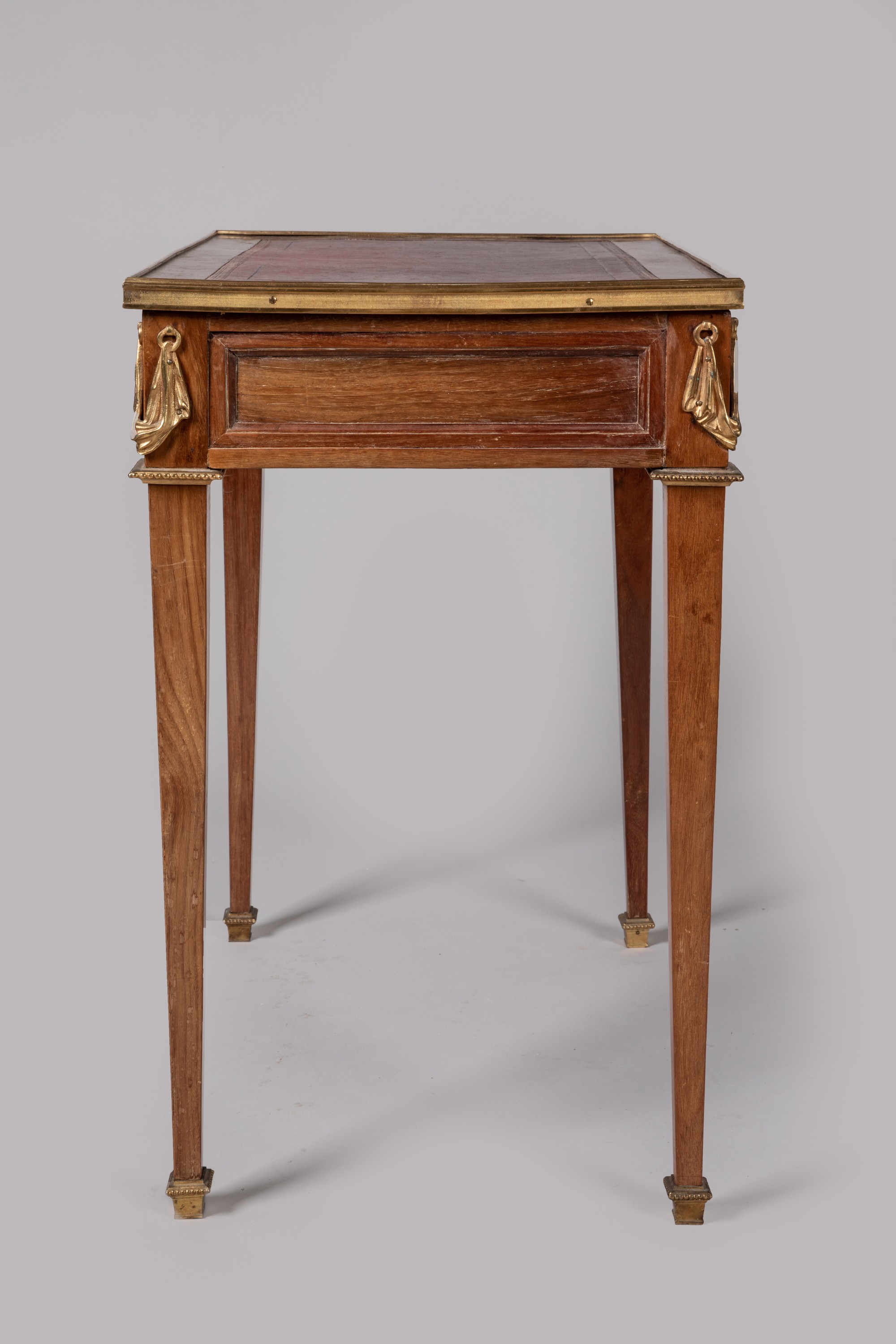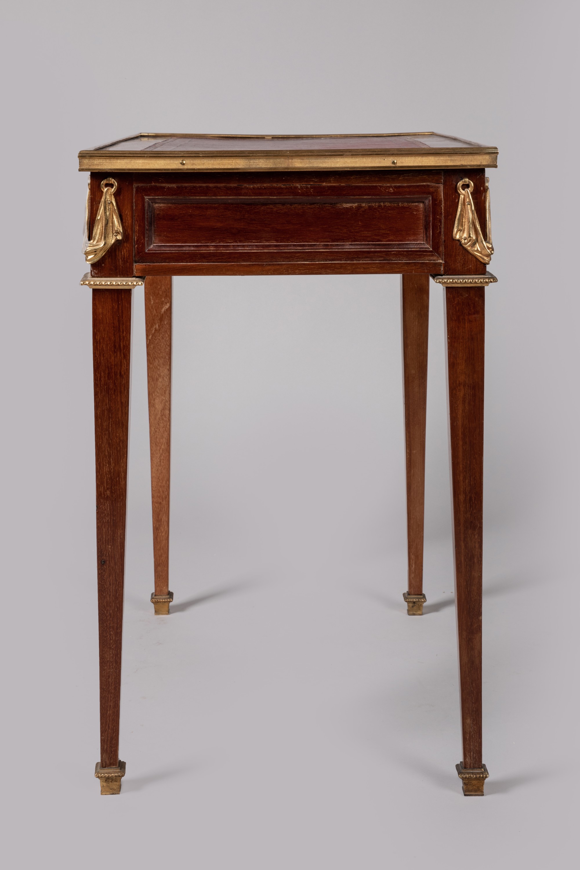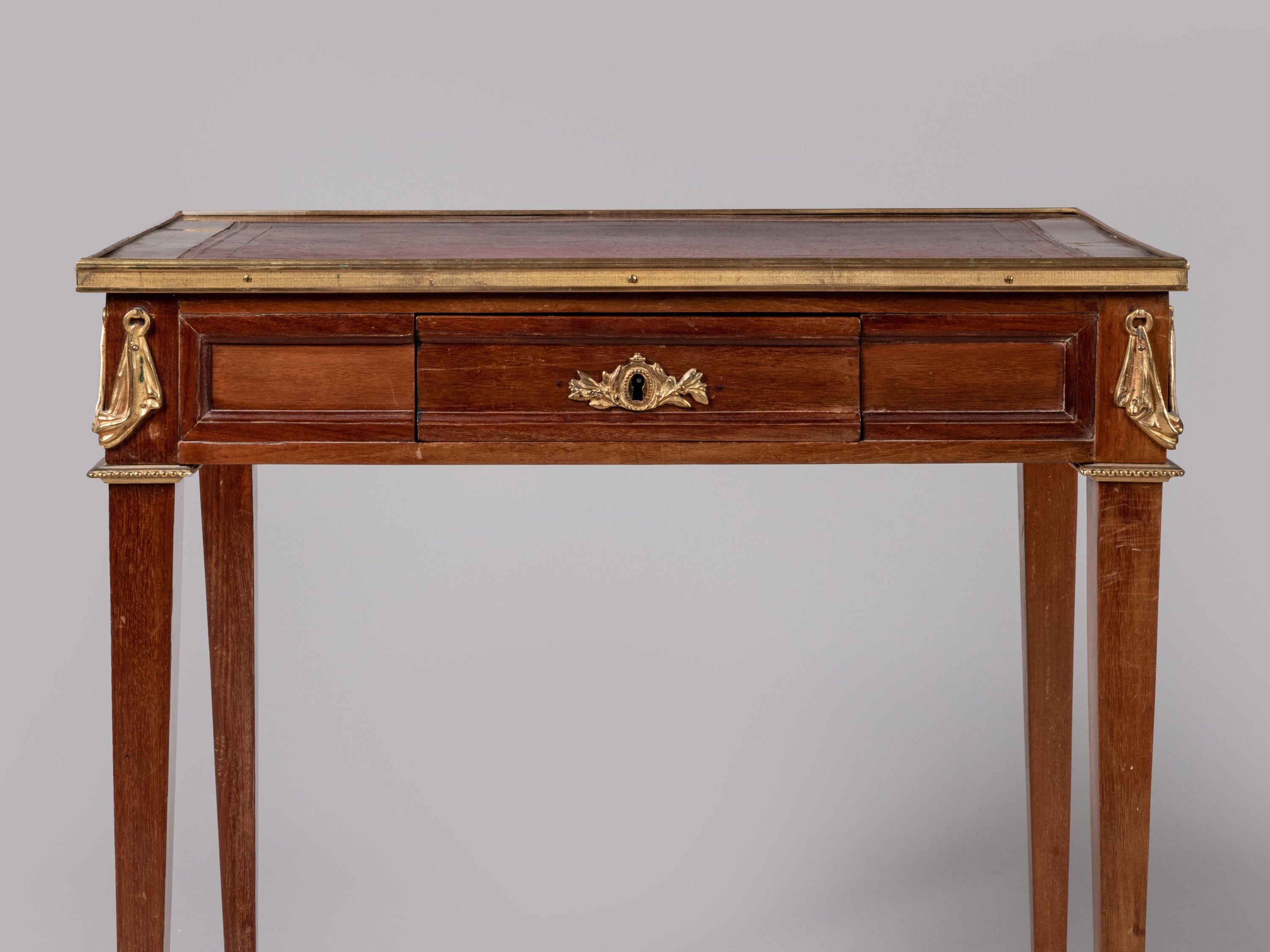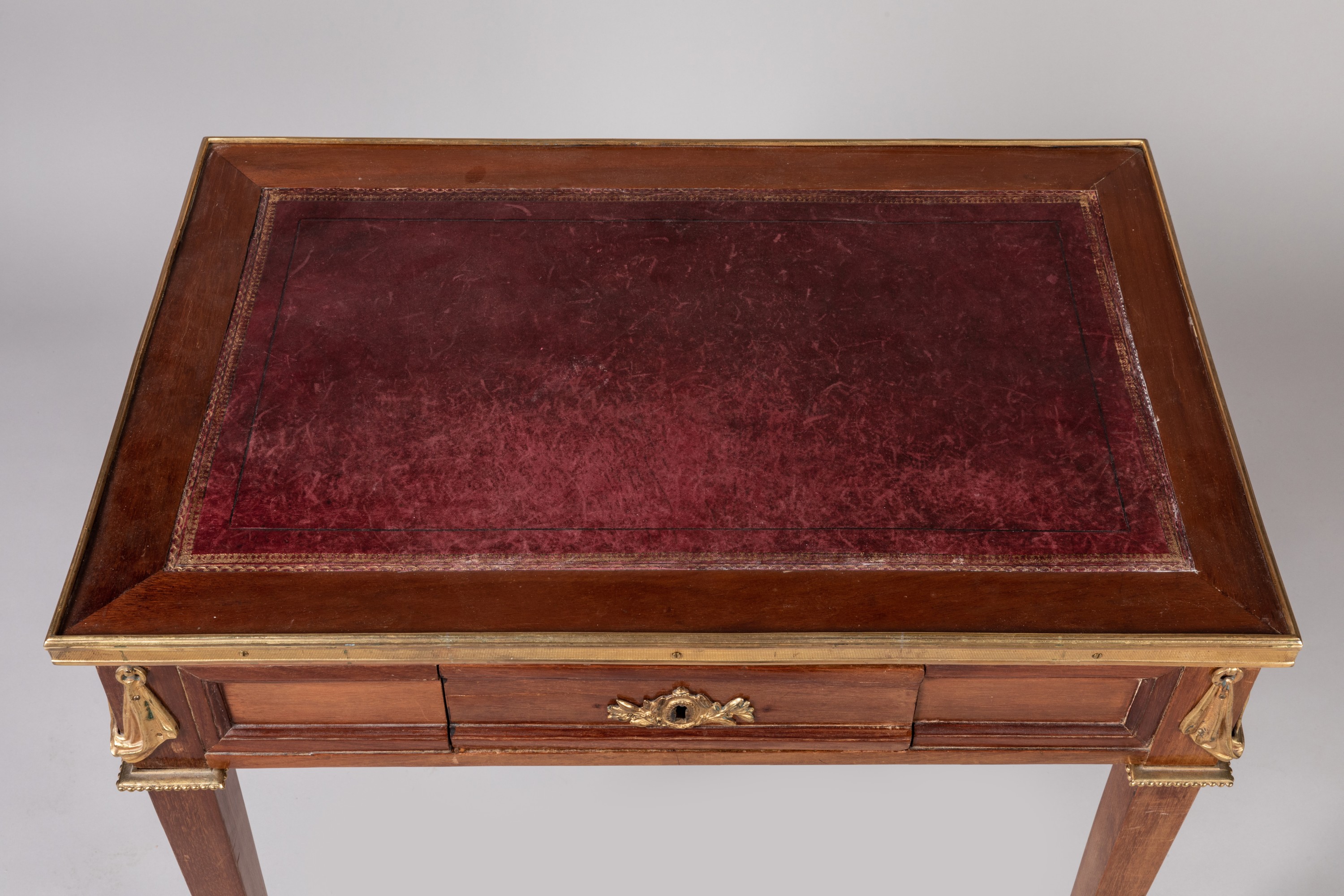 en acajou et placage d'acajou de forme rectangulaire ouvrant à un tiroir en ceinture et reposant sur des pieds gainés. Dessus gainé dans un encadrement. Ornementation de bronzes dorés : draperies en chute, bagues à perles, sabots et lingotière.