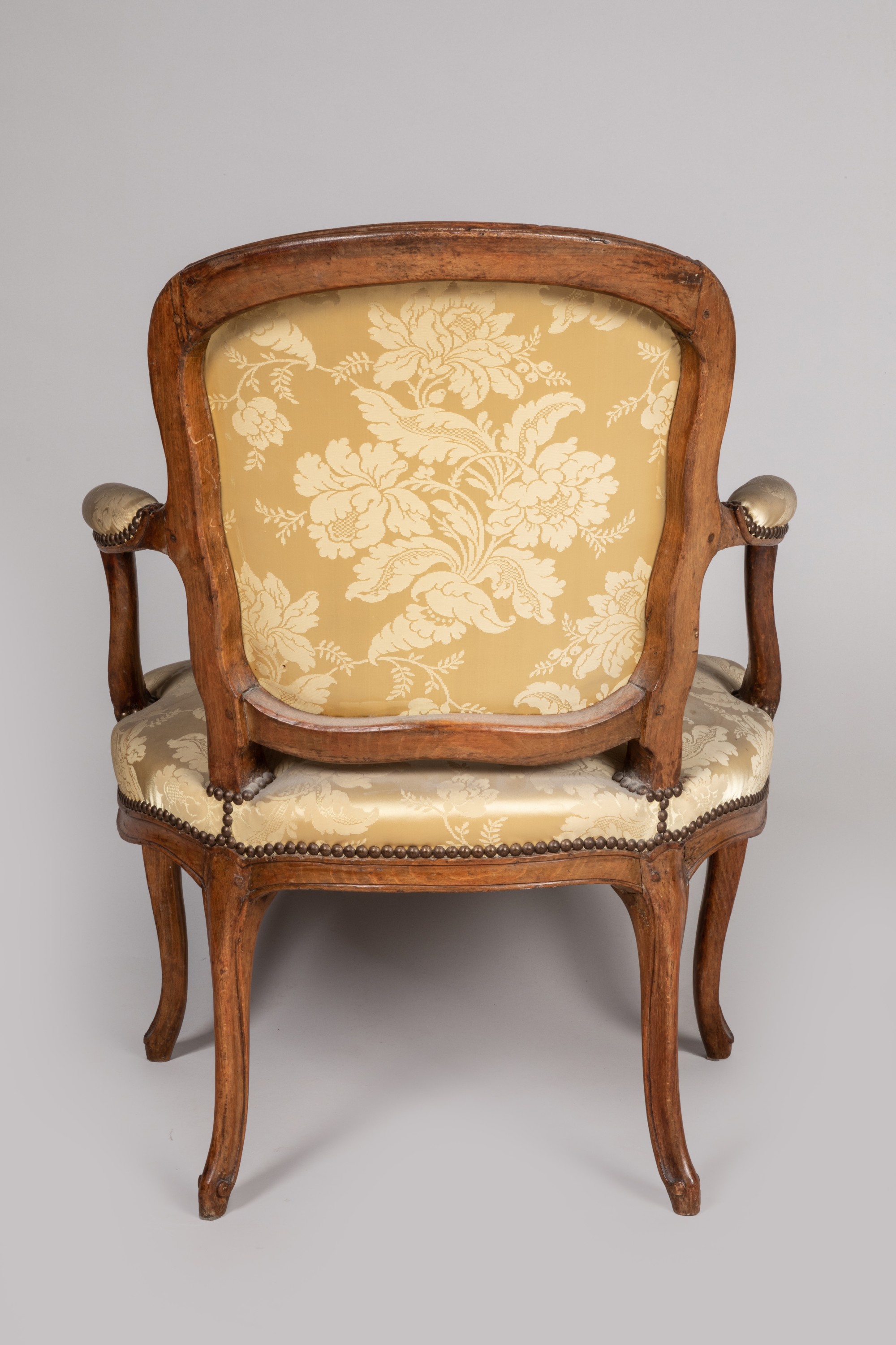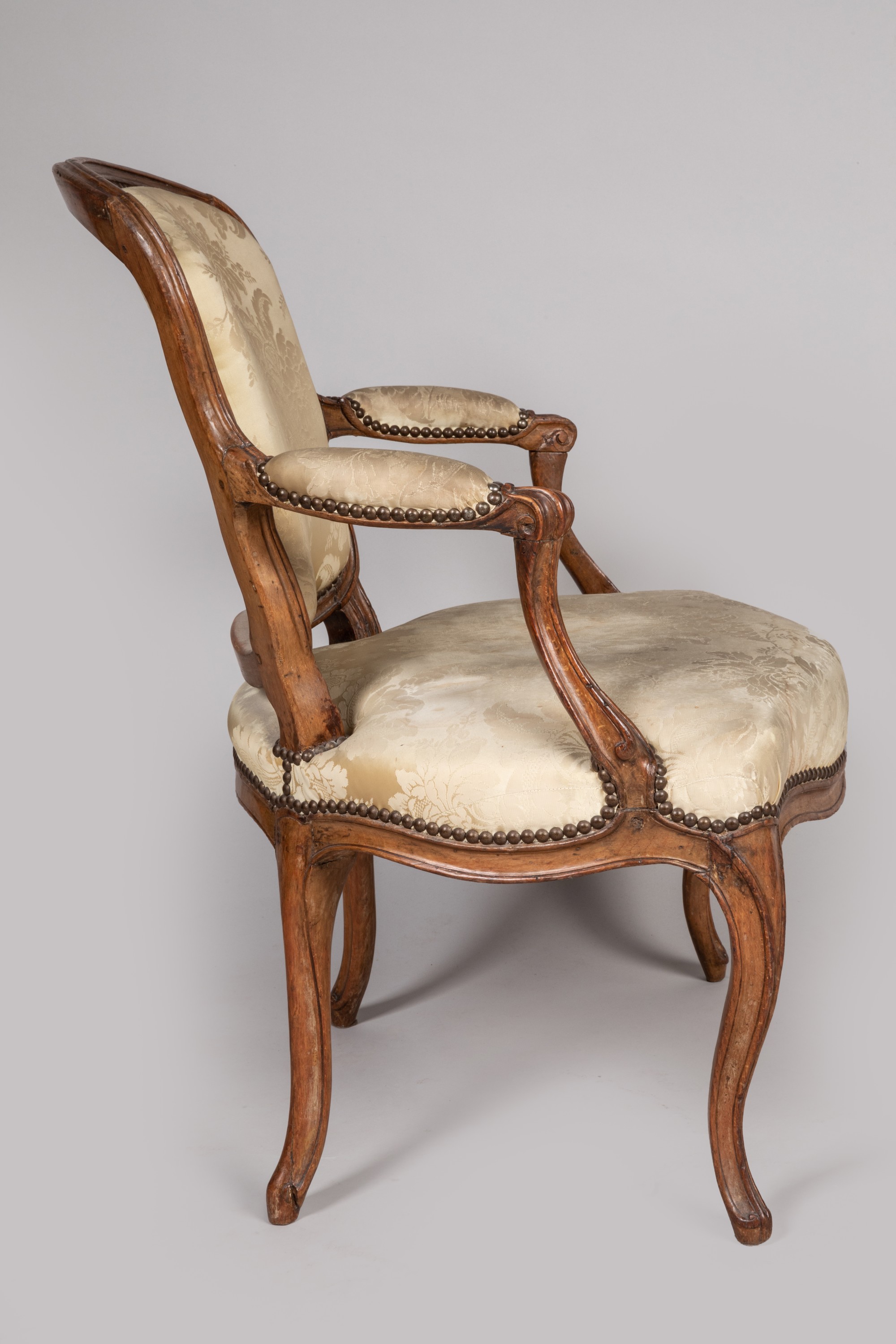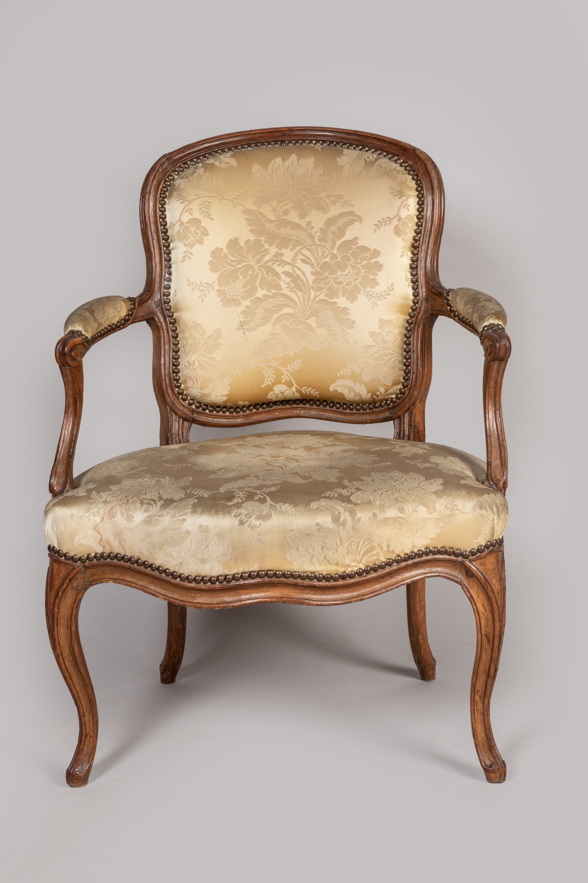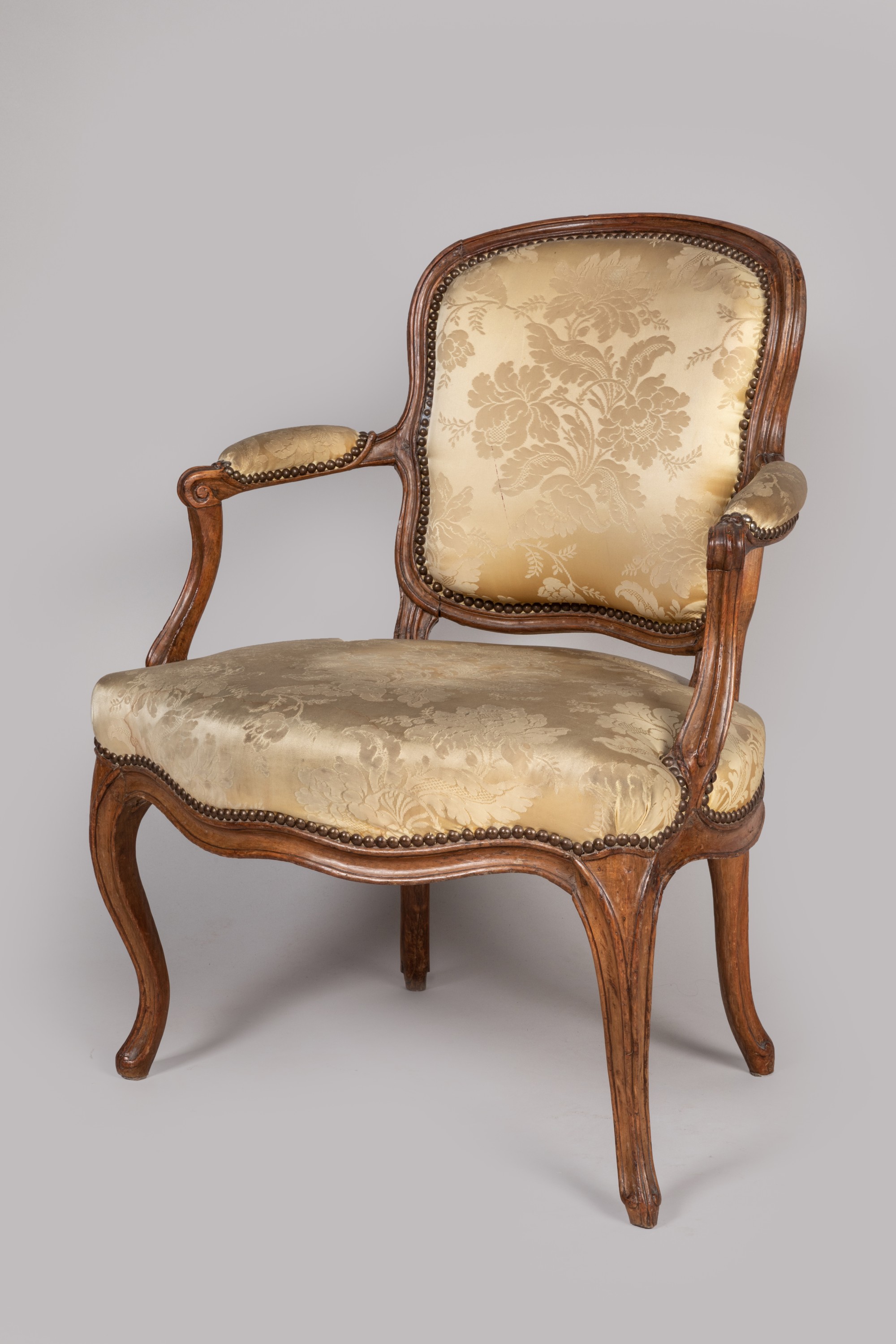 A Louis XV moulded beechwood cabriolet armchair with silk floral upholstery by Claude-Étienne Michard. Stamped "E. MICHARD".