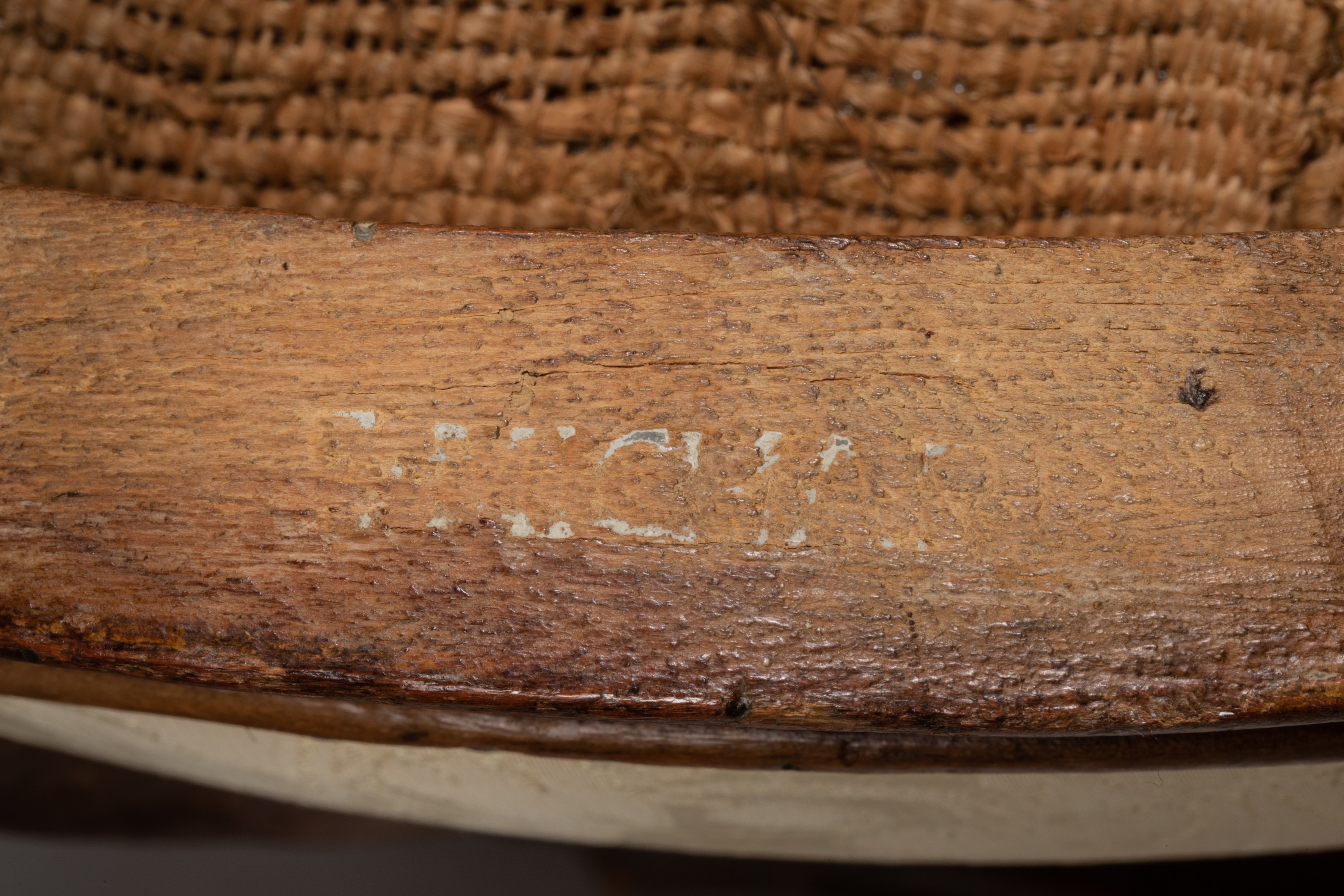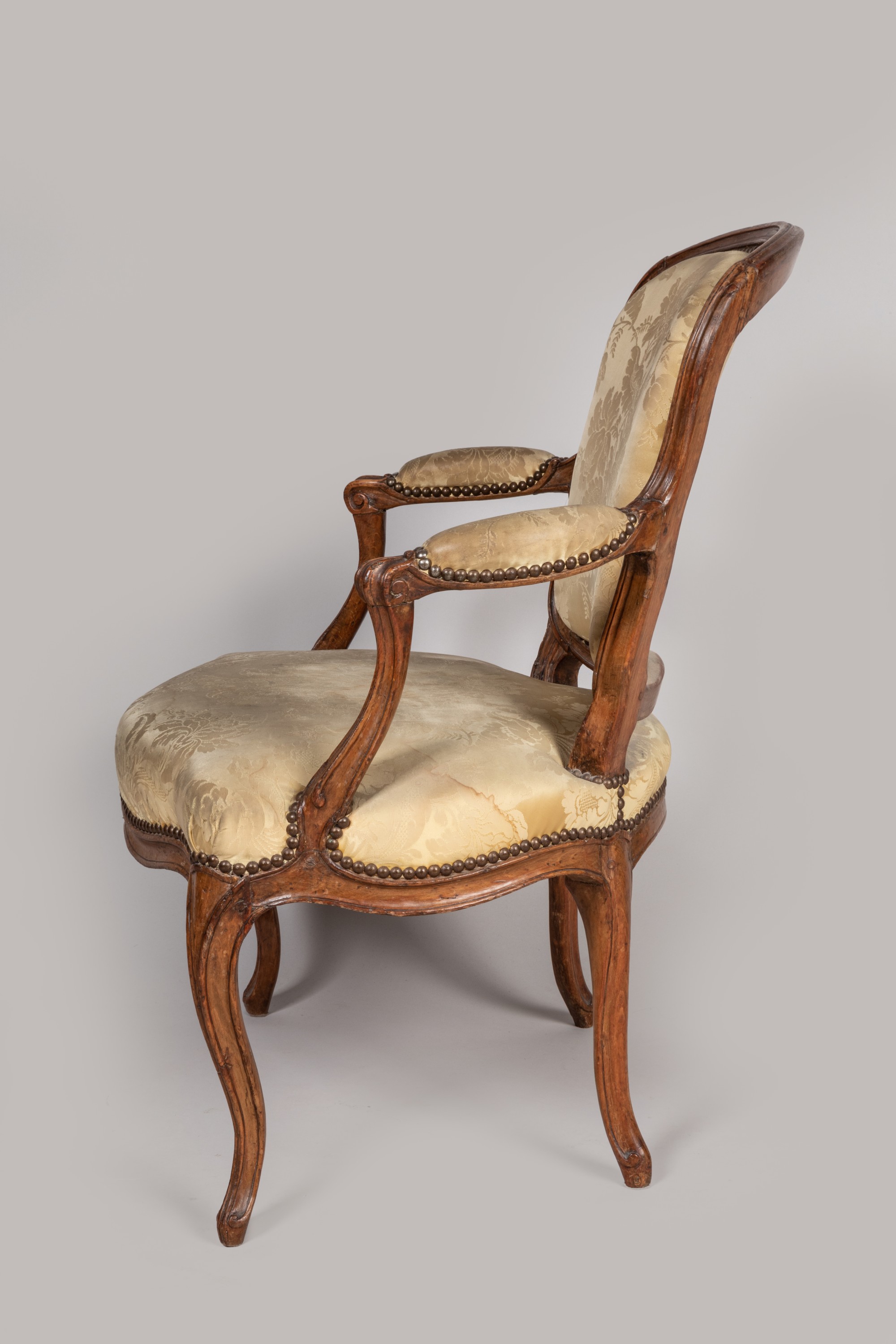 en hêtre mouluré, les accotoirs à manchettes, la ceinture chantournée. Repose sur quatre pieds cambrés.