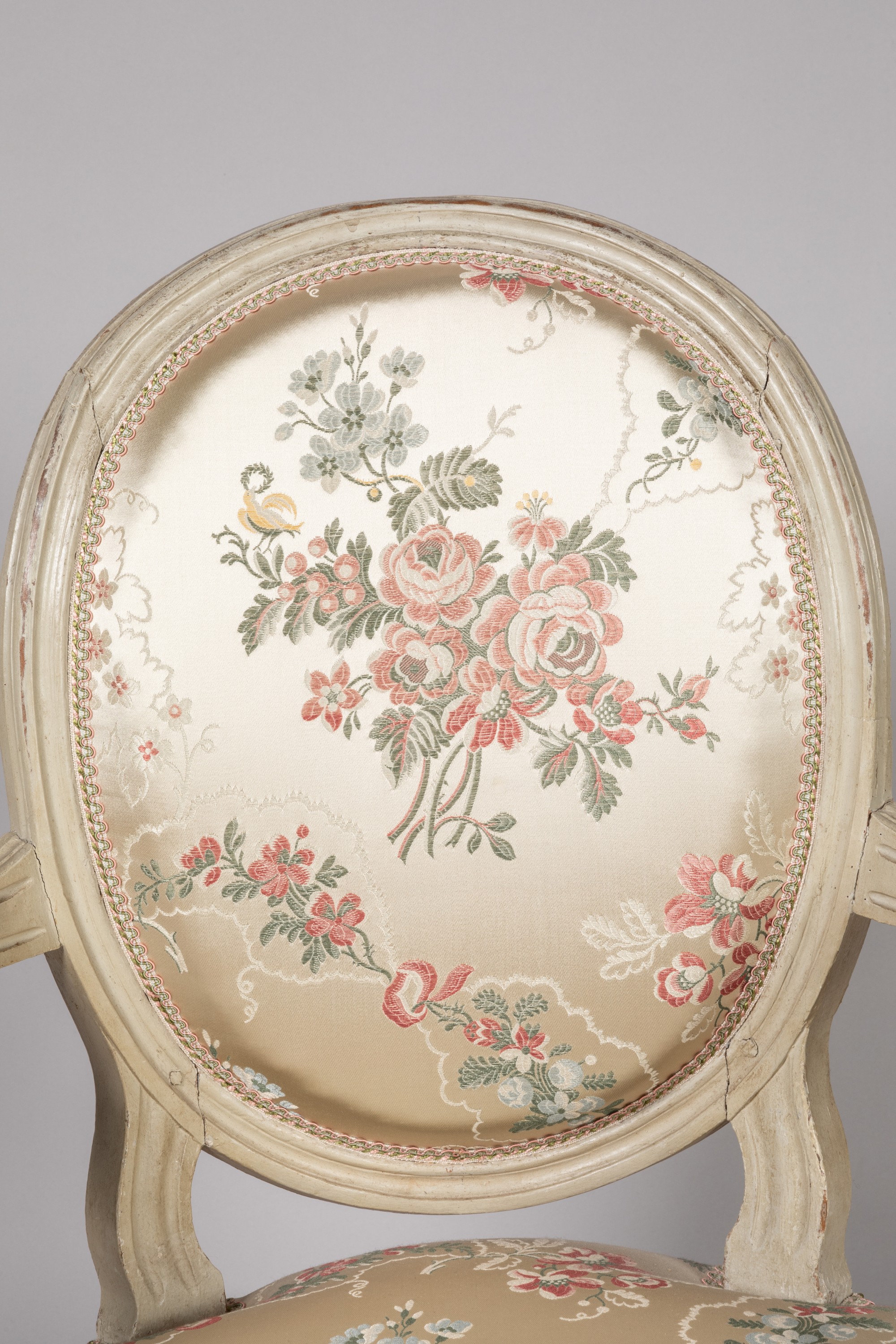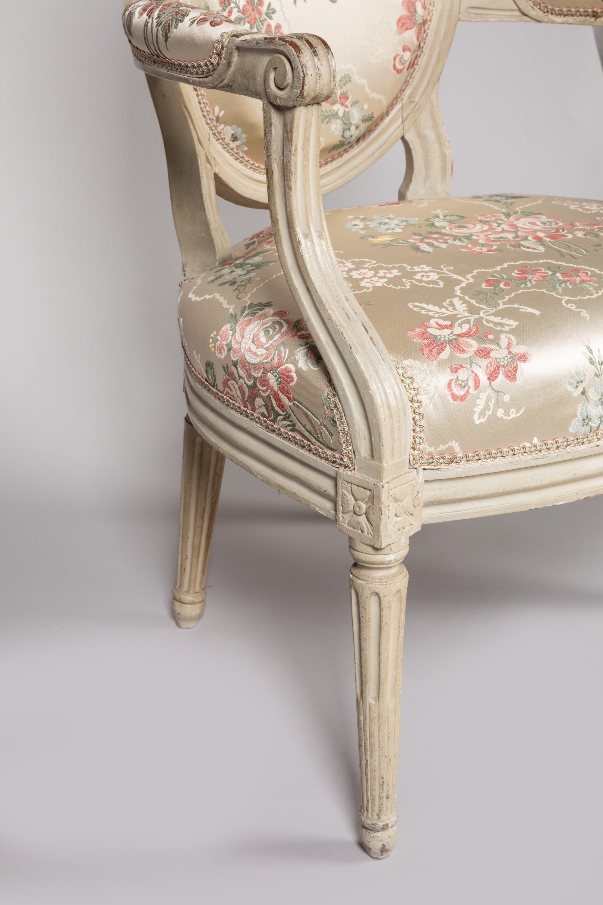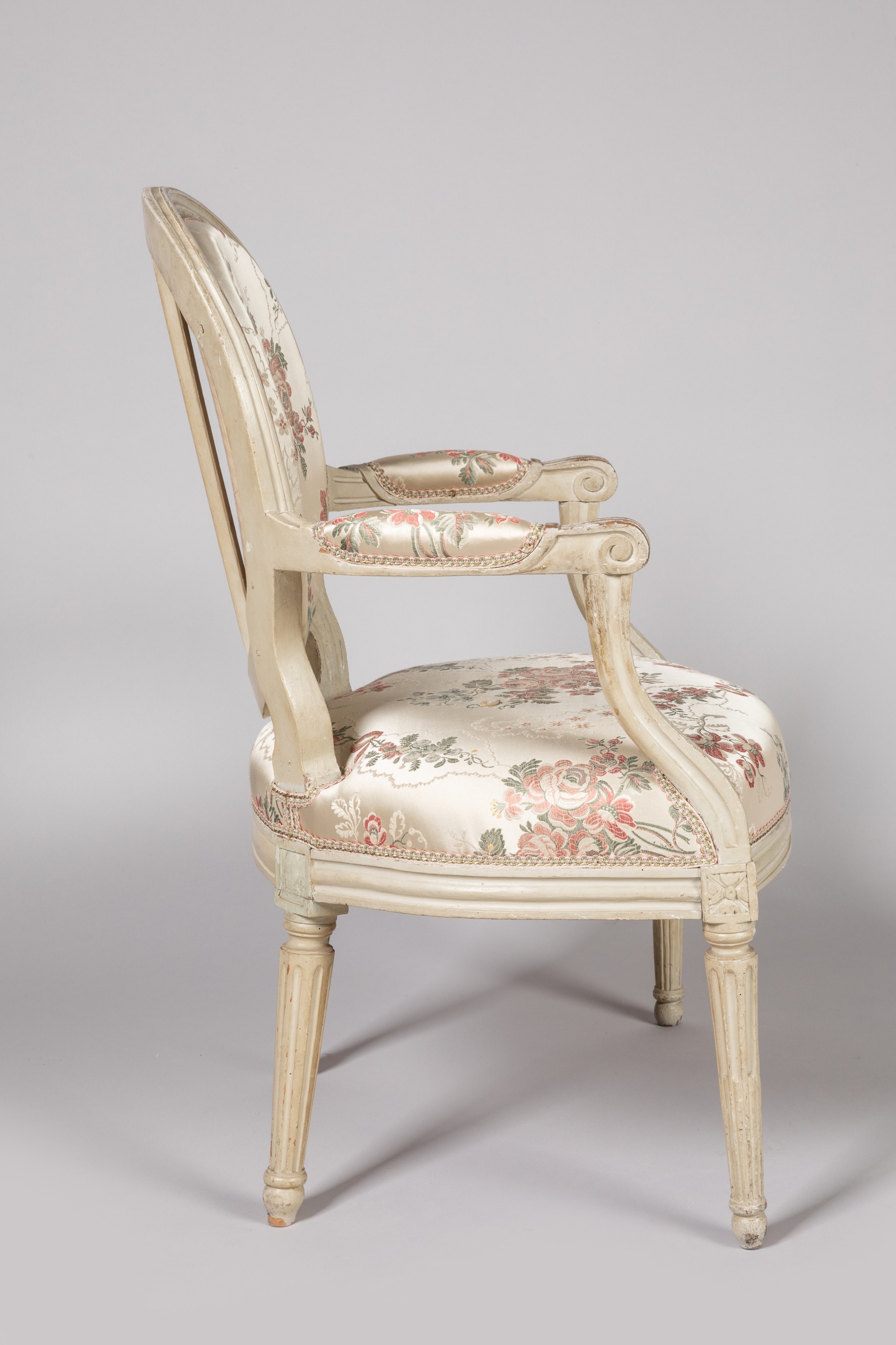 Three Louis XVI lacquered wood cabriolet armchairs. Some slight differences between them. Subsequent silk upholstery.