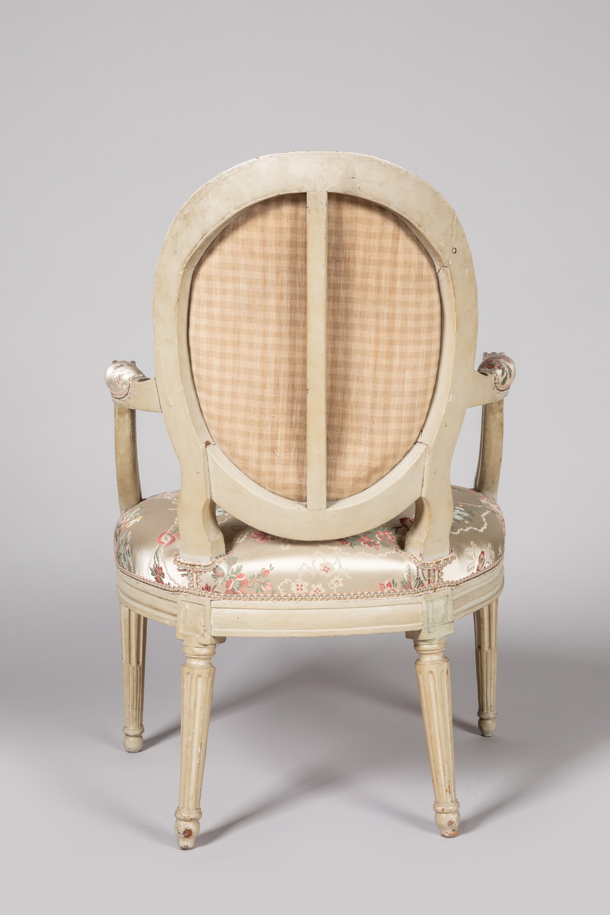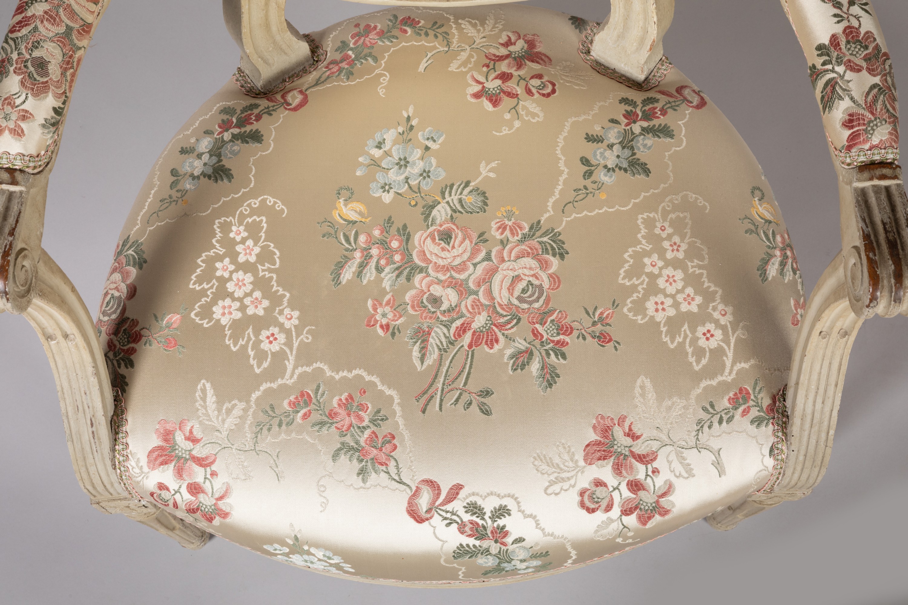 en bois laqué. Les bras à manchettes garnies reposent sur des supports en console, prolongés sur des pieds fuselés à cannelures, et pour deux d’entre eux soulignés de rudentures. Décors d’enroulements et dés de raccordements à rosettes.