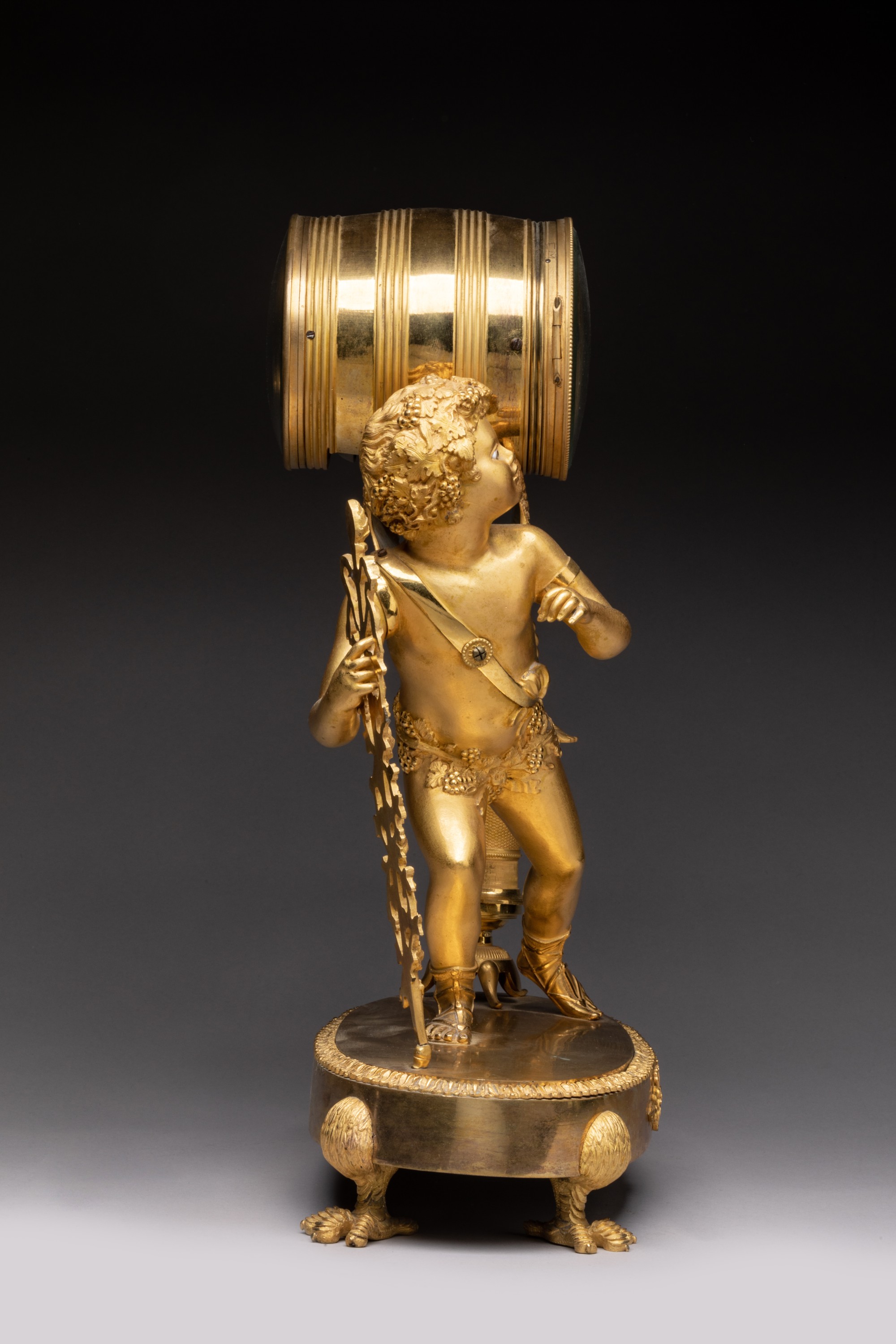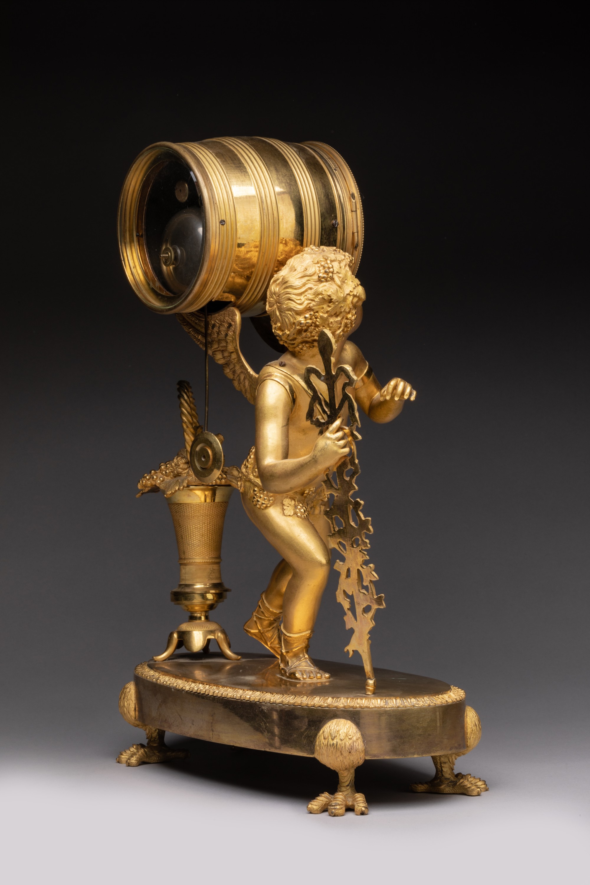 en bronze doré et ciselé. L'amour ailé tenant de sa main droite un caducée. Il porte sur son dos un tonneau dans lequel est inscrit le cadran en émail blanc. Il est cerclé d'un chemin de fer par tranche de quinze en chiffres arabes et indique les heures en chiffres romains. La terrasse présente une applique à décor végétal. L'ensemble repose sur quatre pieds d'autruche.