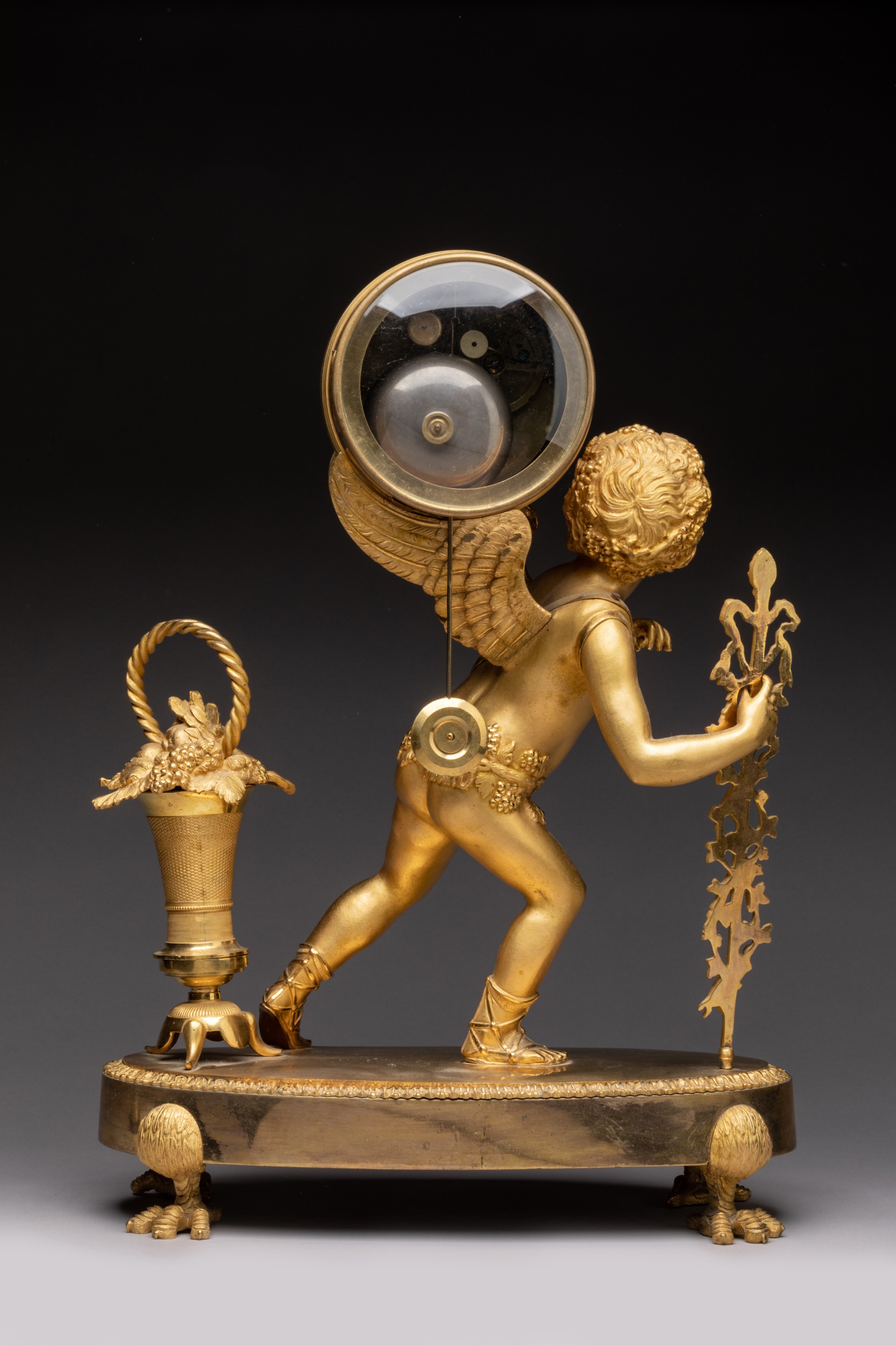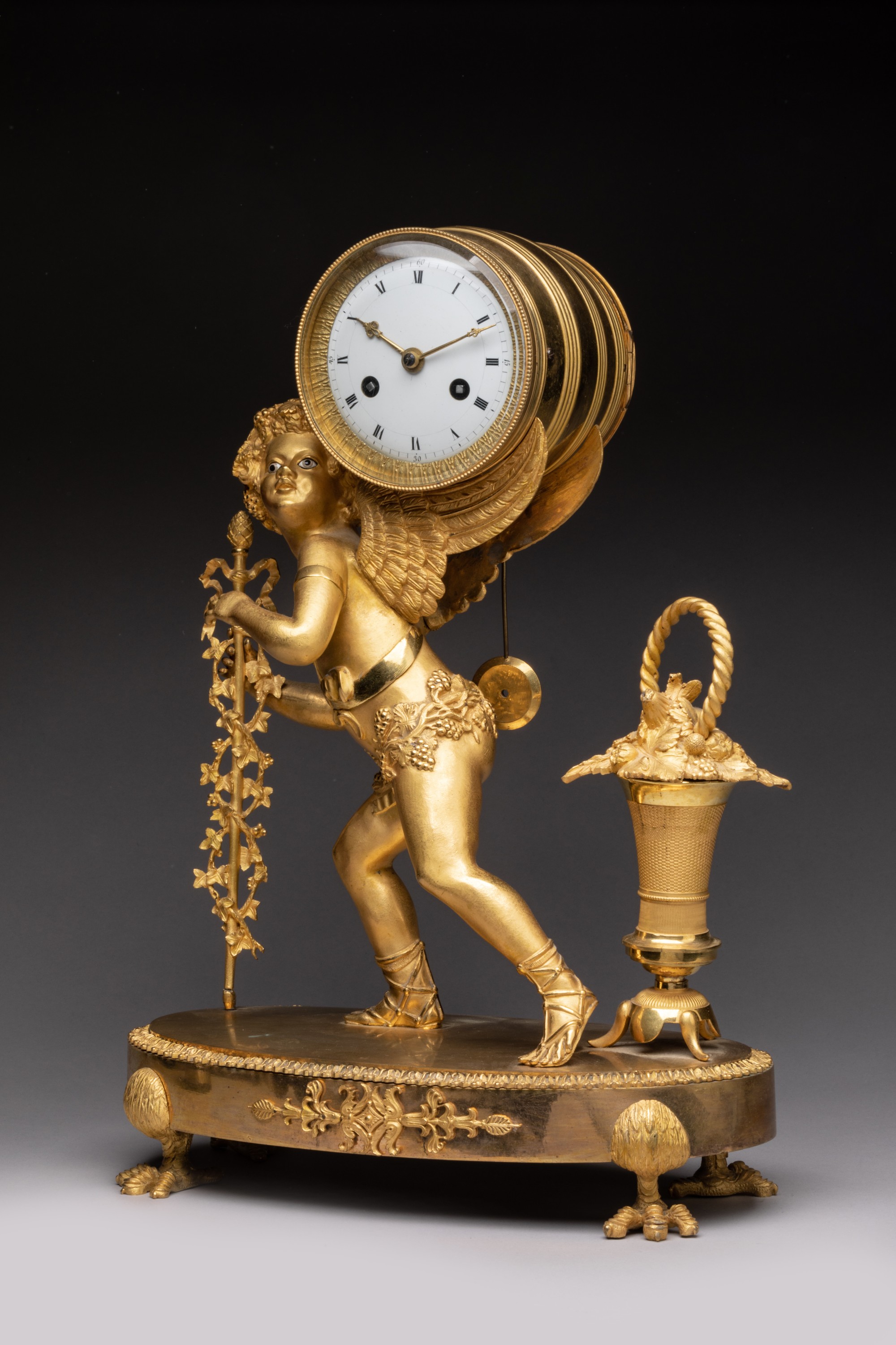 A gilded and chiseled bronze clock depicting Love as a winemaker. Based on a model attributed to Jean-Simon Deverberie. Empire-Restauration period. Numbered "2I36" and "36".