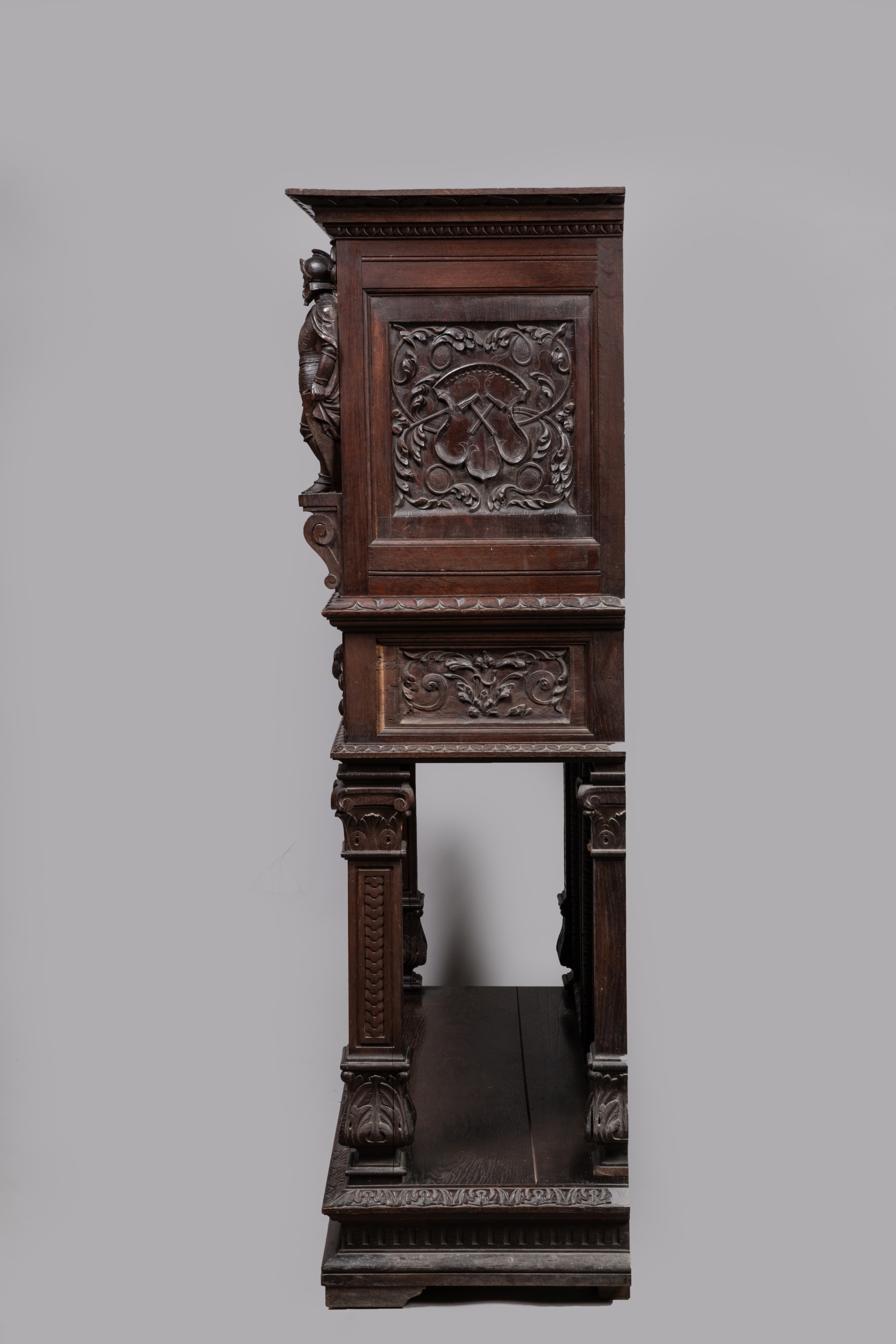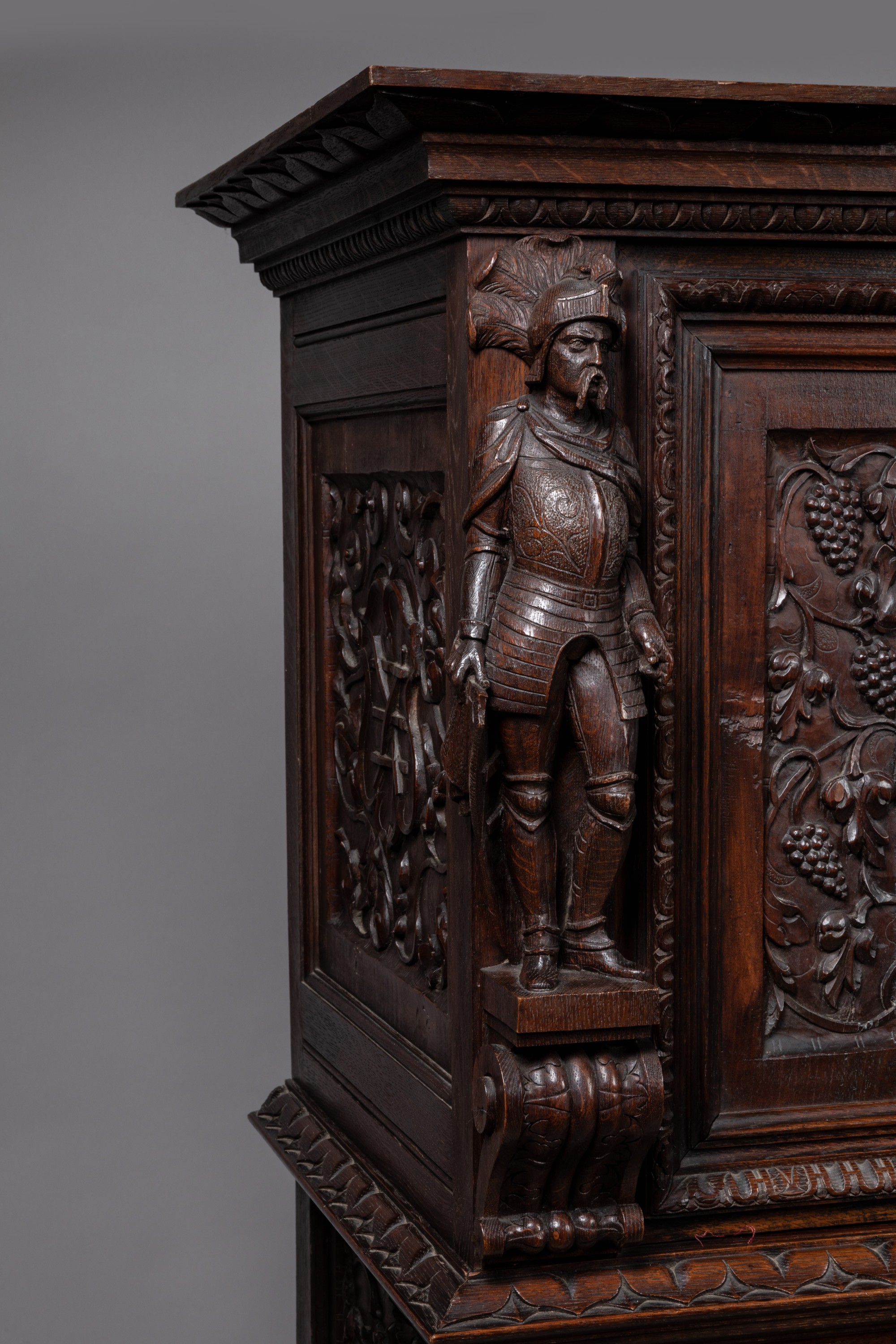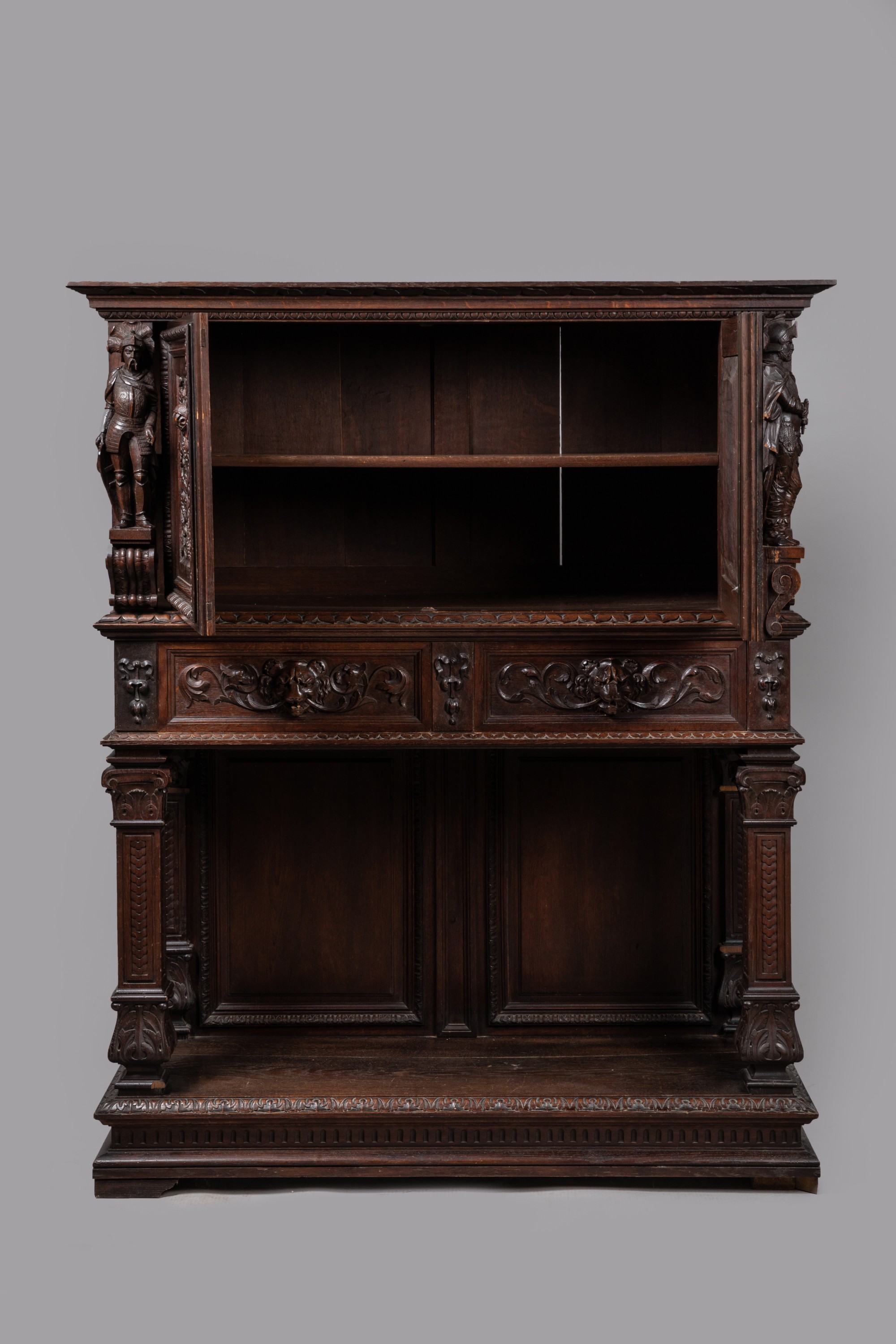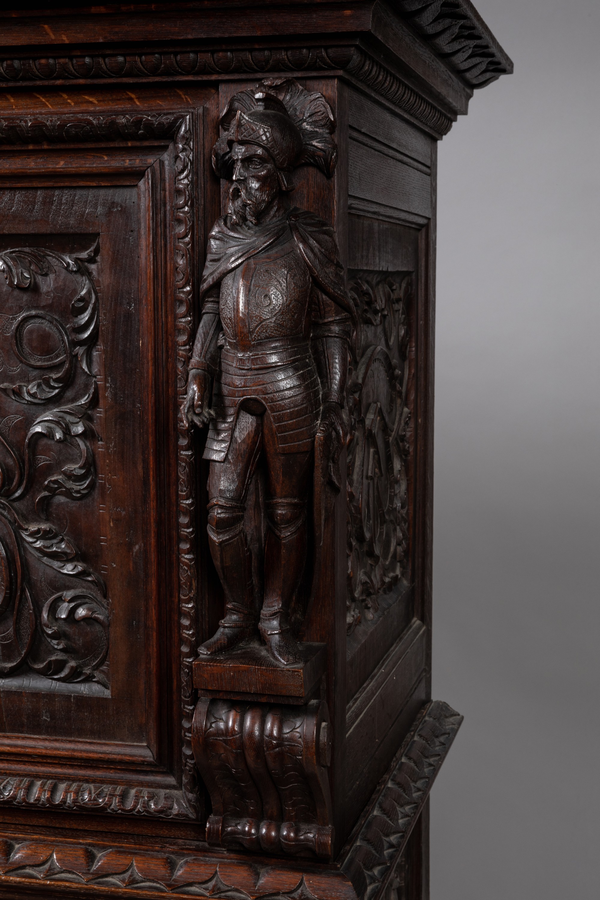 A Neo-Renaissance style moulded and carved oak credenza decorated with ronde-bosse warriors. Late 19th century.