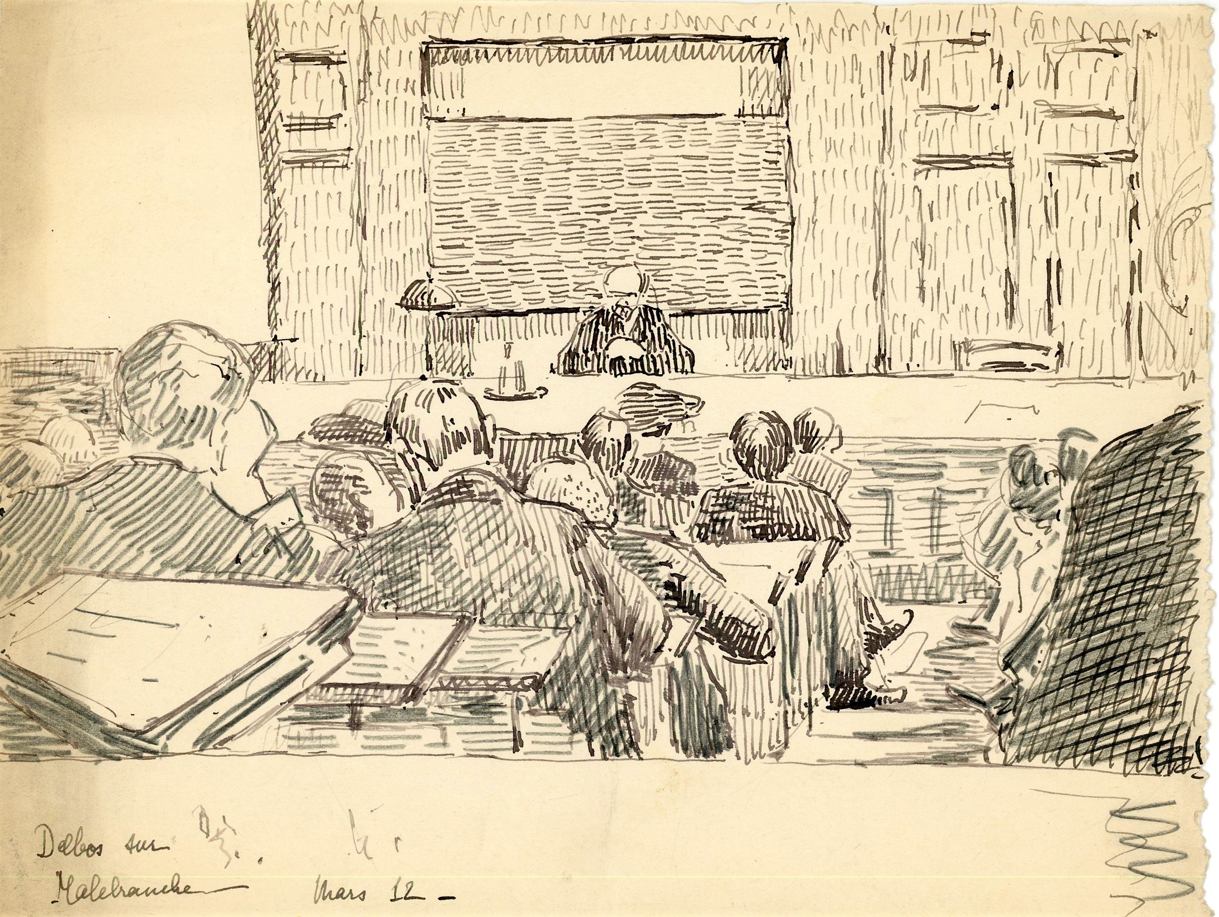 - Divers croquis et notes manuscrites de R.M. dont appel à participer à la chorale, correspondance de camarades, silhouettes de professeurs et délèves ;