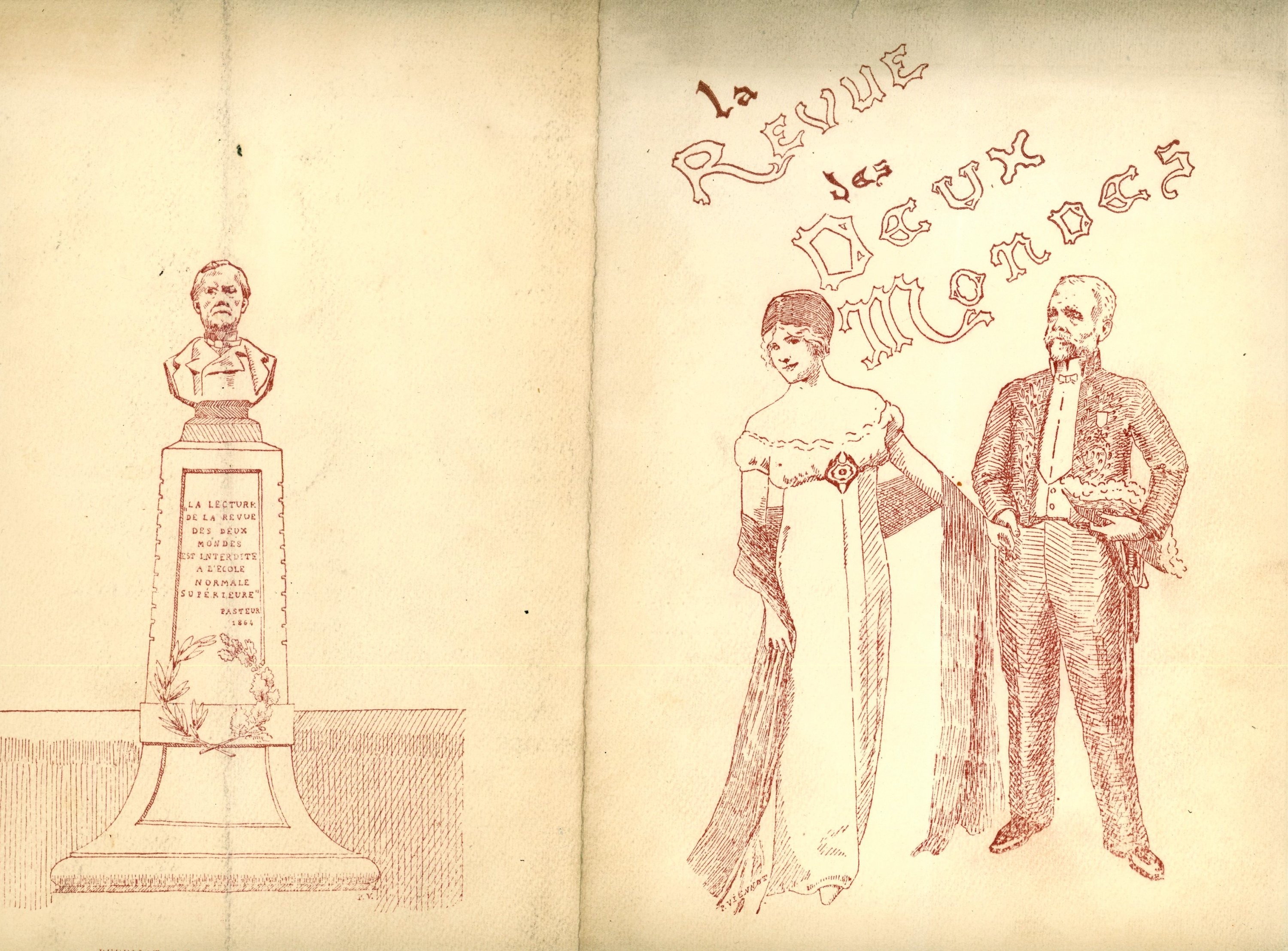 - Croquis à la plume par R.M. de divers personnages de lENS (Beaumont, Dupuy, le père Fisher), notamment croqué au cours de linstruction militaire surnommée « Le Bonvoust »; et brouillons de croquis et programme confectionné par R.M. pour des représentations théâtrales à lENS (Les comptes fantastiques, Les Jocondes, Agathon rompu).