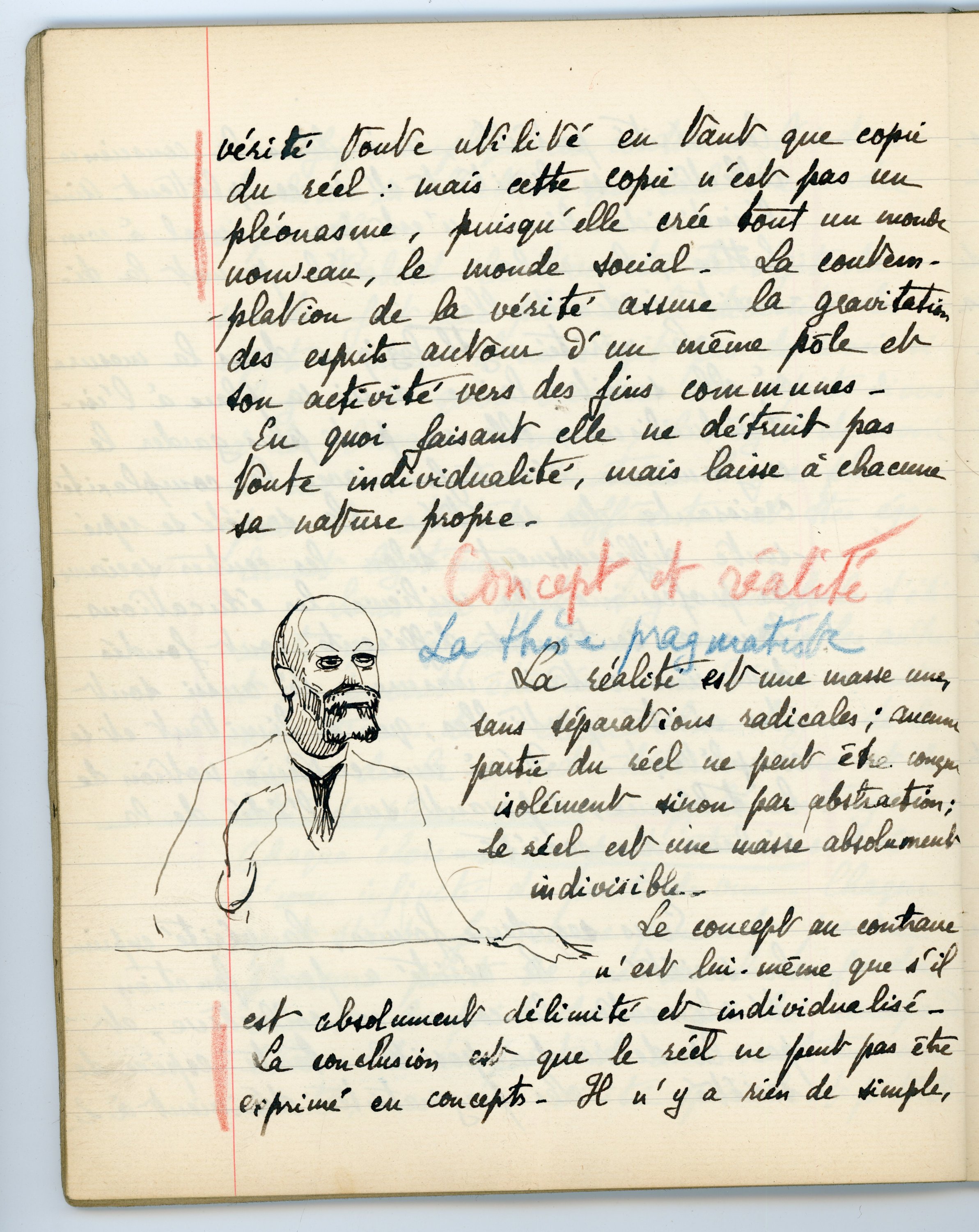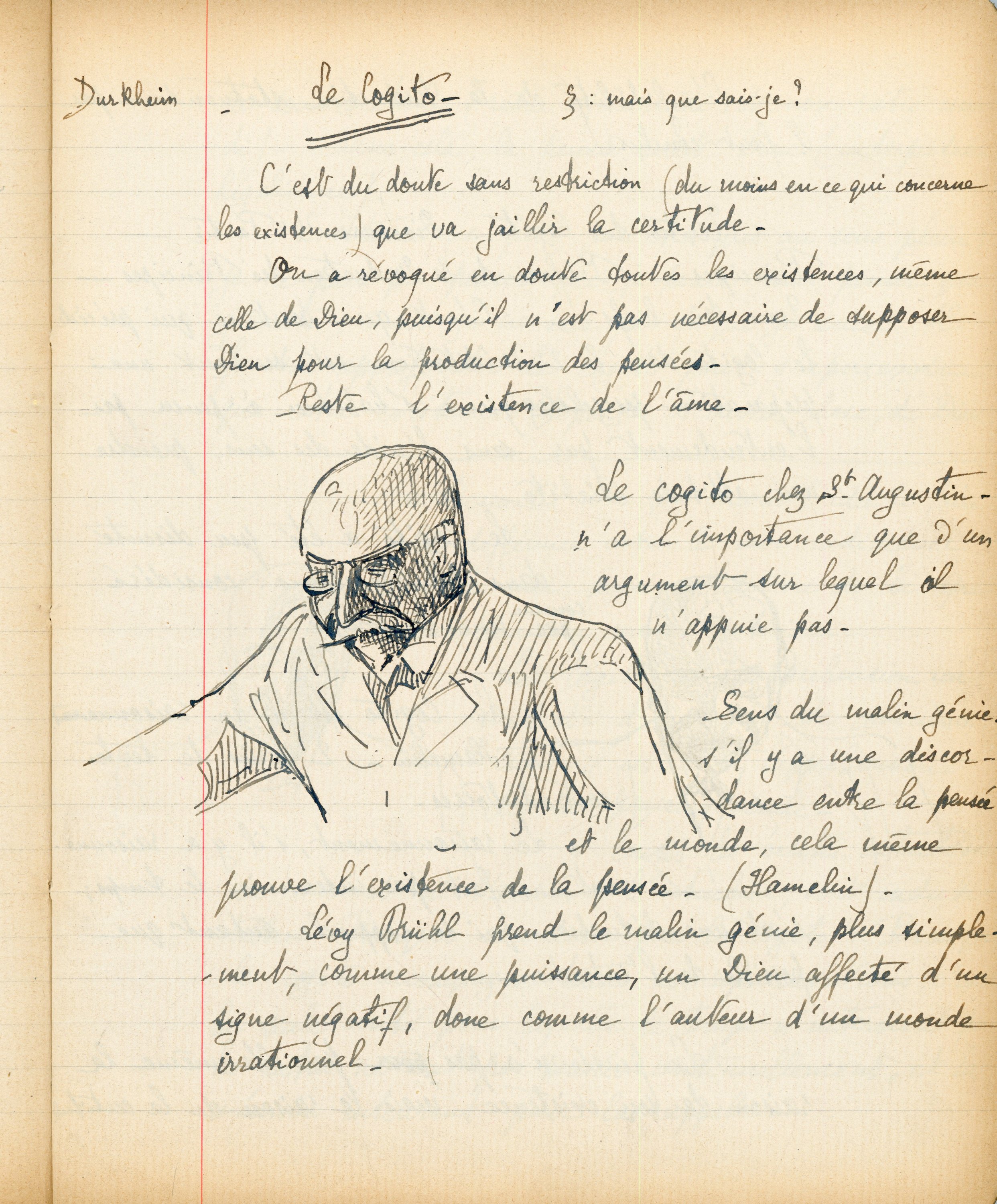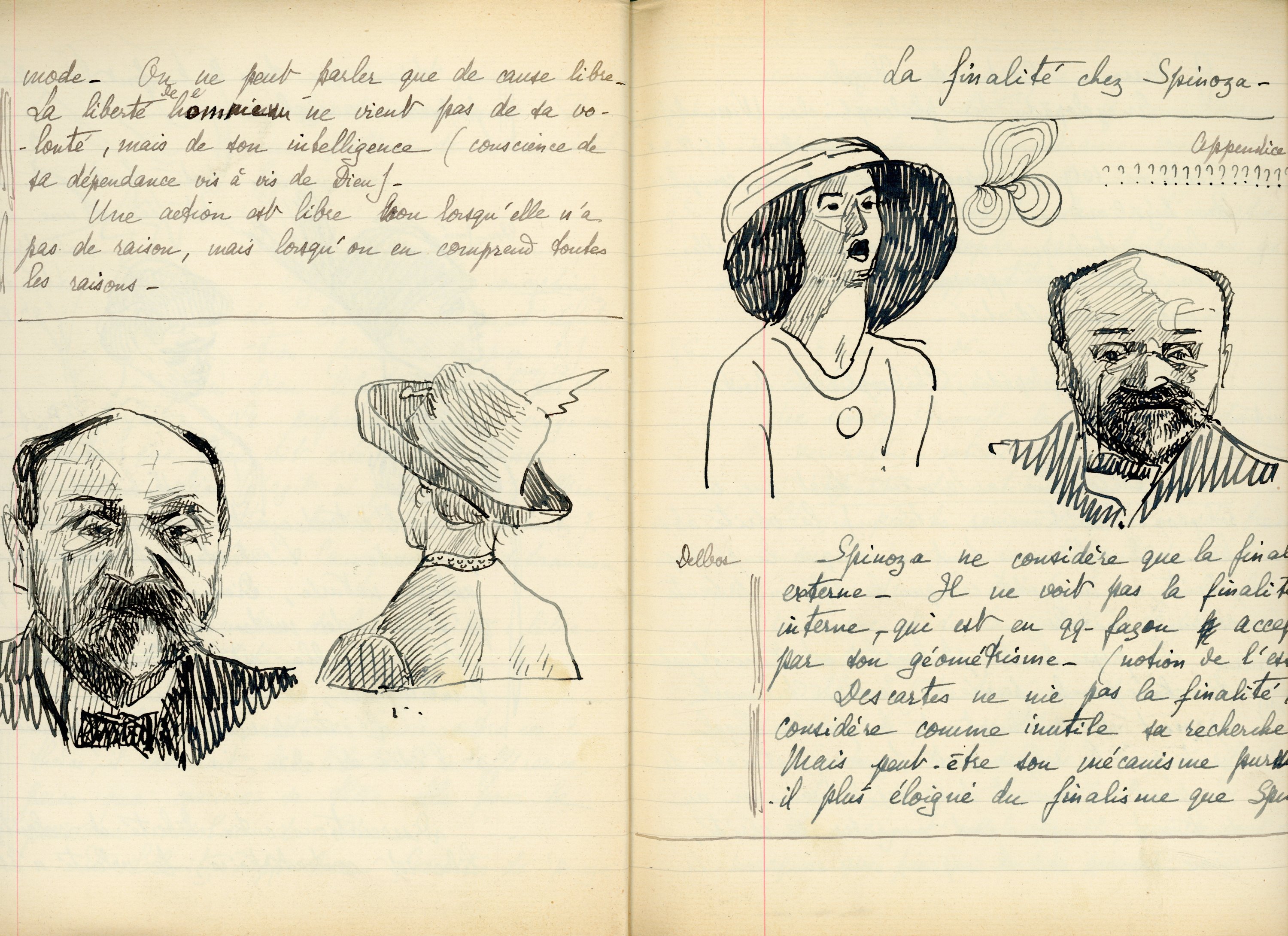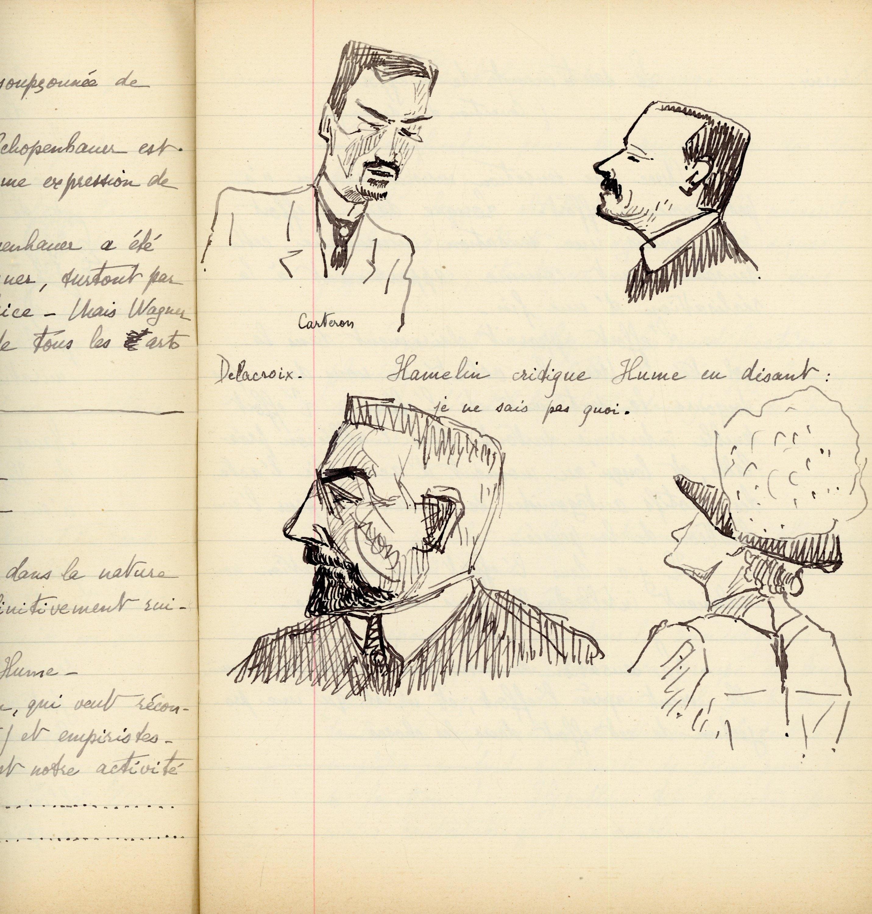- 18 cahiers de notes prises lors de conférences et de cours magistraux, in-4, tous titrés en couverture, la plupart illustrés par les portraits des intervenants ou camarades croqués à l'encre par René Maublanc (Célestin Bouglé, Victor Delbos, Lucien Lévy-Bruhl, Henri Bergson, Gaston Milhaud, Emile Durkheim, Henri Delacroix, Mademoiselle Daste, Jean Guéhenno, etc) ;
