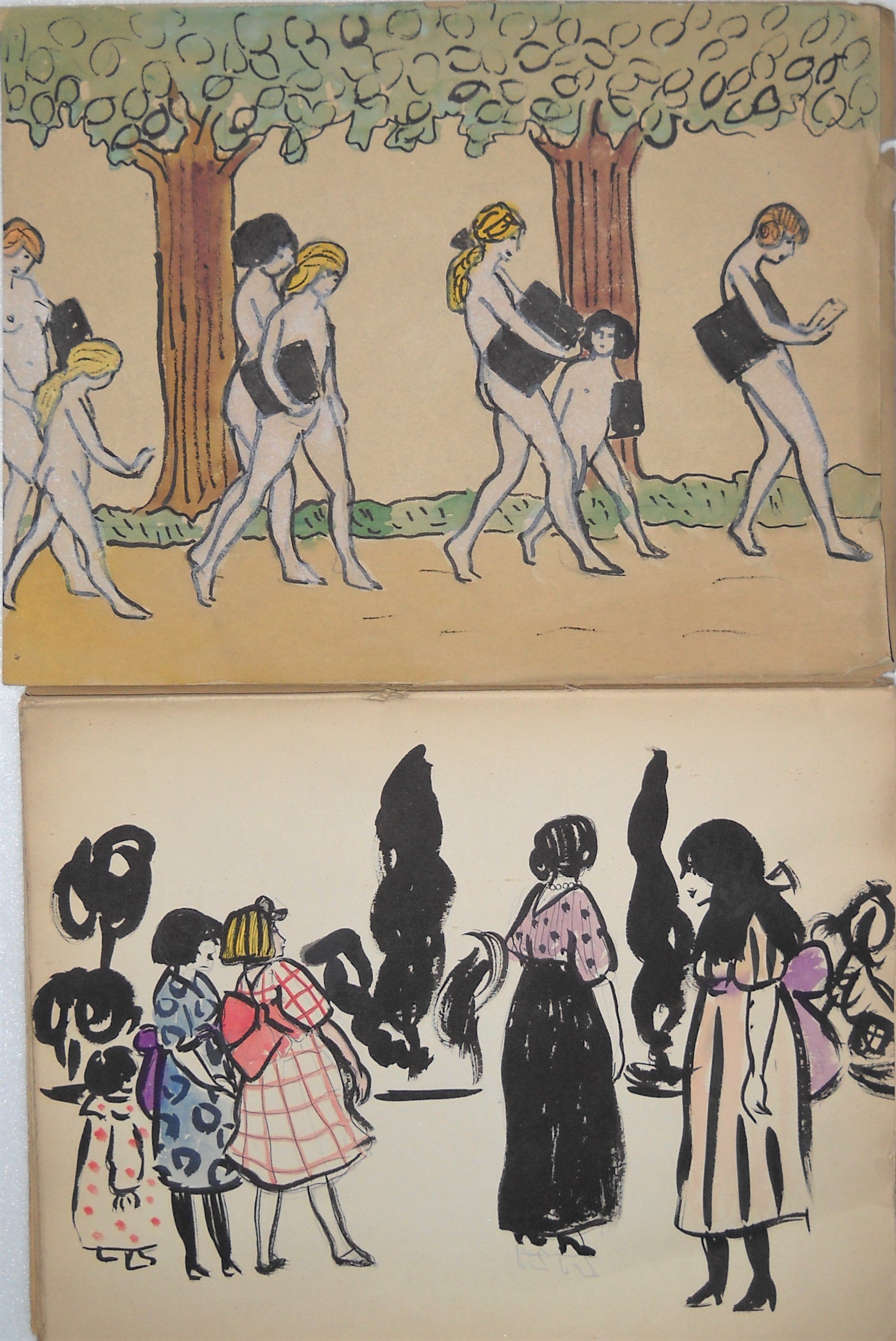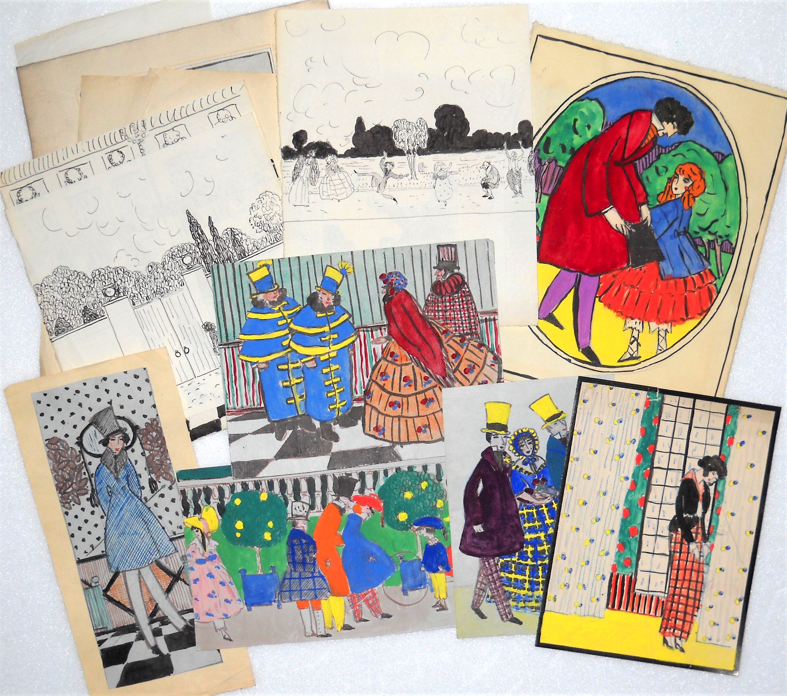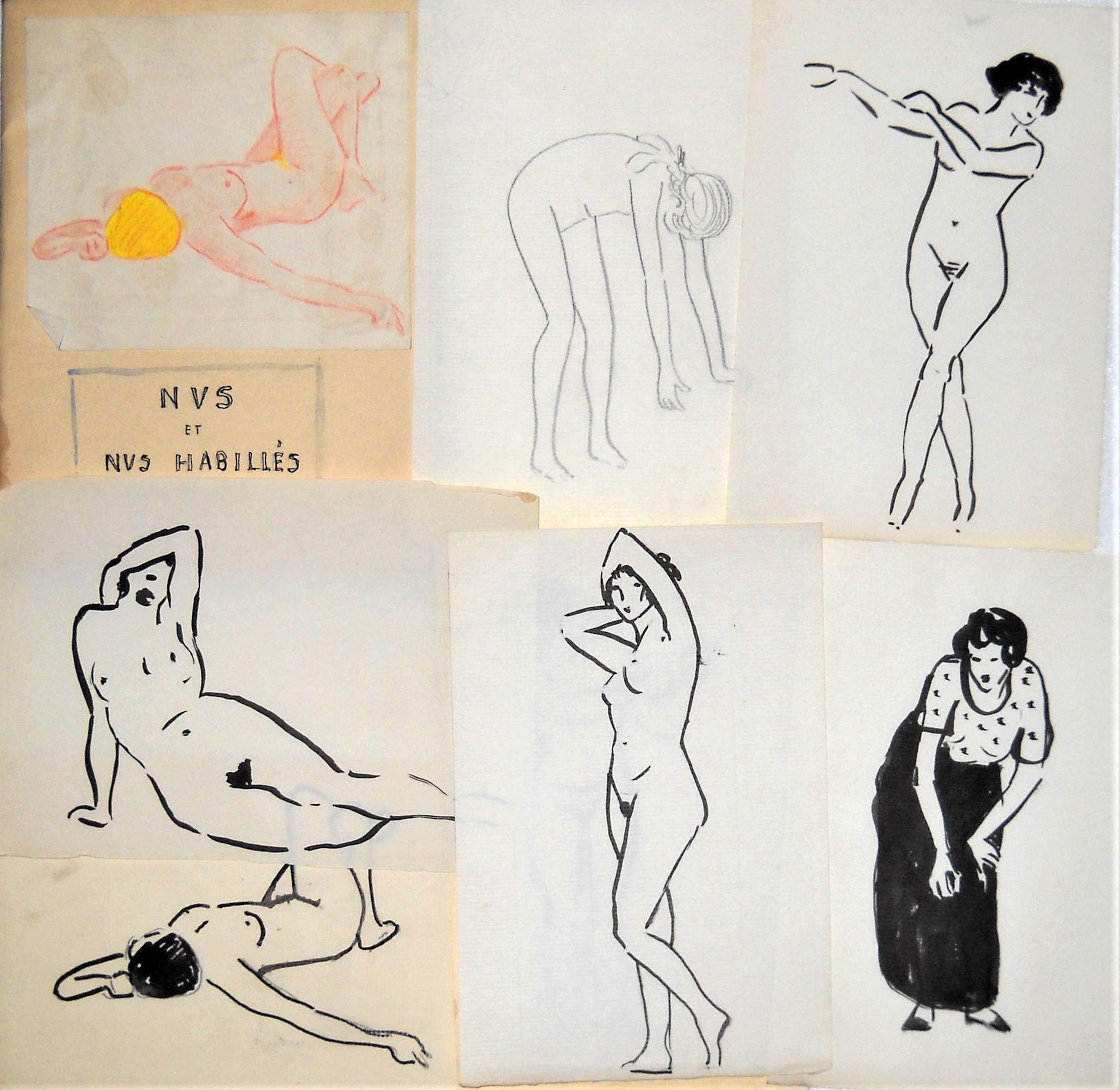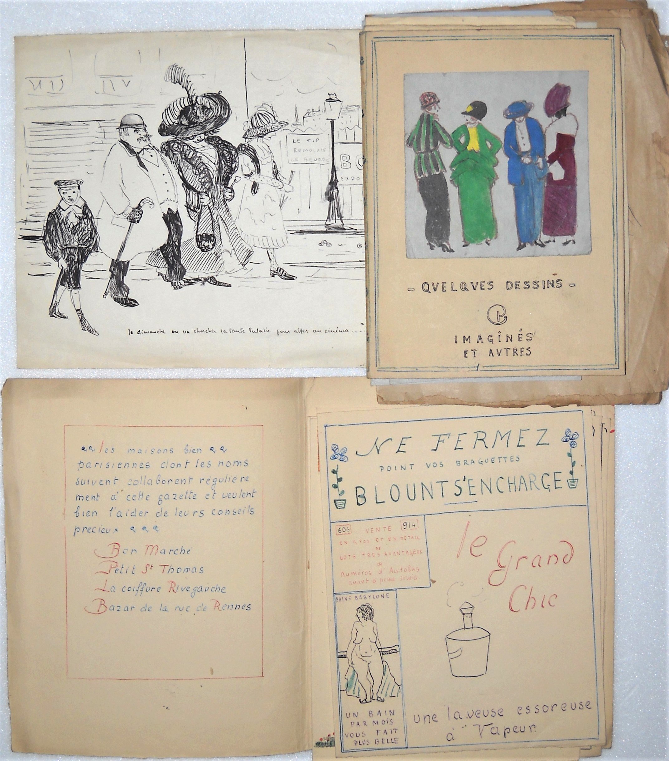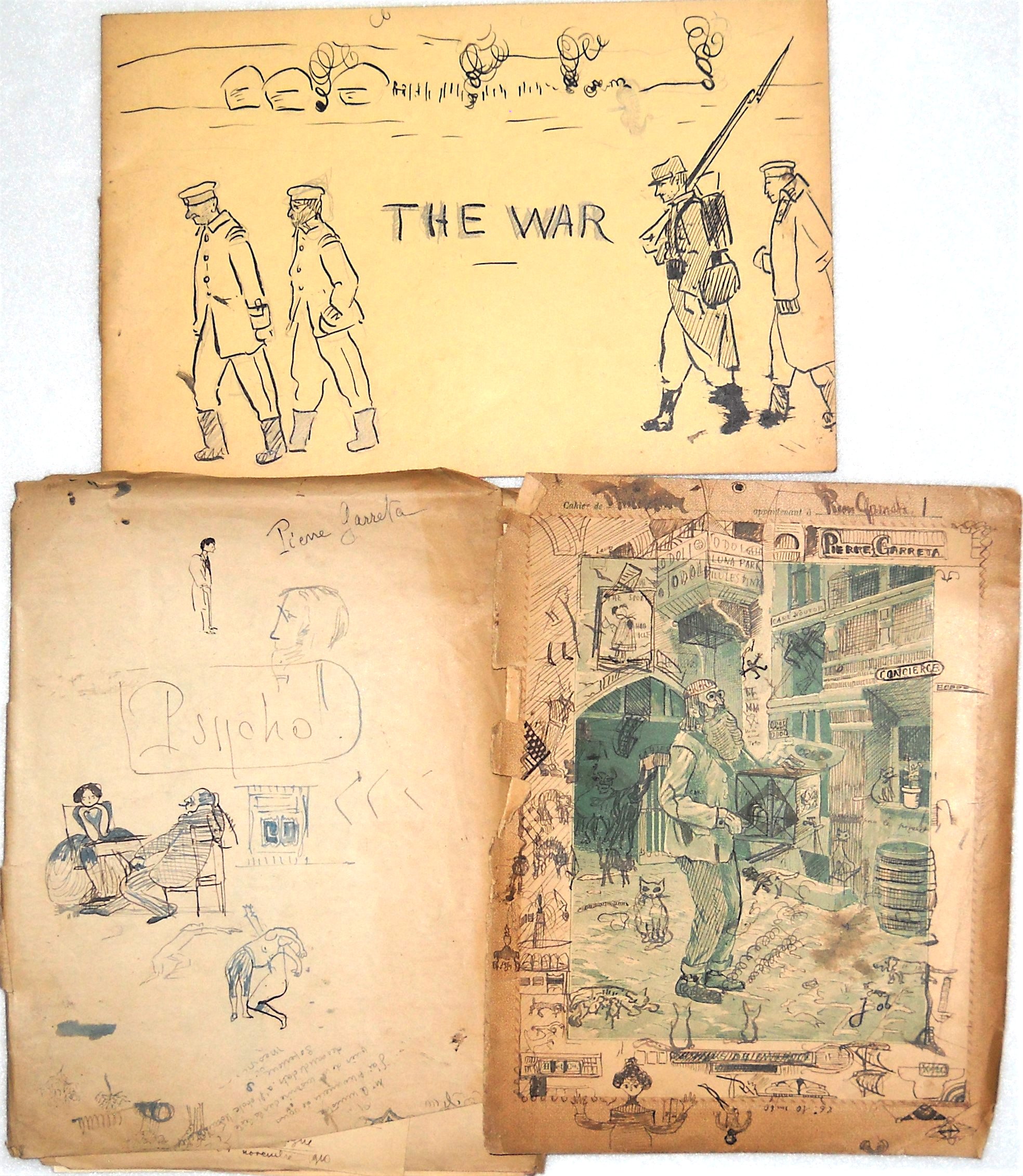 - Lot de + de 100 croquis et dessins au crayon, plume, certains rehaussés à laquarelle, réalisés par Pierre Garreta entre 1910 et 1914, rassemblées dans trois enveloppes destinées à être remises à R.M. en cas de disparition. Garreta portait un regard critique sur la société davant-guerre et une fascination pour le genre féminin dont « Gazette du Bon Ton, arts modes frivolités » ; « Pèlerinage à laumône » ; « Nus et nus habillés » ; 2 carnets de croquis dessinés lors de sa mobilisation en 1914 ; portrait au crayon de R.M., 11 février 1911 ; etc ;