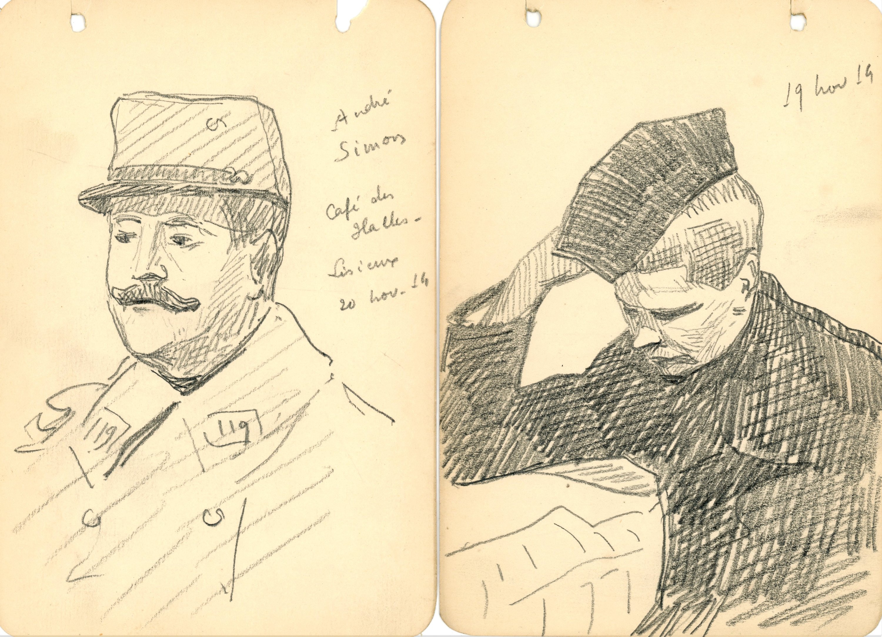 - 10 croquis au crayon par R.M. lors de sa visite à Lisieux en novembre 1914 (portraits de Pierre Garreta, André Simon, vue de Lisieux.) ;