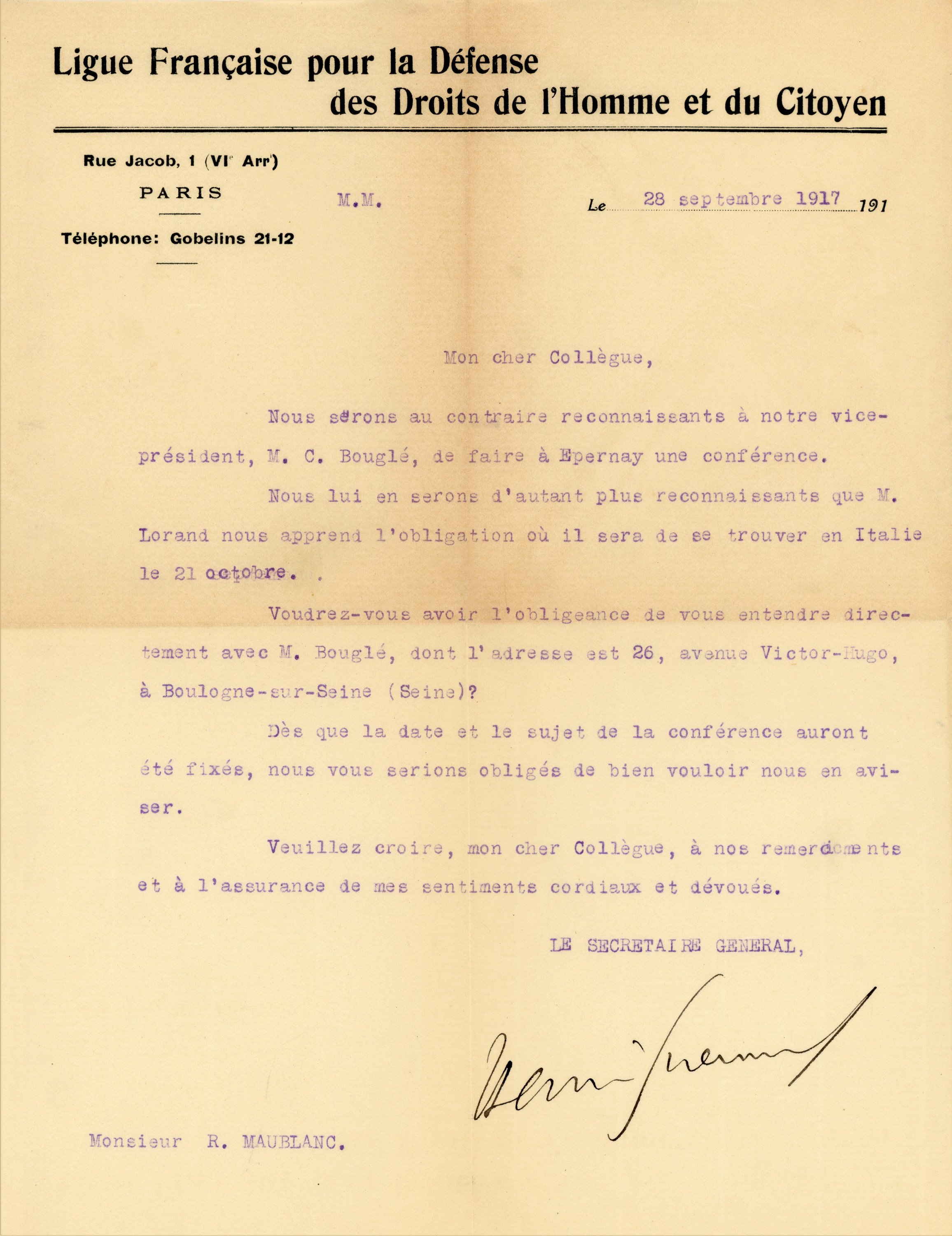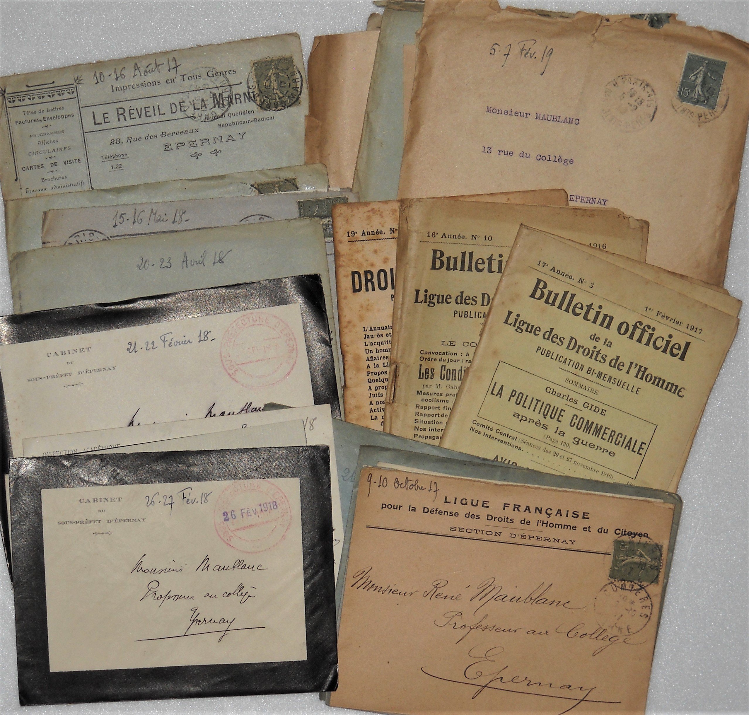 - Correspondance adressée à Renée Maublanc : L.A.S. Ferdinand BUISSON (1841-1932), philosophe, cofondateur et président de la Ligue ; 5 L.S. Henri GUERNUT (1876-1943), avocat et secrétaire général de la Ligue ; L.A.S. Oscar BLOCH (1877-1937), agrégé de grammaire ; 2 L.A.S. et 3 P.A.S. Émile DEL, instituteur à Épernay, correspondant du journal «Le Réveil de la Marne» et délégué de la Ligue des Droits de l'Homme ; 3 L.A.S. d'un membre de la section d'Epernay, dont récit de l'incident au meeting de la Bellevilloise, adhésion de R.M. au parti communiste ;