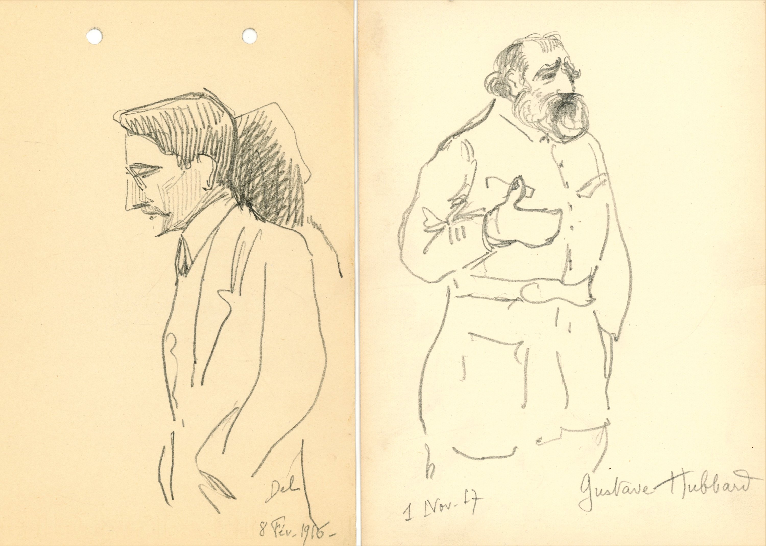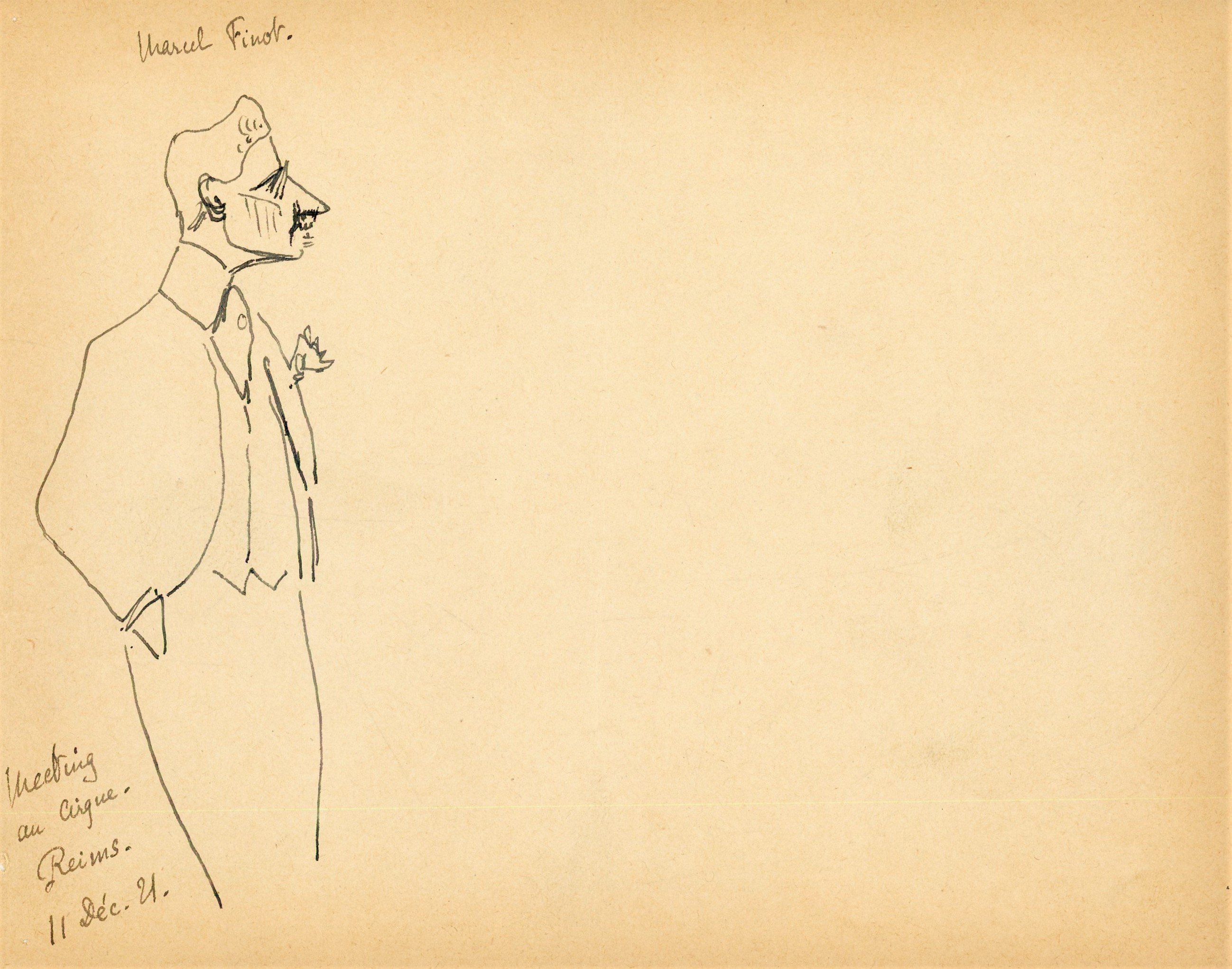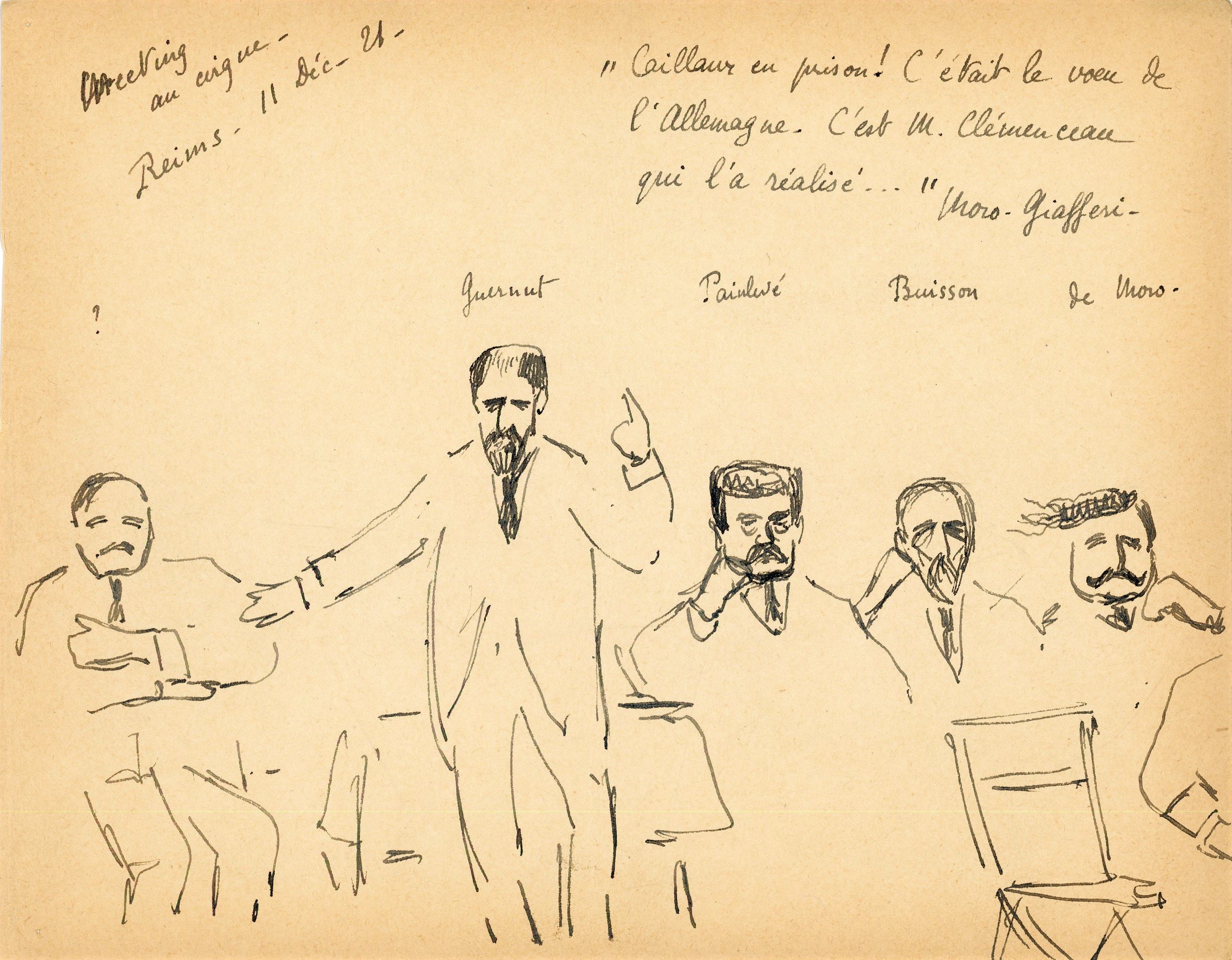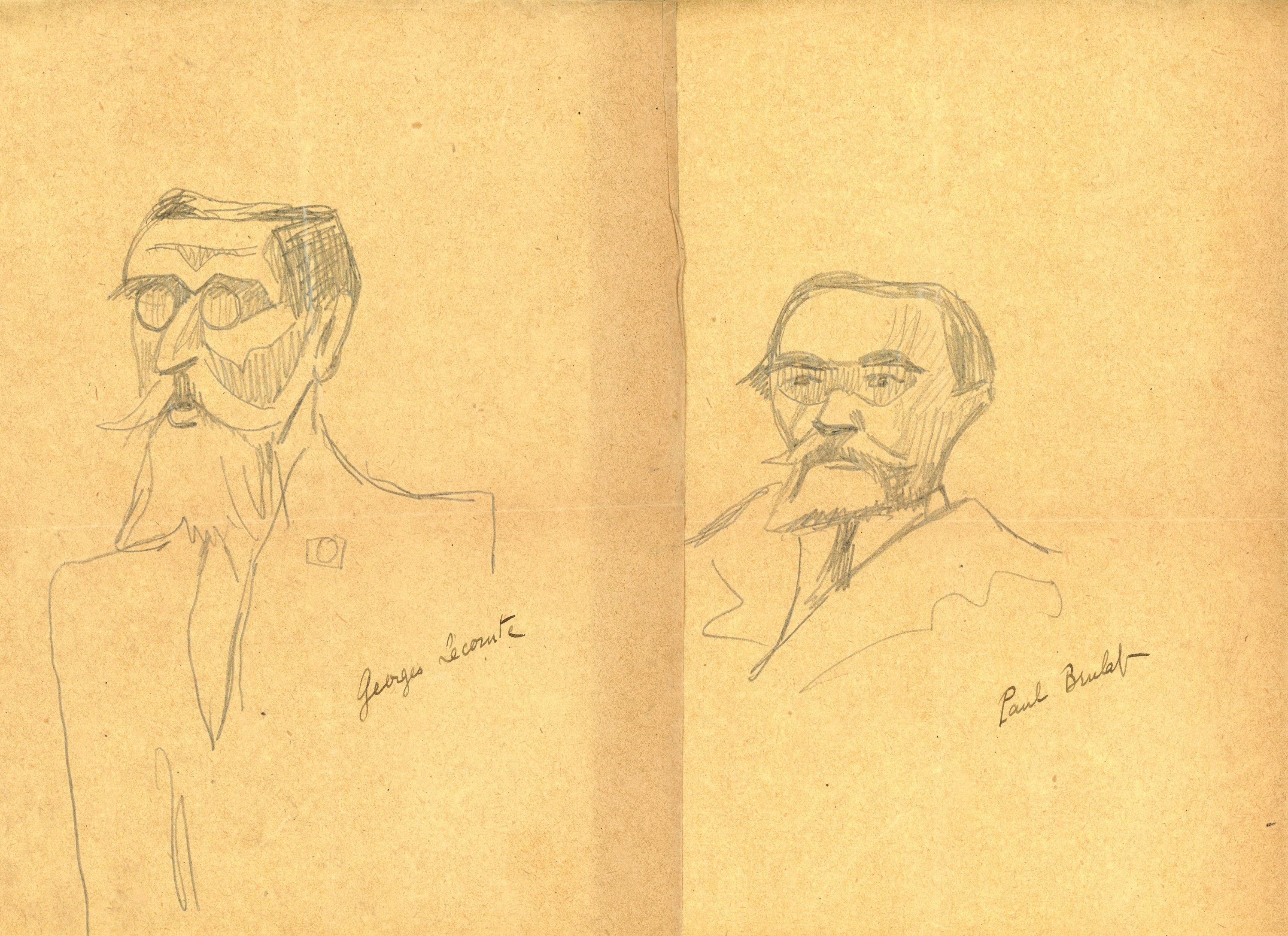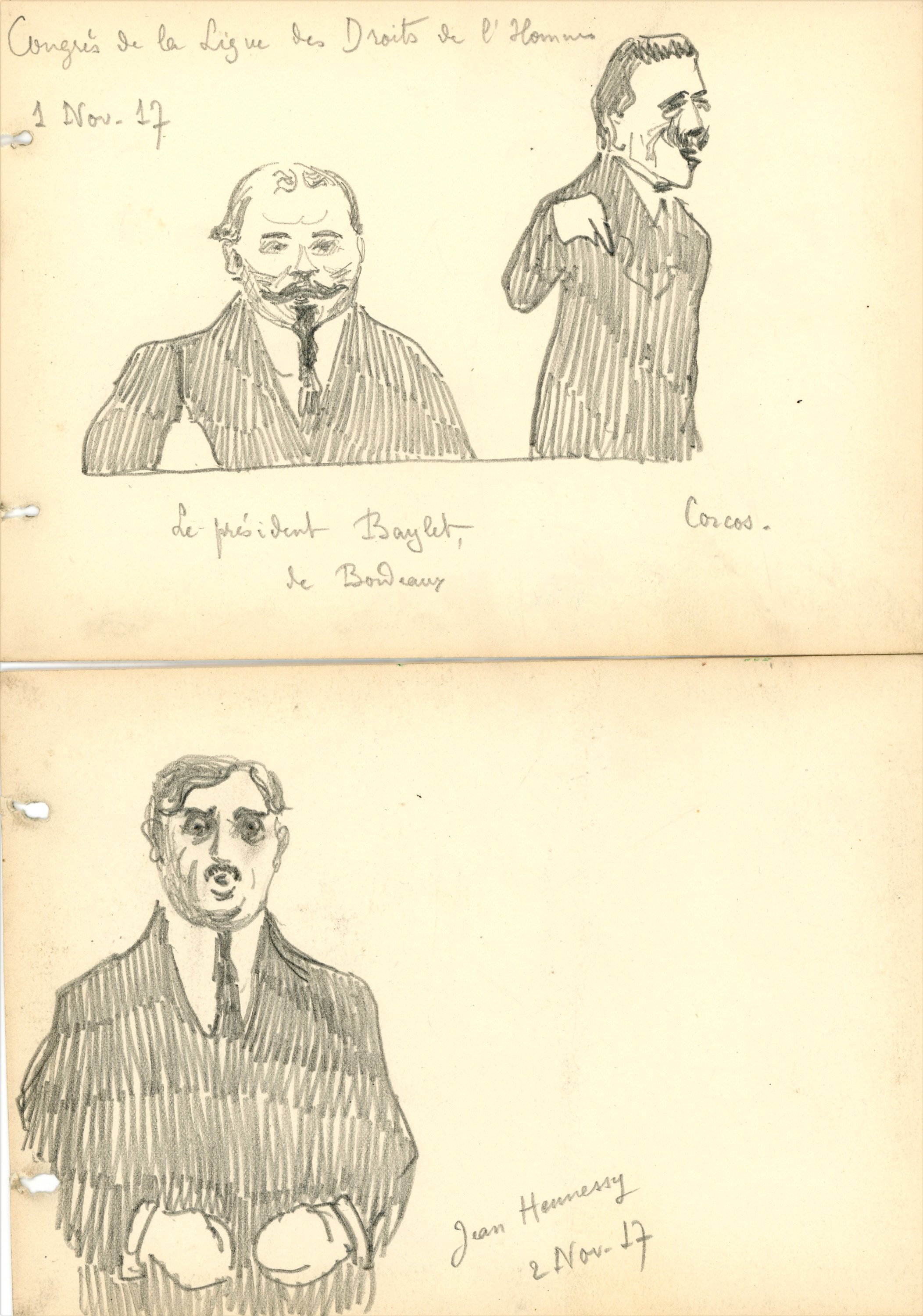 - 19 croquis au crayon par R.M. de portraits de membres de la Ligue des Droits de l'Homme : Ferdinand Buisson, Henri Guernut, Victor Basch, Georges Lorand, Émile Del, Anatole France, meeting au cirque de Reims le 11 décembre 1921, Paul Brulat, Georges Lecomte, etc.