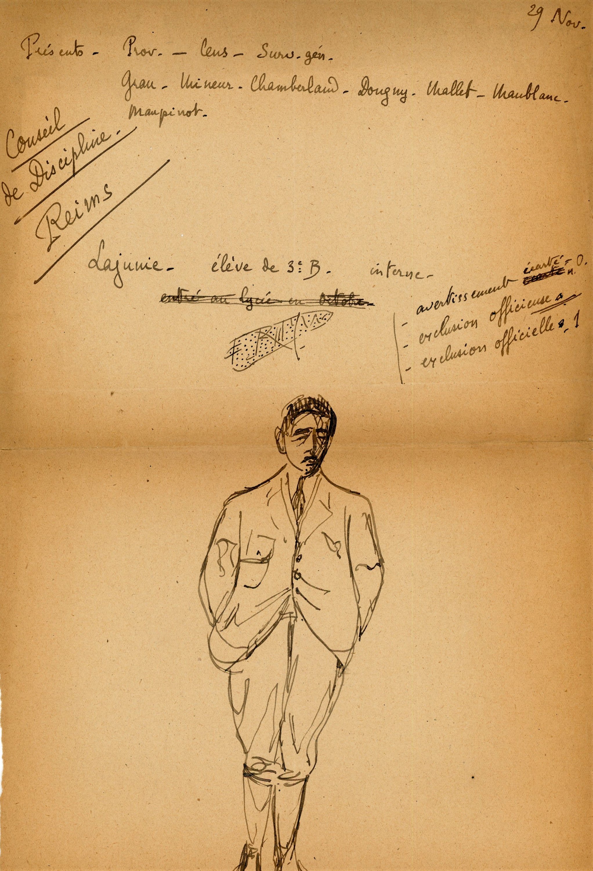 - Petit dossier titré « Souvenirs universitaires » contenant notamment listes des noms et emplacement des élèves de chaque classe, tableaux de notes, conseil de discipline du 5 juillet 1922 votant pour lexclusion dun élève, etc ;