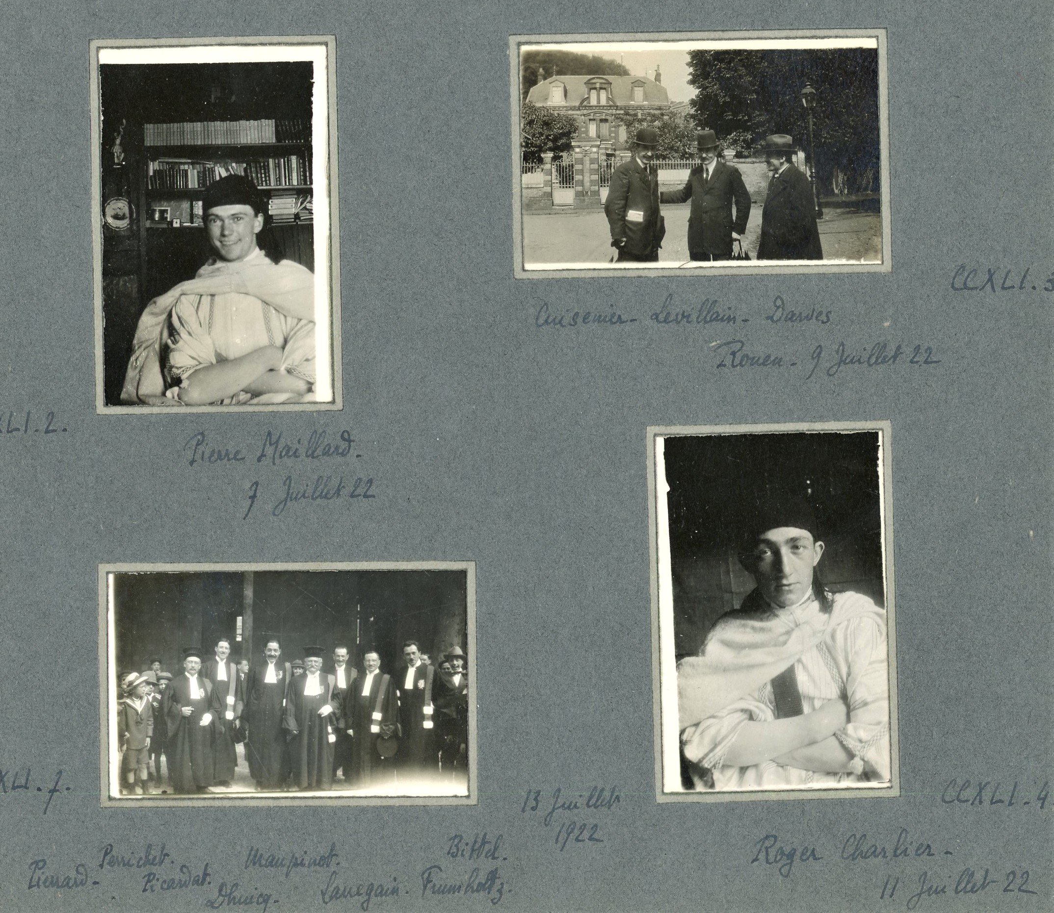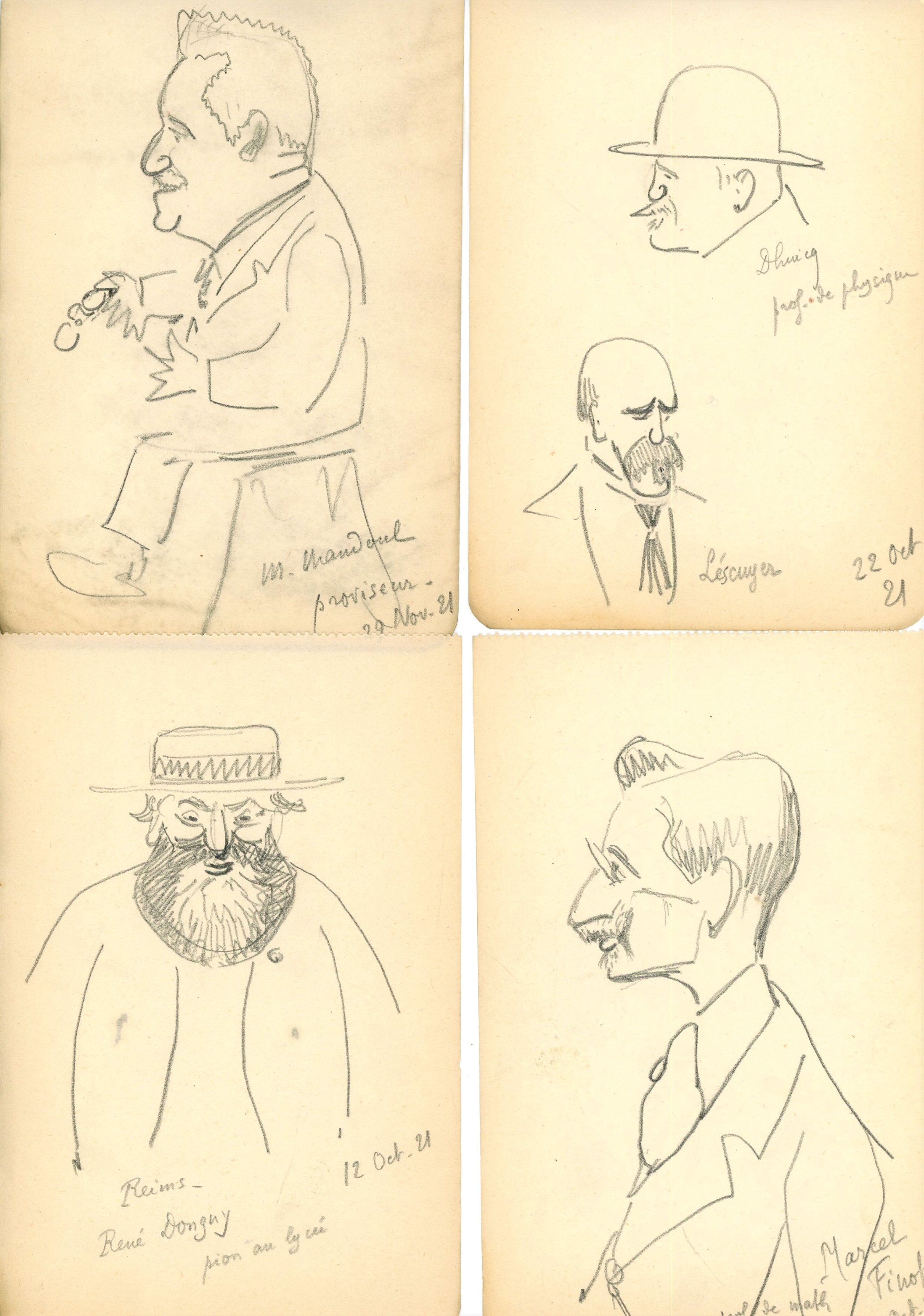 - Réunion de + de 170 photographies prises par R.M. et autres, dont Marcel Déat en tenue officielle, distribution des prix du 13 juillet 1922, fête de Molière en janvier 1922, la classe de rhétorique de 1923-1924, portraits de Georges Bourgarel, Jean Hiblot, André Bocquet, etc, photo de groupe datée du 5 octobre 1925 prise à Reims où apparaît au premier plan assis à droite Roger Lecomte et se tient debout en arrière R.M. ;