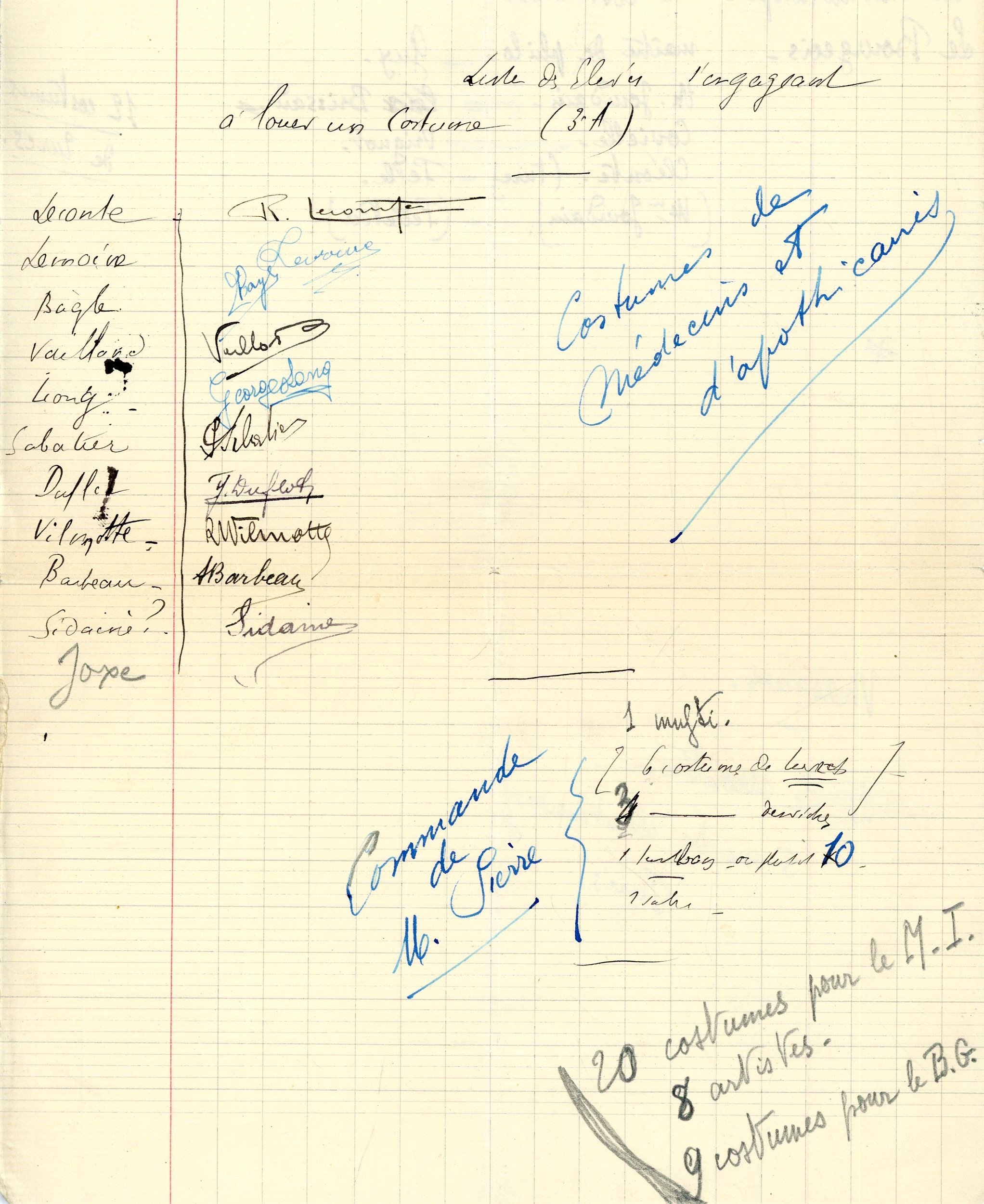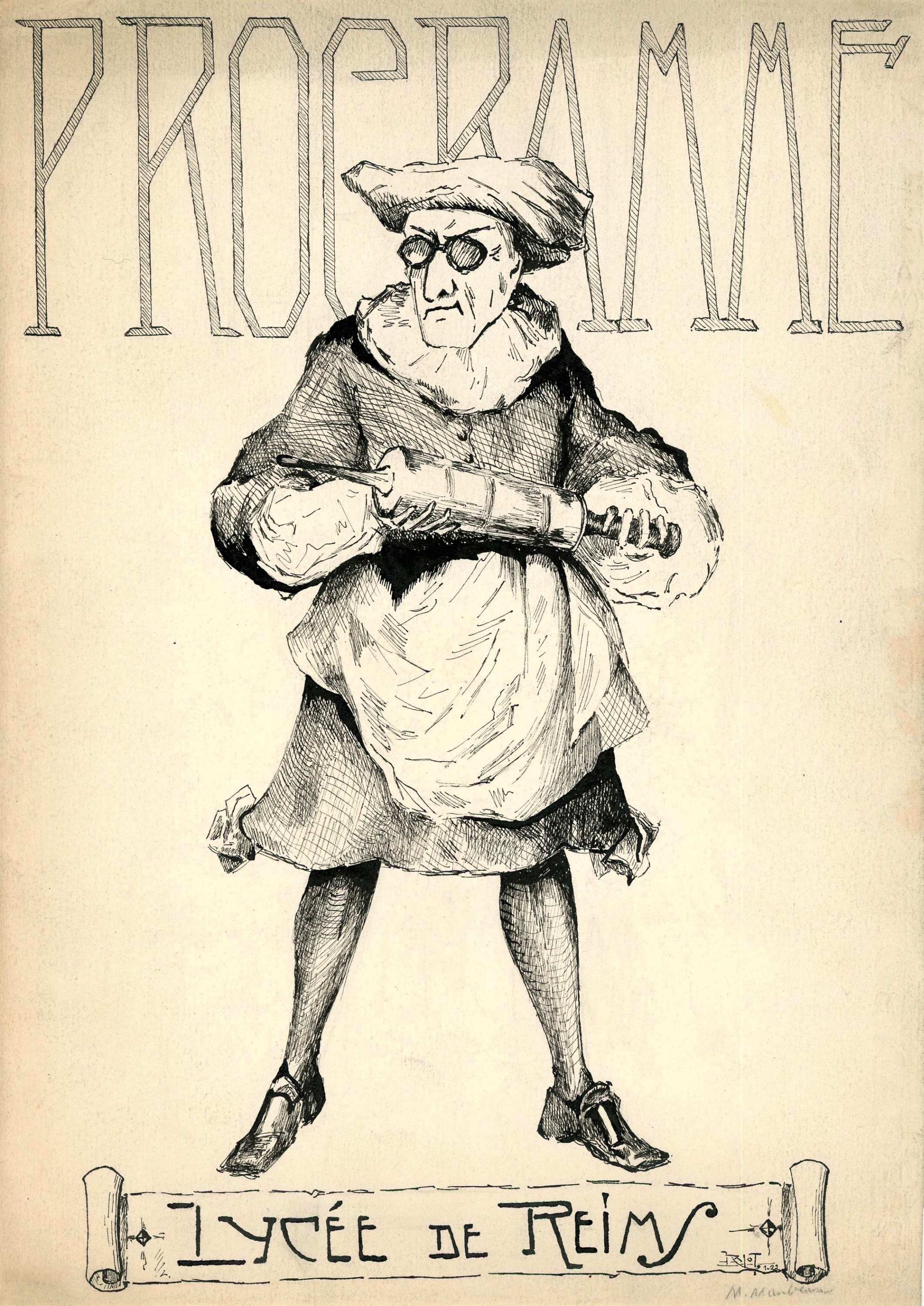 - Célébration du tricentenaire de Molière, 19 janvier 1922 : programme illustré en couverture par une caricature de R.M. en médecin apothicaire, croquis des costumes, listes des costumes empruntés par les élèves avec leurs signatures dont celles de Roger Lecomte et Roger Vailland ;