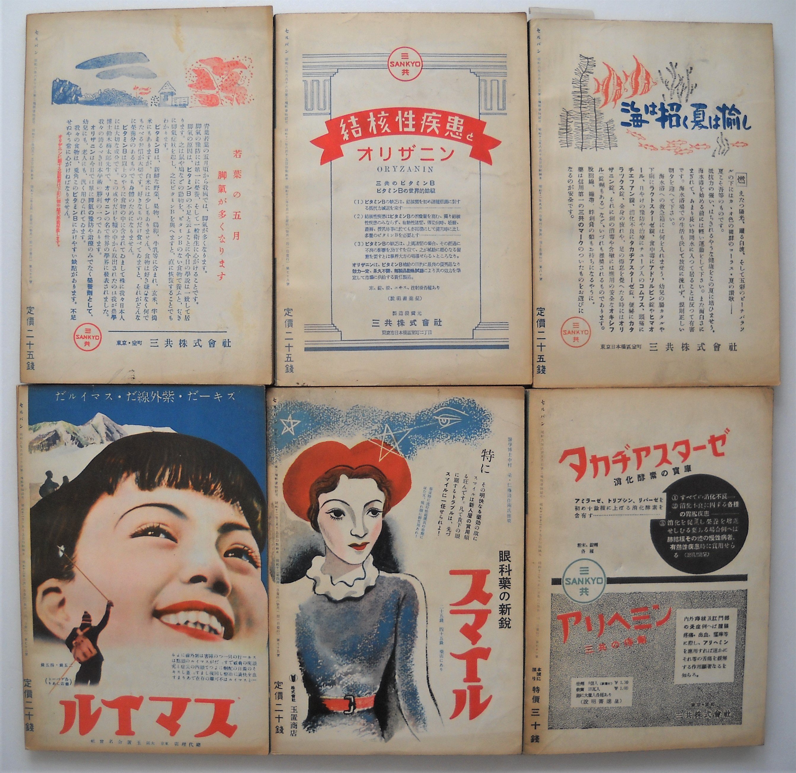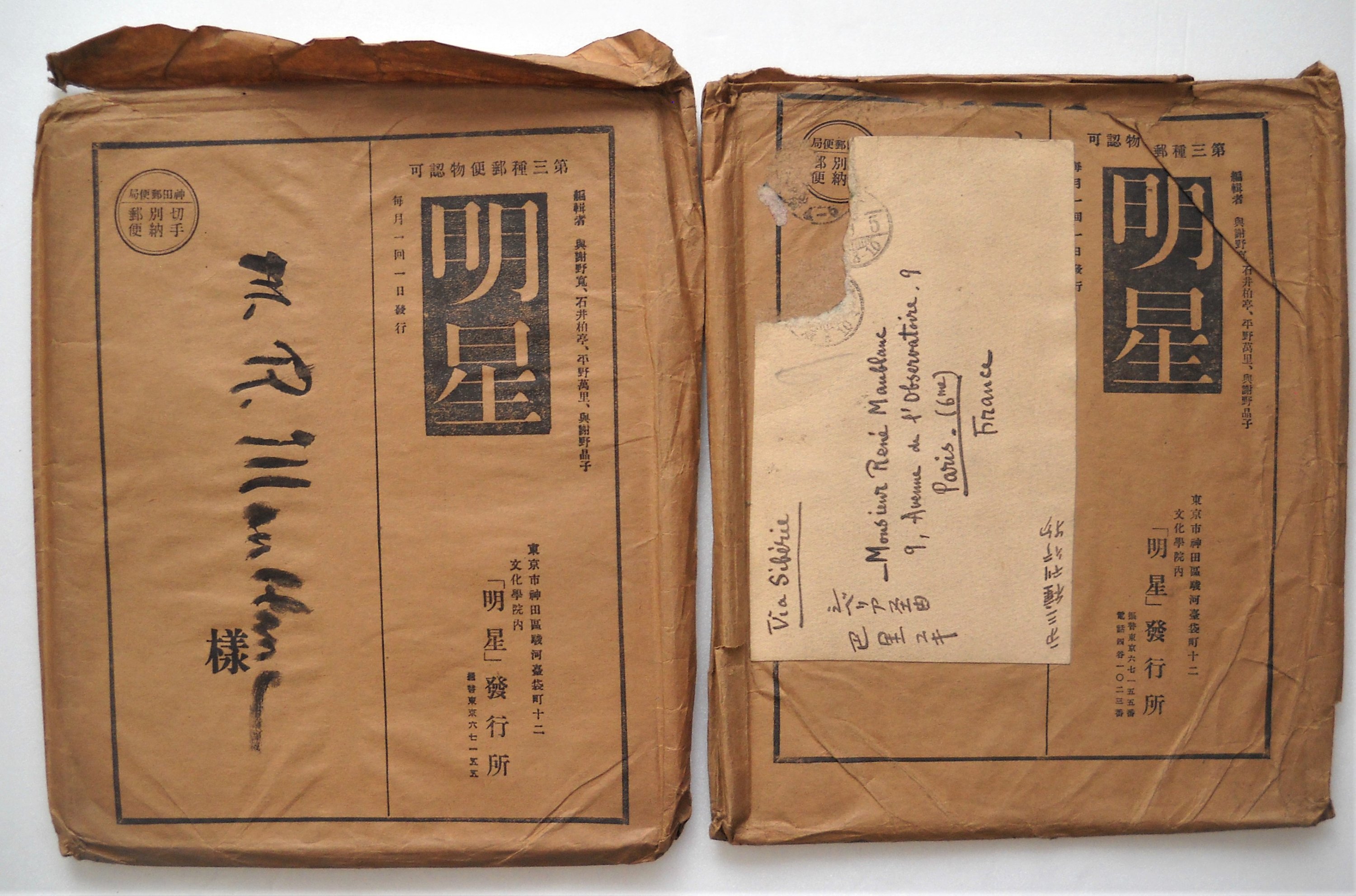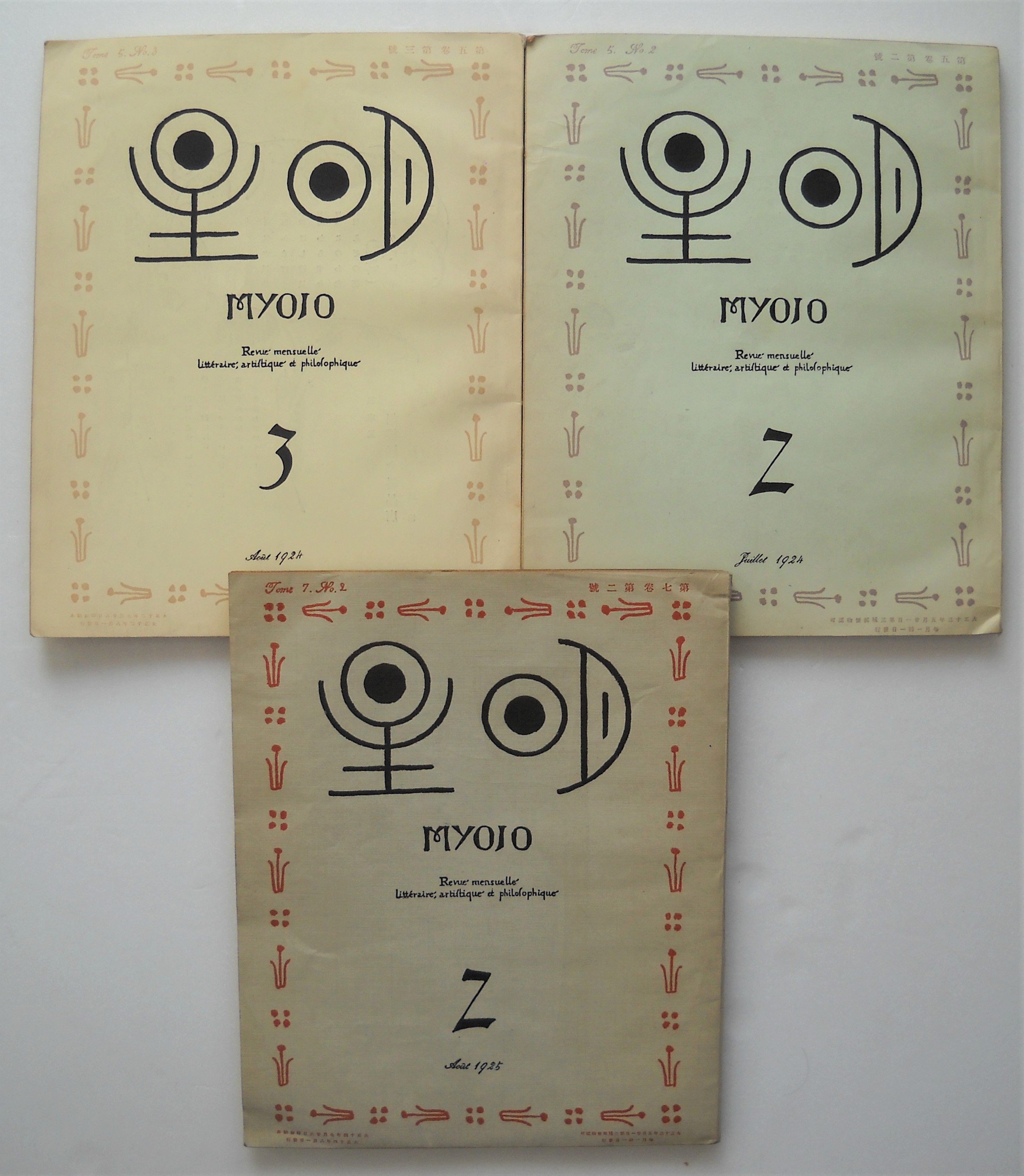 3 numéros de la revue mensuelle de poésie japonaise «MYOJO», de juillet et août 1924, et août 1925, avec enveloppes d’envoi.