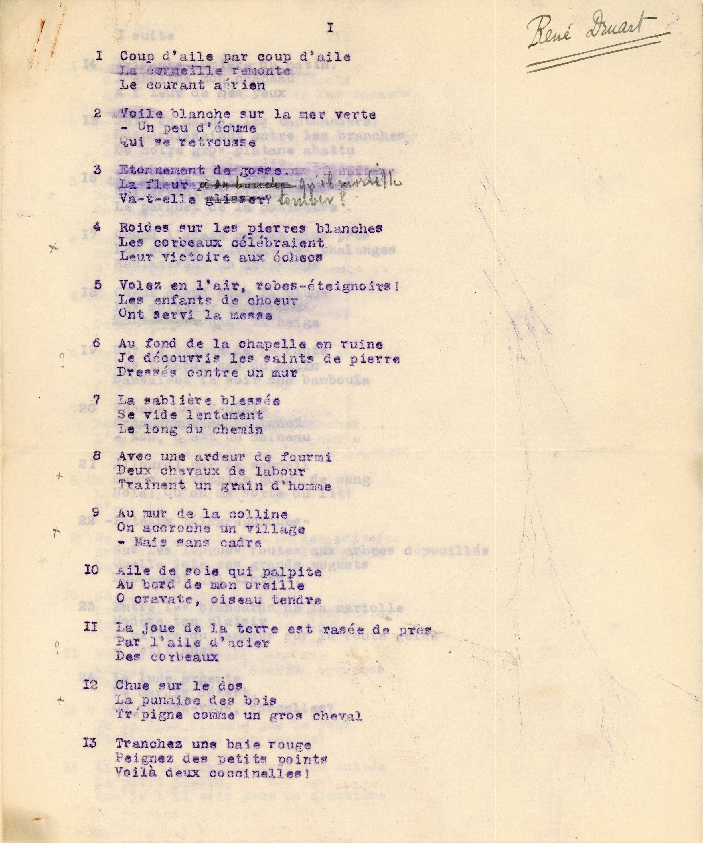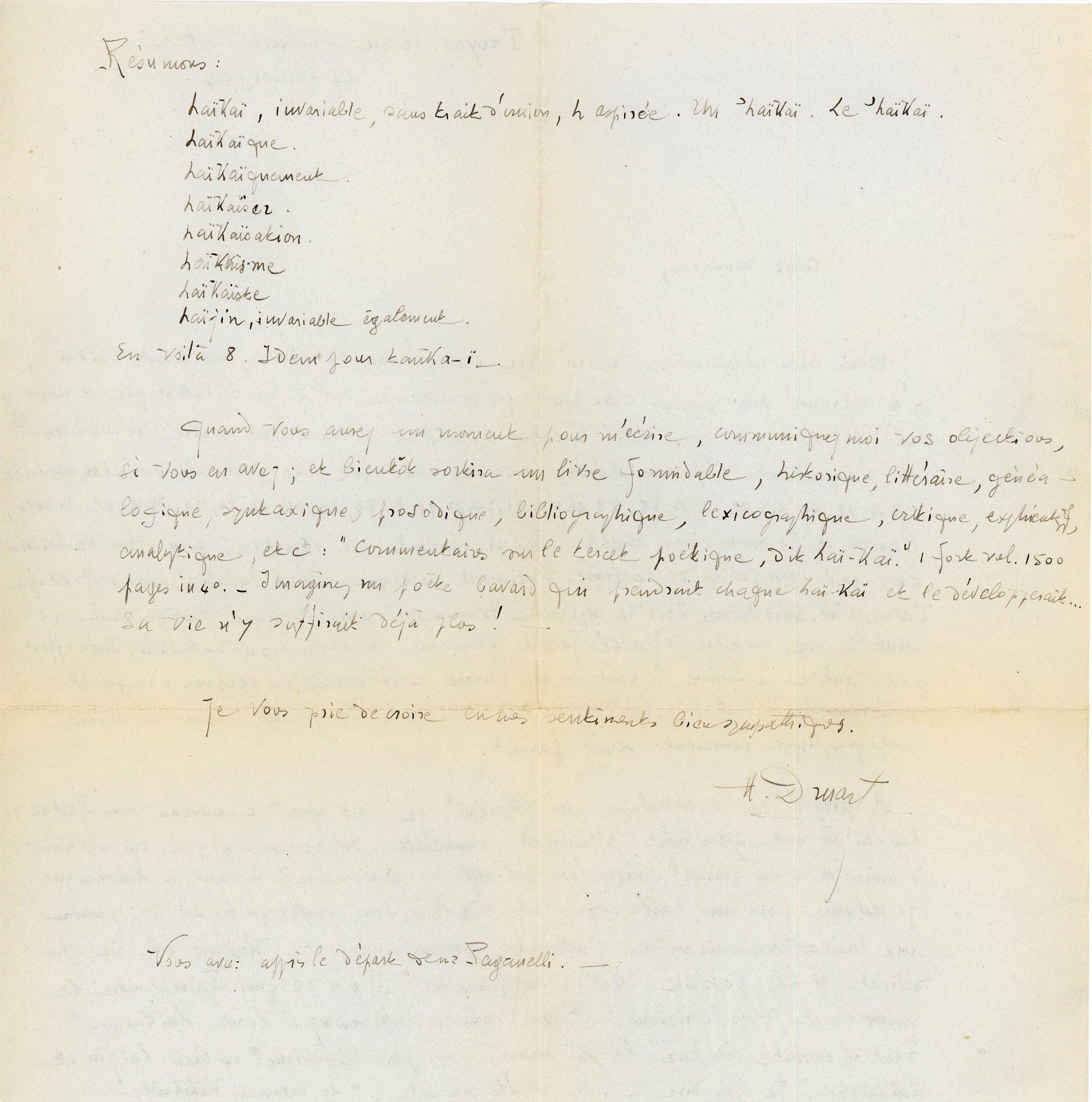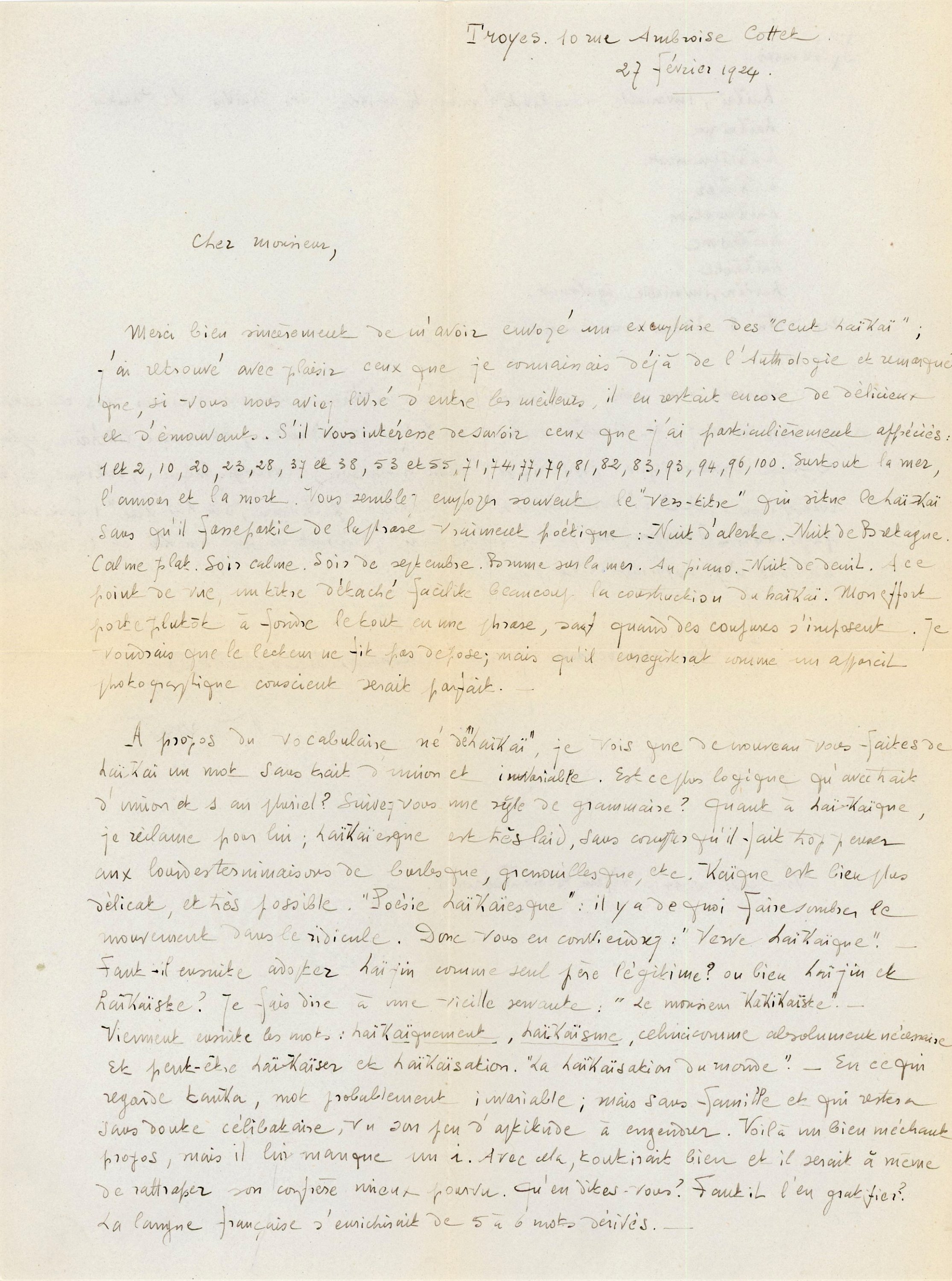 Lot de 40 pièces, dont :- 26 L.A.S., 4 L.S., 3 P.A.S., et 2 faireparts, avec enveloppes, 1922-1932, y relatant premières parutions des poésies de Roger Gilbert-Lecomte et de Roger Vailland ;- Tapuscrit de 15 pages in-4 de haïkaï composés par René Druart ; - « Grattements sur Trois cordes », 24 séries de 285 haï-kaï et 3 tankas, composés par Henri Druart, 1922-1924, 40 pages in-4 dactylographiées ;- 7 pages manuscrites de haïkaï composés par Henri Druart en 1921-1922 ;- Brouillon manuscrit « Deux vrais jeunes » par René Maublanc, 1 page ½ in-4, et publié dans la revue du Pampre en introduction des deux poèmes de Roger Lecomte et Roger Vailland ;- Coupure de presse de la Dépêche du Nord-Est du 4 mai 1922 sur le mouvement littéraire « Le Pampre ».PLUS DE DESCRIPTIONS DANS LE CATALOGUE DE LA VENTE SUR ROUILLAC.COM SOUS LONGLET /CONSULTER LES DETAILS DE LA VENTE/