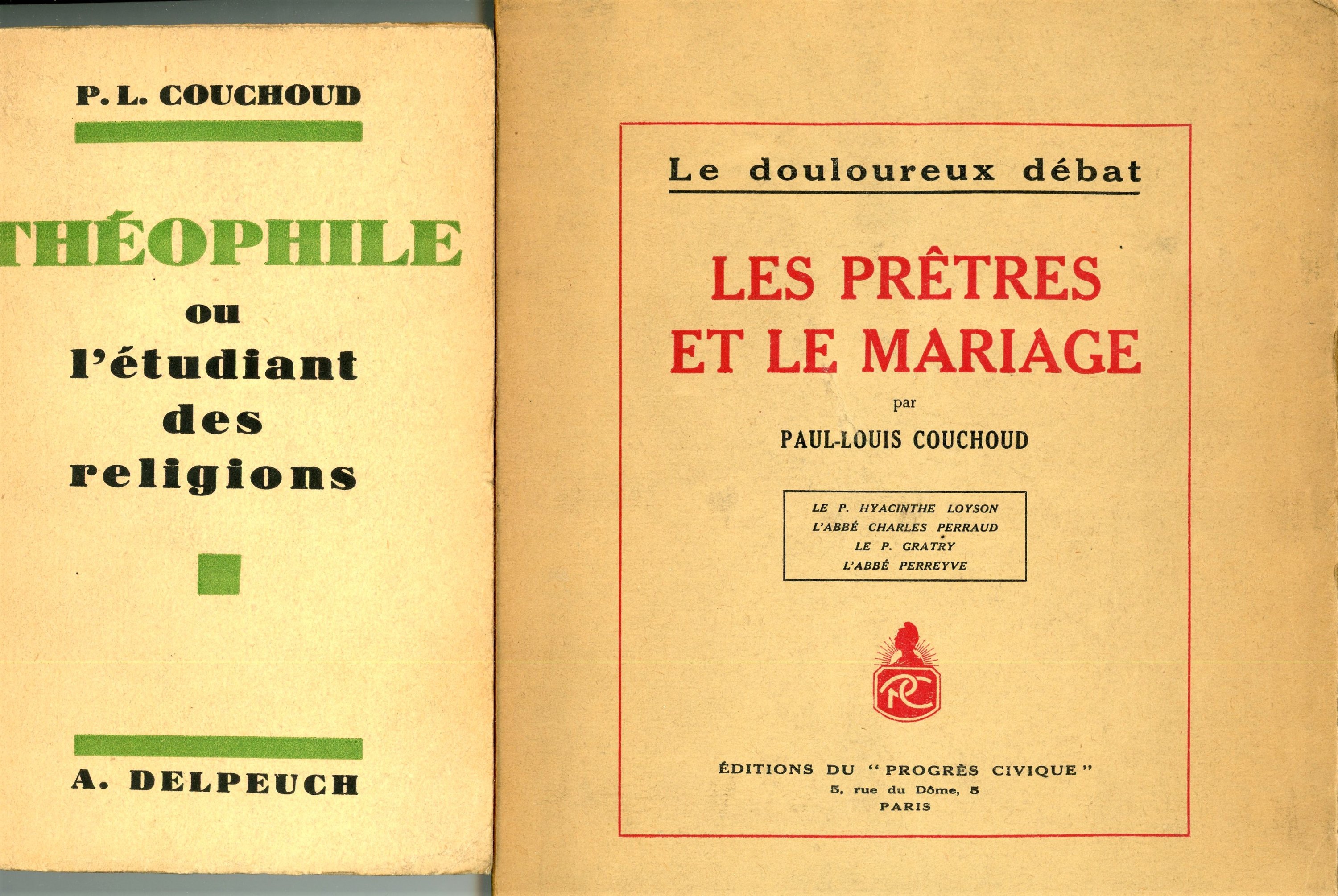 - 5 publications ou articles écrits par P.L. Couchoud : « Le rajeunissement est-il possible ? », Le Progrès civique, 16 novembre 1924 ; « Au collège de France, Alfred Loisy », Le journal littéraire, n°46, 7 mars 1925 ; Le douloureux débat, les prêtres et le mariage, Editions du Progrès civique, 1927, br. in-4, 59 pages, envoi autographe signé et daté ; Théophile ou létudiant des religions, A. Delpeuch, 1929, br. in-8, 235 pages, envoi autographe signé et daté. ; « Les cinq évangiles », Les cahiers rationalistes, n°10, janvier 1932, envoi autographe signé ;