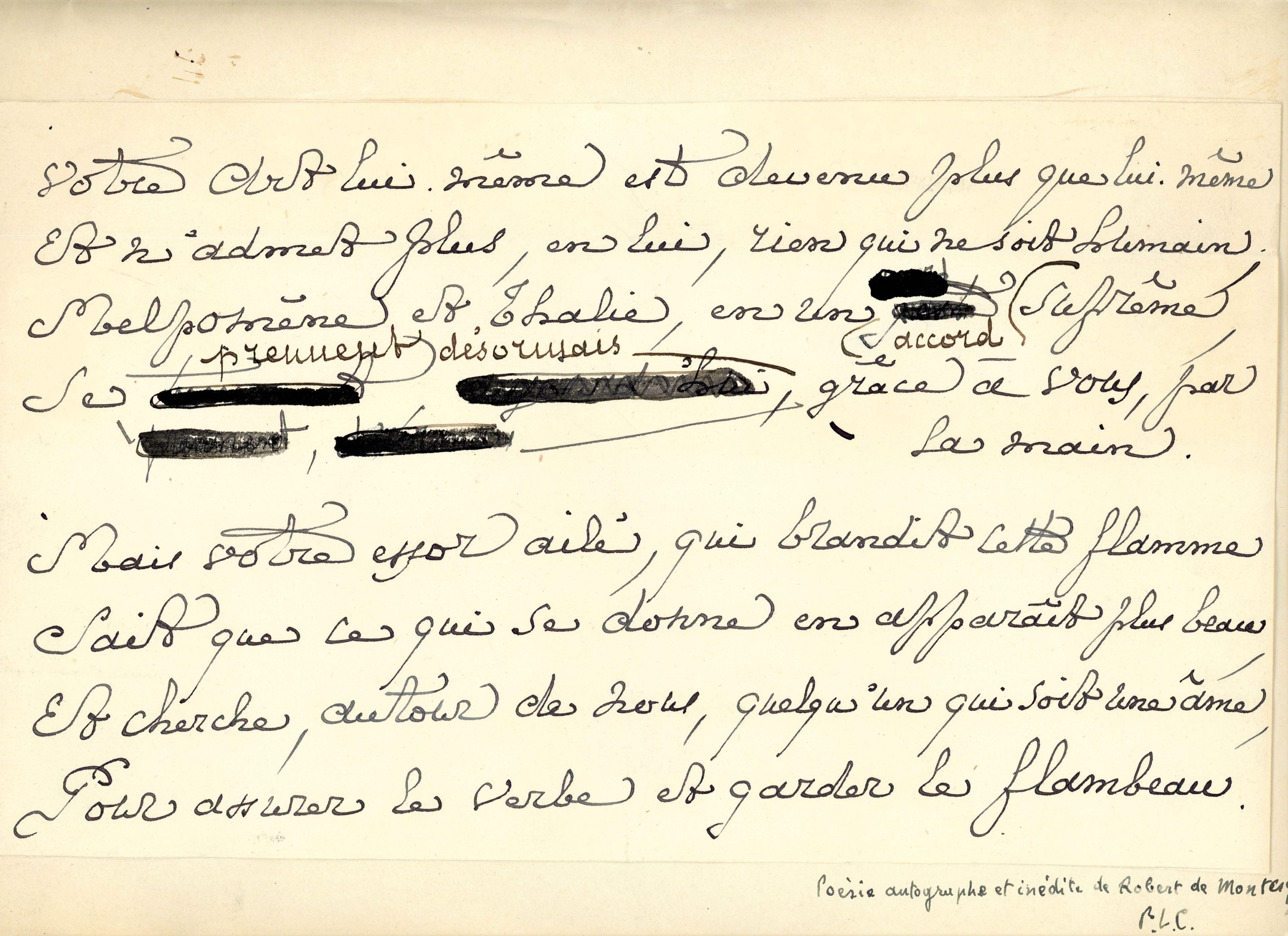 - « A Sarah Bernhardt », poème autographe de Robert de MONTESQUIOU, ami de Couchoud, avec mention manuscrite et signée de P.L. Couchoud « Poésie autographe inédite de Robert de Montesquiou ».