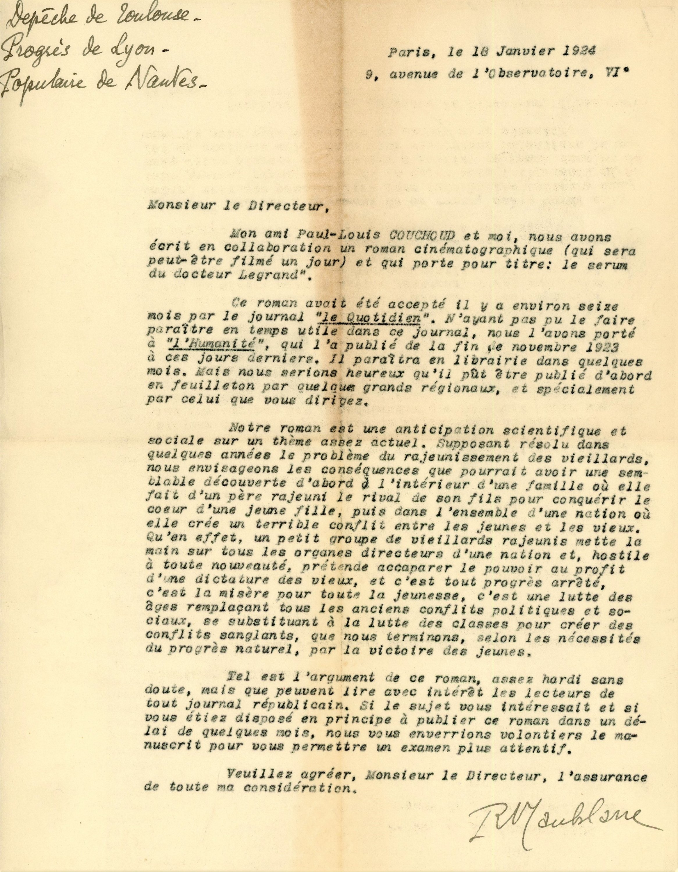 - « Le Sérum du Docteur Legrand », roman cinégraphique, paru dans LHumanité : 2 brouillons manuscrits intitulés « Jouvence », 186 et 110 pages in-4 ; Brouillon manuscrit intitulé « Le sérum du Docteur Legrand », 287 pages in-4 ; Brouillon manuscrit du pitch, 16 pages in-4 + 2 tapuscrits, 15 pages in-4 ; Brouillon manuscrit du script, 71 pages in-4 ; Pitch intitulé « Place aux vieux ! », 3 avril 1923, 7 pages in-4 ; 5 exemplaires du tiré à part du chapitre 1er paru dans LHumanité Coupures de presse de LHumanité, etc ;